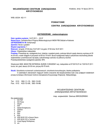 WOJEWÓDZKIE CENTRUM ZARZĄDZANIA KRYZYSOWEGO Kraków, dnia 14 lipca 2011r. WB.I.6334 -62-11 POWIATOWE CENTRA ZARZĄDZANIA KRYZYSOWEGO OSTRZEŻENIE meteorologiczne Data i godzina wydania: 14.07.2011 – 22.37 Nazwa biura: Centralne Biuro Prognoz Meteorologicznych IMGW PIB Oddział w Krakowie OSTRZEŻENIE Nr 56: kontynuacja Zjawisko: Burze z gradem Stopień zagrożenia: 1 Ważność: od godz. 07:00 dnia 15.07.2011 do godz. 07:00 dnia 16.07.2011 Obszar: Województwo małopolskie Przebieg: Przewiduje się wystąpienie burz, lokalnie z opadami gradu, podczas których opady deszczu wyniosą od 20 do 30 mm, a wiatr osiągnie w porywach od 60 do 70 km/h. Burze występować będą w południowo-wschodniej połowie województwa i przemieszczać się będą z południowego zachodu na północny wschód. Prawdopodobieństwo wystąpienia zjawiska: 90% Wiadomość SMS: IMGW PIB OSTRZEGA: BURZE Z GRADEM/1 woj. małopolskie od 07:00/15.07 do 7:00/16.07.2011 burze, lok. grad, deszcz 20-30 mm, porywy 60-70 km/h. Skutki: Utrudnienia na terenach zurbanizowanych; utrudnienia komunikacyjne, lokalne podtopienia. O zaistniałych zdarzeniach mających istotne znaczenie dla bezpieczeństwa ludzi oraz podjętych działaniach proszę na bieżąco informować Centrum Zarządzania Kryzysowego Wojewody Małopolskiego. Tel. 012: 392-11-15, 392-13-00 Fax. 012: 422-72-08, 392-19-98. WOJEWÓDZKIE CENTRUM ZARZĄDZANIA KRYZYSOWEGO insp. wojewódzki Dariusz BRODZIŃSKI Do wiadomości: 1. KW PSP 2. KW Policji 3. WSzW 4. PKP 5. Zakład Energetyczny 6. GDDKiA 7. ZDW 8. PKS 9. RDA 10. WZK MUW O/Z w Nowym Sączu 11. WZK MUW O/Z w Tarnowie 12. Urząd Żeglugi Śródlądowej 13. a/a