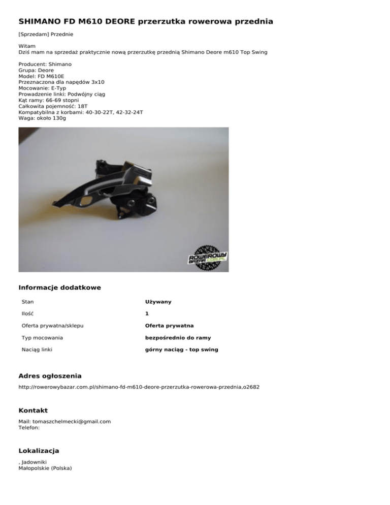 SHIMANO FD M610 DEORE przerzutka rowerowa przednia [Sprzedam] Przednie Witam Dziś mam na sprzedaż praktycznie nową przerzutkę przednią Shimano Deore m610 Top Swing Producent: Shimano Grupa: Deore Model: FD M610E Przeznaczona dla napędów 3x10 Mocowanie: E-Typ Prowadzenie linki: Podwójny ciąg Kąt ramy: 66-69 stopni Całkowita pojemność: 18T Kompatybilna z korbami: 40-30-22T, 42-32-24T Waga: około 130g Informacje dodatkowe Stan Używany Ilość 1 Oferta prywatna/sklepu Oferta prywatna Typ mocowania bezpośrednio do ramy Naciąg linki górny naciąg - top swing Adres ogłoszenia http://rowerowybazar.com.pl/shimano-fd-m610-deore-przerzutka-rowerowa-przednia,o2682 Kontakt Mail: [email protected] Telefon: Lokalizacja , Jadowniki Małopolskie (Polska) Ogłoszenie dodano: 2015-10-11 13:01:22 Ogłoszenie wygasa: 2017-04-09 13:01:22 Powered by TCPDF (www.tcpdf.org)