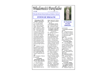 Nr 102 w w w .anin.parafia.info.pl Parafia M atki Bożej K rólow ej Polski w A ninie INTENCJE MSZALNE 28 sierpnia, 22 NIEDZIELA ZWYKŁA 700 – dz. za otrzymane łaski z prośbą o Boże błog. i zdrowie dla Zygmunta i Jadwigi Milewskich z okazji 51 r. ślubu 830 + Ludwik Henneberg 1000 – Aby dzięki otwarciu serc na miłość udało się położyć kres licznym wojnom i konfliktom na świecie i aby w mniej rozwiniętych regionach świata głoszenie Słowa Bożego odnowiło serca ludzi, zachęcając ich do bezpośredniego uczestniczenia w procesie prawdziwego postępu społecznego 1130 + Henryk w 5 r.śm., Bronisława (k), Danuta i Mariana Antosik, Piotr i Eugenia Radzio, Halina Rams; chrzest po Mszy św.: Natalia Melania Soczyńska, Natalia Owczarczyk 1800 + Stanisław i Marianna Parzyszek 29 sierpnia, poniedziałek; Męczeństwo św. Jana Chrzciciela, wspomnienie 700 – dz.-bł. z prośbą o zdrowie i wszystkie potrzebne łaski dla Ani i Marka Marchel oraz ich dzieci Agnieszki i Maćka 1800 + Stanisław Łubacki w 29 r.śm. 30 sierpnia, wtorek; 700 + Ludwik Pudłowski 1800 + Bronisław, Bronisława (k), Jan i ich rodzice 31 sierpnia, środa; Bł. Bronisławy, dziewicy, wspomnienie 700 + Bolesław Nowak w 18 r.śm. i zm. z cr. 1800 zbiorowa: - w intencji wynagradzającej Najświętszemu Sercu Pana Jezusa za grzechy całego świata; - o intronizację Najświętszego Serca Pana Jezusa w naszych sercach, rodzinach, parafii, ojczyźnie i całym świecie; - o bł. Boże dla Romana i Magdaleny w pracy oraz Jacka i Małgorzaty w ich wspólnym życiu; - dz.-bł. pp. Alicji i Krzysztofa w 31. r. ślubu z prośbą o Boże bł. dla całej Rodziny; - dz. z okazji imienin Sabiny Witeckiej z prośbą o zdrowie i bł. Boże dla niej i całej Rodziny; + Wiktor Kacprzak w 20 r.śm., Marta i Władysław Jabłonka, cr. Jabłonka i Kacprzak; + Marek Sobieraj; + Bogdan Badziński i Krystyna Badzińska w 1 r.śm.; + Bronisław Ges z 22 Niedziela Zwykła 28.08.2011 racji imienin; 1 września, czwartek; 700 RM 800 – o błogosławieństwo Boże dla dzieci i młodzieży, nauczycieli i rodziców na rozpoczęcie Roku Szkolnego 1800 – w int. wszystkich ofiar i zmarłych w czasie II Wojny Światowej 2 września, piątek; 700 – w int. poległych w czasie II Wojny Światowej, ofiar Katastrofy Smoleńskiej oraz ojczyzny i o umocnienie w wierze polskich rodzin 800 + Stefania, Stefania, Stefania i Bronisława (k) 1630 wolna 1800 zbiorowa za zmarłych: + Jan Góralczyk w 7 r.śm., Edward, Anna i Elżbieta; + Janina Simon w 1 r.śm.; + Stefania, Jan i Zdzisław Karcz, Janina i Michał Misztal; 3 września, sobota; Św. Grzegorza Wielkiego, papieża i doktora Kościoła, wspomnienie 700 + Mateusz Cyngot w 4. Liturgia Słowa Bożego Jr 20,7-9 Ciebie, mój Boże, pragnie moja dusza Rz 12,1-2 Mt 16,21-27 Jezus zaczął wskazywać swoim uczniom na to, że musi iść do Jerozolimy i wiele cierpieć od starszych i arcykapłanów, i uczonych w Piśmie; że będzie zabity i trzeciego dnia zmartwychwstanie. A Piotr wziął Go na bok i począł robić Mu wyrzuty: Panie, niech Cię Bóg broni! Nie przyjdzie to nigdy na Ciebie. Lecz On odwrócił się i rzekł do Piotra: Zejdź Mi z oczu, szatanie! Jesteś Mi zawadą, bo nie myślisz o tym, co Boże, ale o tym, co ludzkie. Wtedy Jezus rzekł do swoich uczniów: Jeśli kto chce pójść za Mną, niech się zaprze samego siebie, niech weźmie krzyż swój i niech Mnie naśladuje. Bo kto chce zachować swoje życie, straci je; a kto straci swe życie z mego powodu, znajdzie je. Cóż bowiem za korzyść odniesie człowiek, choćby cały świat zyskał, a na swej duszy szkodę poniósł? Albo co da człowiek w zamian za swoją duszę? Albowiem Syn Człowieczy przyjdzie w chwale Ojca swego razem z aniołami swoimi, i wtedy odda każdemu według jego postępowania. Ogłoszenia na 22 Niedzielę Zwykłą 28.08.2011 r. • 27 sierpnia o godz. 10 z Placu Marszałka Józefa Piłsudskiego wystartował XI Międzynarodowy Motocyklowy Rajd Katyński. Ponad 100 motocykli wyruszyło na dwutygodniową trasę odwiedzając m.in. Lwów, Hutę Pieniacką, Tarnopol, Buczacz, Jazłowiec, Okopy Św. Trójcy, Chocim, Kamieniec Podolski, Bar, Brahiłów, Winnicę, Berdyczów, Żytomierz, Kijów, Briańsk, Kozielsk, Moskwę, Smoleńsk, Katyń, Dyneburg, Wilno, Ponary i Sokółkę. Pamiętajmy o nich w naszych codziennych modlitwach. Wiele szczegółowych informacji można znaleźć na stronie www.rajdkatynski.net i śledzić ich trasę na mapie. • Jutro wystawienie Najświętszego Sakramentu i godzinna Adoracja po wieczornej Mszy św. • Pierwszego września obchodzimy 72. rocznicę wybuchu II wojny światowej. Na Mszę św. za wszystkich poległych zapraszamy na godz. 18.00. • Pierwszy września /czwartek/ to rozpoczęcie nowego Roku Szkolnego. Dzieci i młodzież, rodziców, nauczycieli i wychowawców zapraszamy na Mszę św. o godz. 8.00 w intencji rozpoczynającego się Roku Szkolnego. • 10 września - w niedzielę - na Mszy św. o godz. 11.30 odbędzie się poświęcenie przyborów szkolnych dzieci klas “0” i “I”. • W Pierwszy Czwartek Miesiąca zapraszamy od godz. 15.00 na Wystawienie Najśw. Sakramentu, Koronkę do Miłosierdzia Bożego i Różaniec. • W Pierwszy Piątek Miesiąca spowiedź św. od godz. 6.30. O godz. 9.00 rozpocznie się Komunia św. chorych w domach. Prosimy o zgłaszanie osób chorych w zakrystii. Po południu o godz. 16.00 rozpocznie się spowiedź dzieci, młodzieży i starszych. Msza św. będzie odprawiona o godz. 16.30. Tego dnia kancelaria parafialna nieczynna. Wszystkich chorych, których odwiedzał Ks. Proboszcz w Pierwsze Piątki Miesiąca, w tym miesiącu odwiedzi 16 września, po powrocie z Rajdu Katyńskiego. • 1 września o godz. 19.00 rozpoczyna się w naszej parafii Kurs dla Narzeczonych. (wejście od kancelarii parafialnej). Zapraszamy wszystkich, którzy zamierzają w niedługiej przyszłości przyjąć sakrament małżeństwa. • Parafia