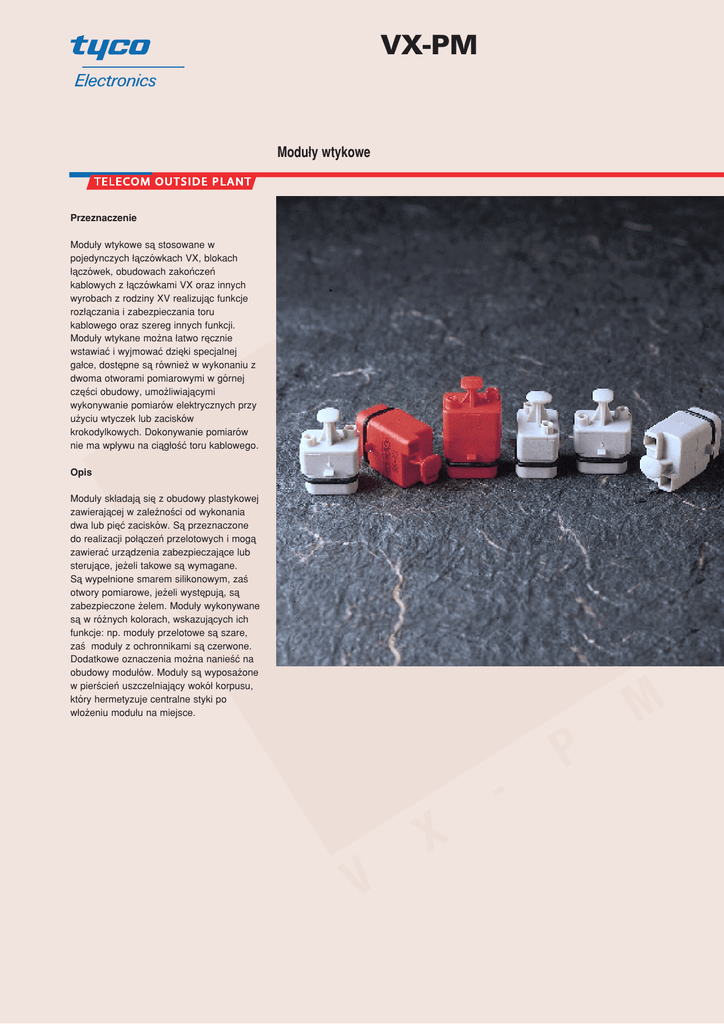 VX-PM Modu=y wtykowe Przeznaczenie Modu=y wtykowe s' stosowane w pojedynczych ='czówkach VX, blokach ='czówek, obudowach zako<cze< kablowych z ='czówkami VX oraz innych wyrobach z rodziny XV realizuj'c funkcje roz='czania i zabezpieczania toru kablowego oraz szereg innych funkcji. Modu=y wtykane mo/na =atwo r"cznie wstawia: i wyjmowa: dzi"ki specjalnej ga=ce, dost"pne s' równie/ w wykonaniu z dwoma otworami pomiarowymi w górnej cz">ci obudowy, umo/liwiaj'cymi wykonywanie pomiarów elektrycznych przy u/yciu wtyczek lub zacisków krokodylkowych. Dokonywanie pomiarów nie ma wp=ywu na ci'g=o>: toru kablowego. Opis Modu=y sk=adaj' si" z obudowy plastykowej zawieraj'cej w zale/no>ci od wykonania dwa lub pi": zacisków. S' przeznaczone do realizacji po='cze< przelotowych i mog' zawiera: urz'dzenia zabezpieczaj'ce lub steruj'ce, je/eli takowe s' wymagane. S' wype=nione smarem silikonowym, za>ˇ otwory pomiarowe, je/eli wyst"puj', s' zabezpieczone /elem. Modu=y wykonywane s' w ró/nych kolorach, wskazuj'cych ich funkcje: np. modu=y przelotowe s' szare, za>ˇ modu=y z ochronnikami s' czerwone. Dodatkowe oznaczenia mo/na nanie>: na obudowy modu=ów. Modu=y s' wyposa/one w pier>cie< uszczelniaj'cy wokó= korpusu, który hermetyzuje centralne styki po w=o/eniu modu=u na miejsce. V X - P M VX-PM Oznaczenie katalogowe VX - PM - X XXX XXX Modu= wtykowy Uk=ad wewn"trzny: Dost"p do punktów pomiarowych: P wtykami C krokodylkami X brak F otwierana pokrywka Uk=ad wewn"trznyny: G01,02,03,04 ochronnik gazowany RC1,2,3 Filtr RC T01 tyrystor RF Filtr w.cz. GP1 ochronnik gazowany + dwa rezystory o dodatnim wspó=czynniku temp. RM Pomiar zdalny TP1 tyrystor + dwa rezystory o dodatnim wspó=czynniku temp. UF bez zabezpieczenia, “krótki” BT roz='czny pomiarowy Specyfikacje Dane styków Wytrzyma=o>: na obci'/enie pr'dem 30 amperów, po 15 amperów na jedn' /y=", przynajmniej 10 min.bez odkszta=cenia obudowy modu=u Rezystancja izolacji* Írodowisko suche Írodowisko wilgotne (ASTM D618 Procedura F) Mg=a solankowa (ASTM B117) Zanurzenie w wodzie: (15 dni w 3 % roztworze NaCl) >1012 Ω >1012 Ω >1010 Ω >1010 Ω Rezystancja przej>cia R materia= + R styki zwory + R styki przewodów <10 m Ω Wzrost rezystancji przej>cia Po badaniach klimatycznych Po 50 w='czeniach i wy='czeniach Wytrzyma=o>: elektryczna izolacji <2.5 m Ω <2.5 m Ω >3.000 V pr. st. przez 1 min. W=a>ciwo>ci mechaniczne Zacisk uziemiaj'cy ochronnik Zacisk przelotowy Korpus modu=u Pier>cie< uszczelniaj'cy cynowany twardy mosi'dz cynowany twardy mosi'dz wzmocniony w=óknem szklanym poliw"glan z klas' palno>ci VO EPDM * Mierzona od ka/dej linii do ziemi. Nie dotyczy wersji z filtrem w.cz. Tyco, Raychem i VX sà znakami handlowymi Tyco International. Pokazane tu w celach ilustracyjnych informacje, rysunki i schematy sà wed∏ug nas wiarygodne. Jednak˝e firma Tyco Electronics nie gwarantuje ich dok∏adnoÊci i kompletnoÊci oraz nie bierze na siebie odpowiedzialnoÊci zwiàzanej z ich u˝yciem. Zobowiàzania firmy Tyco Electronics mogà byç jedynie takie, jakie zosta∏y wyspecyfikowane w ”Standard Terms and Conditions of Sale” firmy Tyco Electronics dla niniejszego wyrobu i w ˝adnym przypadku firma Tyco Electronics nie b´dzie odpowiedzialna za jakiekolwiek przypadkowe, bezpoÊrednie lub wynikowe uszkodzenia powsta∏e w nast´pstwie sprzeda˝y, odsprzeda˝y, u˝ycia lub nieprawid∏owego u˝ycia tego wyrobu. U˝ytkownicy wyrobów firmy Tyco Electronics powinni sami dokonaç oszacowania w celu okreÊlenia przydatnoÊci ka˝dego takiego wyrobu do konkretnego zastosowania. Tyco Electronics Raychem NV Raychem Polska Sp. z o.o. Telecom Outside Plant Diestsesteenweg 692 3010 Kessel-Lo, Belgium Tel.: 32-16-351 011 Fax: 32-16-351 697 www.tycoelectronics.com Ul. Post´pu 2 02-676 Warszawa Tel.: 48-22- 549 07 20 Fax: 48-22- 549 07 21 [email protected] TC 600/M/DS/PO/1 03/99