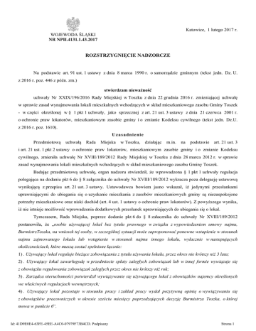 Katowice, 1 lutego 2017 r. WOJEWODA ŚLĄSKI NR NPII.4131.1.43.2017 ROZSTRZYGNIĘCIE NADZORCZE Na podstawie art. 91 ust. 1 ustawy z dnia 8 marca 1990 r. o samorządzie gminnym (tekst jedn. Dz. U. z 2016 r. poz. 446 z późn. zm.) stwierdzam nieważność uchwały Nr XXIX/196/2016 Rady Miejskiej w Toszku z dnia 22 grudnia 2016 r. zmieniającej uchwałę w sprawie zasad wynajmowania lokali mieszkalnych wchodzących w skład mieszkaniowego zasobu Gminy Toszek - w części określonej w § 1 pkt 1 uchwały, jako sprzecznej z art. 21 ust. 3 ustawy z dnia 21 czerwca 2001 r. o ochronie praw lokatorów, mieszkaniowym zasobie gminy i o zmianie Kodeksu cywilnego (tekst jedn. Dz.U. z 2016 r. poz. 1610). Uzasadnienie Przedmiotową uchwałą Rada Miejska w Toszku, działając m.in. na podstawie art. 21 ust. 3 i art. 21 ust. 1 pkt 2 ustawy o ochronie praw lokatorów, mieszkaniowym zasobie gminy i o zmianie Kodeksu cywilnego, zmieniła uchwałę Nr XVIII/189/2012 Rady Miejskiej w Toszku z dnia 28 marca 2012 r. w sprawie zasad wynajmowania lokali mieszkalnych wchodzących w skład mieszkaniowego zasobu Gminy Toszek. Badając przedmiotową uchwałę, organ nadzoru stwierdził, że wprowadzona § 1 pkt 1 uchwały regulacja polegająca na dodaniu pkt 6 do § 8 załącznika do uchwały Nr XVIII/189/2012 wykracza poza delegację ustawową wynikającą z przepisu art. 21 ust. 3 ustawy. Ustawodawca bowiem jasno wskazał, iż jedynymi przesłankami uprawniającymi do ubiegania się o uzyskanie mieszkania z zasobów mieszkaniowych gminy są niezaspokojone potrzeby mieszkaniowe oraz niski dochód (art. 4 ust. 1 ustawy o ochronie praw lokatorów). Z powyższego wynika, iż nie istnieje możliwość wprowadzenia dodatkowych przesłanek uprawniających do ubiegania się o lokal. Tymczasem, Rada Miejska, poprzez dodanie pkt 6 do § 8 załacznika do uchwały Nr XVIII/189/2012 postanowiła, że „osobie używającej lokal bez tytułu prawnego w związku z wypowiedzeniem umowy najmu, BurmistrzToszka, na wniosek tej osoby, w szczególnej sytuacji może zaproponować ponowne wstapienie w stosunek najmu zajmowanego lokalu lub wstąpienie w stosunek najmu innego lokalu, wyłacznie w nastepujących okolicznościach, które muszą zostać spełnione łącznie: 1) . Używający lokal reguluje bieżące zobowiązania z tytułu używania lokalu, przez okres nie krótszy niż 3 lata; 2) . Używający lokal zawarługodę w przedmiocie spłaty zaległych zobowiązań lub w innej formie wywiązuje się z obowiązku regulowania zobowiązań zaległych przez okres nie krótszy niż rok; 3) . Zarządca nieruchomości potwierdził wywiązywanie się używającego lokal z obowiązków najemcy określonych we właściwych regulacjach wewnętrznych; 4) . Używający lokal pozostaje w stosunku pracy i zakład pracy wydał pozytywną opinię o wywiązywaniu się z obowiązków pracowniczych w okresie sześciu miesięcy poprzedzających decyzję Burmistrza Toszka, o której mowa w punkcie 6”. Id: 41D9E0E4-63FE-45EE-A4C0-07979F73B4CD. Podpisany Strona 1 Jednak jak wskazał Sąd w swym wyroku „Zasady wynajmowania lokali wchodzących w skład mieszkaniowego zasobu gminy stanowią jeden z szeroko rozumianych aktów planowania, z którego jednak nie mogą w sposób bezpośredni wynikać dla żadnego podmiotu uprawnienia ani obowiązki, nie może on również wprowadzać jednoznacznych kryteriów przesądzających o tym, komu określone uprawnienia mogą być przyznane, a komu nie. Jego rolą jest bowiem jedynie poinformowanie społeczności lokalnej o zasadach przyznawania, w tym przypadku lokali (wyrok WSA z dnia 9 grudnia 2008 r., sygn. akt II SA/Bd 806/08, lex nr 569862)” (wyrok Wojewódzkiego Sądu Administracyjnego w Poznaniu z 23 lutego 2011r., sygn. akt IV SA/Po 1024/10, publ. CBOSA). Również zgodzić się należy z Naczelnym Sądem Administracyjnym, że „ustawowe uprawnienie rady gminy do określania w drodze uchwały zasad wynajmowania lokali wchodzących w skład mieszkaniowego zasobu gminy nie obejmuje takich okoliczności warunkujących dopuszczalność zawarcia umowy najmu, które nie wynikają z treści omawianej ustawy. Jakkolwiek bowiem, przepis art. 21 ust. 3 ustawy wskazuje, iż zawarte w nim wyliczenie stosownych okoliczności nie jest wyczerpujące – ustawodawca użył w tym przepisie sformułowania, iż "zasady wynajmowania (...) powinny określać w szczególności", to jednak ustawowe określenie warunków dopuszczających zawarcie umowy najmu w art. 4 ust. 2 oraz w art. 5, art. 6 i art. 9 ustawy, wyklucza dopuszczalność wprowadzenia przez radę gminy innych jeszcze warunków, szczególniefinansowych, nie mających umocowania w ustawie.” (wyrok Naczelnego Sądu Administracyjnego z dnia 22 stycznia 2010 r. sygn. akt I OSK 1318/09, publ. CBOSA). Tym samym nie istnieje możliwość podjęcia kwestionowanych regulacji. Dodatkowo wskazać należy, że wprowadzona § 1 pkt 1 uchwały regulacja polega na dodaniu pkt 6 do § 8 załącznika do uchwały Nr XVIII/189/2012. Paragraf 8 uchwały Nr XVIII/189/2012 normuje kwestie warunków dokonywania zamiany lokali wchodzących w skład mieszkaniowego zasobu Gminy Toszek przez najemców tych lokali. Tymczasem wprowadzany przedmiotową uchwałą pkt 6 nie dotyczy zamiany lokali, reguluje zaś sytuacje, w której osoba używająca lokal bez tytułu prawnego w związku z wypowiedzeniem umowy najmu może starać się o ponowny najem lokalu wchodzącego w skład mieszkaniowego zasoby gminy na specjalnych warunkach, określonych w tym przepisie. Specjalne warunki dopuszczają zatem pominięcie ustalonego w rozdziale 4 załącznika do uchwały Nr XVIII/189/2012 trybu rozpatrywania i załatwiania wniosków o najem lokali zawieranych na czas nieoznaczony i o najem lokali socjalnych, co w opinii organu nadzoru jest niedopuszczalne. W ocenie organu nadzoru wskazane uchybienia uznać należy za istotne naruszenie prawa, skutkujące koniecznością stwierdzenia nieważności uchwały 