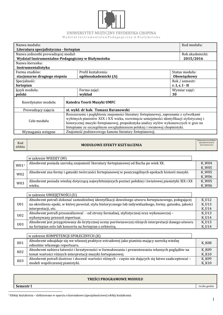 UNIWERSYTET MUZYCZNY FRYDERYKA CHOPINA W y d z i a ł I n s t r u m e n t a l n o-P e d a g o g i c z n y w B i a ł y m s t o k u Nazwa modułu: Literatura specjalistyczna - fortepian Nazwa jednostki prowadzącej moduł: Wydział Instrumentalno-Pedagogiczny w Białymstoku Nazwa kierunku: Instrumentalistyka Forma studiów: Profil kształcenia: stacjonarne drugiego stopnia ogólnoakademicki (A) Specjalność: fortepian Język modułu: Forma zajęć: polski wykład Koordynator modułu Prowadzący zajęcia Cele modułu Wymagania wstępne Kod efektu W011 W02 W03 U01 U02 U03 K01 K02 K03 Kod modułu: Rok akademicki: 2015/2016 Status modułu: Obowiązkowy Rok / semestr: r. I, s. I - II Wymiar zajęć: 30 Katedra Teorii Muzyki UMFC st. wykł. dr hab. Tomasz Baranowski Rozszerzenie i pogłębienie znajomości literatury fortepianowej, zapoznanie z sylwetkami wybitnych pianistów XIX i XX wieku, rozwinięcie umiejętności identyfikacji stylistycznej i historycznej muzyki fortepianowej, propedeutyka analizy stylów wykonawczych w grze na fortepianie ze szczególnym uwzględnieniem polskiej i światowej chopinistyki. Znajomość podstawowego kanonu literatury fortepianowej. MODUŁOWE EFEKTY KSZTAŁCENIA w zakresie WIEDZY (W) Absolwent posiada szeroką znajomość literatury fortepianowej od Bacha po wiek XX. Odniesienie do efektów specjalnościowych (kierunkowych) Absolwent posiada wiedzę dotyczącą najwybitniejszych postaci polskiej i światowej pianistyki XIX i XX wieku. K_W04 K_W05 K_W05 K_W06 K_W05 K_W06 w zakresie UMIEJĘTNOŚCI (U) Absolwent potrafi dokonać samodzielnej identyfikacji dowolnego utworu fortepianowego, polegającej na określeniu epoki, w której powstał, stylu historycznego lub indywidualnego, formy, gatunku, jakości interpretacji, etc. Absolwent potrafi przeanalizować - od strony formalnej, stylistycznej oraz wykonawczej – wykonywany przezeń repertuar. Absolwent jest przygotowany do krytycznej oceny porównawczej różnych interpretacji danego utworu na fortepian solo lub koncertu na fortepian z orkiestrą. K_U12 K_U13 K_U14 K_U13 K_U14 K_U13 K_U14 Absolwent zna formy i gatunki twórczości fortepianowej w poszczególnych epokach historii muzyki. w zakresie KOMPETENCJI SPOŁECZNYCH (K) Absolwent odnajduje się we własnej praktyce estradowej jako pianista mający szeroką wiedzę odnośnie własnego repertuaru. Absolwent nabiera łatwości i kreatywności w formułowaniu i prezentowaniu własnych poglądów na temat wartości różnych interpretacji muzyki fortepianowej. Absolwent potrafi dostrzec i docenić wartości różnych – często nie dających się łatwo zaakceptować – modeli współczesnej pianistyki. K_K08 K_K09 K_K10 K_K09 K_K10 TREŚCI PROGRAMOWE MODUŁU Semestr I 1 Liczba godzin Efekty kształcenia – definiowane w oparciu o kierunkowe (specjalnościowe) efekty kształcenia 1 Muzyka fortepianowa [klawesynowa] baroku ze szczególnym uwzględnieniem twórczości J.S. Bacha; Twórczość fortepianowa klasyków wiedeńskich; U źródeł muzyki na Hammerklavier i dziewiętnastowiecznej pianistyki (Clementi, Hummel, Weber); Wielcy pianiści – interpretatorzy muzyki Bacha i klasyków (analizy porównawcze wykonań). 3 9 2 2 Semestr II Wielcy romantycy (Schubert, Chopin, Mendelssohn, Liszt, Brahms, Czajkowski, Rachmaninow, Saint-Saens i inni); Muzyka fortepianowa I połowy XX wieku i współczesna (m. in. Skriabin, Szymanowski, Debussy, Ravel, Strawiński, Paderewski, Prokofiew, Bartok,) ; Fortepian w awangardowej twórczości kompozytorów II połowy XX wieku; Wielcy pianiści XX stulecia 7 5 1 2 Treści programowe wzajemnie się przenikają, a wiele z nich jest obecnych podczas całego procesu kształcenia. METODY KSZTAŁCENIA 1. 2. 3. 4. 5. 6. wykład problemowy wykład konwersatoryjny dyskusja praca z tekstem nutowym prezentacja nagrań CD i DVD aktywizacja („burza mózgów”, metoda „śniegowej kuli”) Weryfikacja efektów kształcenia Metody weryfikacji 1. 2. 3. 4. 5. Nr efektu2 kolokwium ustne (egzamin końcowy) kolokwium pisemne – test słuchowy projekt, prezentacja kontrola przygotowanych projektów eseje, raporty W01, W02, W03, U01 W02, U02 W02, U03, K01, K02, K03 W02, W03, U02, U03, K03 W01, W02, U02, U03, K03 Korelacja efektów kształcenia z treściami i metodami kształcenia oraz metodami ich weryfikacji 3 Nr efektu kształcenia W01 W02 W03 U01 U02 U03 K01 K02 K03 Treści kształcenia 1, 2, 3, 4 1, 2, 3, 4 1, 2, 3, 4 5, 6 5, 6 5, 6 1, 2, 3, 5, 6 1, 2, 3, 5, 6 1, 2, 3, 5, 6 Metody kształcenia 1, 2, 3, 5 1, 2, 3, 5 1, 2, 3, 5 2, 3, 4, 5, 6 2, 3, 4, 5, 6 3, 5, 6 1, 2, 3, 4, 5, 6 1, 2, 3, 4, 5, 6 1, 2, 3, 4, 5, 6 Metody weryfikacji 1, 2, 4, 5 1, 2, 4, 5 1, 2, 4, 5 1, 3, 5 1, 3, 5 1, 3, 5 3, 5 3, 5 3, 5 Forma zaliczenia Semestr pierwszy – trzy śródsemestralne testy słuchowe (DWK J. S. Bacha, koncerty fortepianowe Mozarta [12] i Beethovena [wszystkie], sonaty fortepianowe klasyków wiedeńskich [w tym wszystkie sonaty Beethovena]) Semestr drugi – dwa śródsemestralne testy słuchowe (koncerty romantyczne + twórczość Chopina [całość] oraz wybrane utwory na fortepian solo i z orkiestrą z muzyki XX wieku). Egzamin ustny polegający na rozpoznaniu i omówieniu przez studenta pięciu przykładów z literatury fortepianowej (spoza wykazu utworów do testów słuchowych). Warunkiem zaliczenia jest osiągnięcie wszystkich założonych efektów kształcenia (w minimalnym akceptowalnym stopniu – w wysokości >50%) Literatura podstawowa odnosimy się do uprzednio sformułowanych przez nas efektów kształcenia należy podać numer efektu kształcenia, numery odpowiednich zakresów treści kształcenia oraz przyporządkować im metody kształcenia i weryfikacji (podać numery) 2 3 2 MGG, Klaviermusik [hasło]. Literatura uzupełniająca Wybrane artykuły, hasła encyklopedyczne, rozdziały w monografiach oraz szkice F. Chopina do Methode des methodes. Kalkulacja nakładu pracy studenta potrzebnej do osiągnięcia zakładanych efek