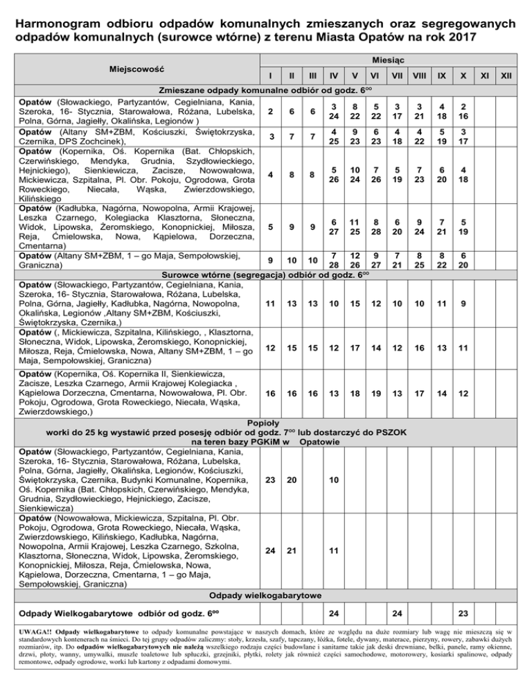 Harmonogram odbioru odpadów komunalnych zmieszanych oraz segregowanych odpadów komunalnych (surowce wtórne) z terenu Miasta Opatów na rok 2017 Miejscowość Miesiąc I II III IV V VI Zmieszane odpady komunalne odbiór od godz. 6ºº Opatów (Słowackiego, Partyzantów, Cegielniana, Kania, 3 8 5 6 6 Szeroka, 16- Stycznia, Starowałowa, Różana, Lubelska, 2 24 22 22 Polna, Górna, Jagiełły, Okalińska, Legionów ) Opatów (Altany SM+ZBM, Kościuszki, Świętokrzyska, 4 9 6 3 7 7 25 23 23 Czernika, DPS Zochcinek), Opatów (Kopernika, Oś. Kopernika (Bat. Chłopskich, Czerwińskiego, Mendyka, Grudnia, Szydłowieckiego, 5 10 7 Hejnickiego), Sienkiewicza, Zacisze, Nowowałowa, 4 8 8 26 24 26 Mickiewicza, Szpitalna, Pl. Obr. Pokoju, Ogrodowa, Grota Roweckiego, Niecała, Wąska, Zwierzdowskiego, Kilińskiego Opatów (Kadłubka, Nagórna, Nowopolna, Armii Krajowej, Leszka Czarnego, Kolegiacka Klasztorna, Słoneczna, 6 11 8 9 9 Widok, Lipowska, Żeromskiego, Konopnickiej, Miłosza, 5 27 25 28 Reja, Ćmielowska, Nowa, Kąpielowa, Dorzeczna, Cmentarna) Opatów (Altany SM+ZBM, 1 – go Maja, Sempołowskiej, 7 12 9 9 10 10 28 26 27 Graniczna) Surowce wtórne (segregacja) odbiór od godz. 6ºº Opatów (Słowackiego, Partyzantów, Cegielniana, Kania, Szeroka, 16- Stycznia, Starowałowa, Różana, Lubelska, 11 13 13 10 15 12 Polna, Górna, Jagiełły, Kadłubka, Nagórna, Nowopolna, Okalińska, Legionów ,Altany SM+ZBM, Kościuszki, Świętokrzyska, Czernika,) Opatów (, Mickiewicza, Szpitalna, Kilińskiego, , Klasztorna, Słoneczna, Widok, Lipowska, Żeromskiego, Konopnickiej, Miłosza, Reja, Ćmielowska, Nowa, Altany SM+ZBM, 1 – go 12 15 15 12 17 14 Maja, Sempołowskiej, Graniczna) VII VIII IX X 3 17 3 21 4 18 2 16 4 18 4 22 5 19 3 17 5 19 7 23 6 20 4 18 6 20 9 24 7 21 5 19 7 21 8 25 8 22 6 20 10 10 11 9 12 16 13 11 14 12 Opatów (Kopernika, Oś. Kopernika II, Sienkiewicza, Zacisze, Leszka Czarnego, Armii Krajowej Kolegiacka , Kąpielowa Dorzeczna, Cmentarna, Nowowałowa, Pl. Obr. 16 16 16 13 18 19 13 17 Pokoju, Ogrodowa, Grota Roweckiego, Niecała, Wąska, Zwierzdowskiego,) Popioły worki do 25 kg wystawić przed posesję odbiór od godz. 7ºº lub dostarczyć do PSZOK na teren bazy PGKiM w Opatowie Opatów (Słowackiego, Partyzantów, Cegielniana, Kania, Szeroka, 16- Stycznia, Starowałowa, Różana, Lubelska, Polna, Górna, Jagiełły, Okalińska, Legionów, Kościuszki, 23 20 10 Świętokrzyska, Czernika, Budynki Komunalne, Kopernika, Oś. Kopernika (Bat. Chłopskich, Czerwińskiego, Mendyka, Grudnia, Szydłowieckiego, Hejnickiego, Zacisze, Sienkiewicza) Opatów (Nowowałowa, Mickiewicza, Szpitalna, Pl. Obr. Pokoju, Ogrodowa, Grota Roweckiego, Niecała, Wąska, Zwierzdowskiego, Kilińskiego, Kadłubka, Nagórna, Nowopolna, Armii Krajowej, Leszka Czarnego, Szkolna, 24 21 11 Klasztorna, Słoneczna, Widok, Lipowska, Żeromskiego, Konopnickiej, Miłosza, Reja, Ćmielowska, Nowa, Kąpielowa, Dorzeczna, Cmentarna, 1 – go Maja, Sempołowskiej, Graniczna) Odpady wielkogabarytowe Odpady Wielkogabarytowe odbiór od godz. 6ºº 24 24 XI XII 23 UWAGA!! Odpady wielkogabarytowe to odpady komunalne powstające w naszych domach, które ze względu na duże rozmiary lub wagę nie mieszczą się w standardowych kontenerach na śmieci. Do tej grupy odpadów zaliczmy: stoły, krzesła, szafy, tapczany, łóżka, fotele, dywany, materace, pierzyny, rowery, zabawki dużych rozmiarów, itp. Do odpadów wielkogabarytowych nie należą wszelkiego rodzaju części budowlane i sanitarne takie jak deski drewniane, belki, panele, ramy okienne, drzwi, płoty, wanny, umywalki, muszle toaletowe lub spłuczki, grzejniki, płytki, rolety jak również części samochodowe, motorowery, kosiarki spalinowe, odpady remontowe, odpady ogrodowe, worki lub kartony z odpadami domowymi.