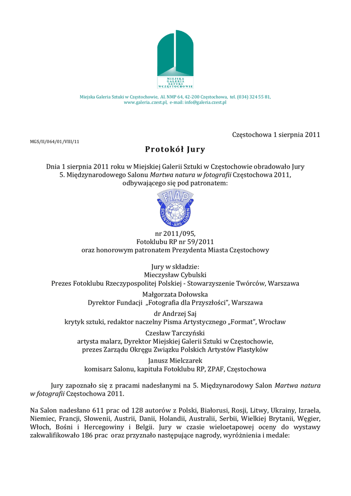 Protokół Jury - Miejska Galeria Sztuki w Częstochowie