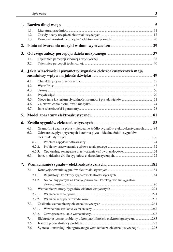 Spis treści 3 1. Bardzo długi wstęp ............................................................................................................................... 5 1.1. 1.2. 1.3. Literatura przedmiotu .................................................................................................................. 11 Zasady oceny urządzeń elektroakustycznych ....................................................................... 17 Domowe konstrukcje urządzeń elektroakustycznych......................................................... 20 2. Istota odtwarzania muzyki w domowym zaciszu......................................................... 29 3. Od czego zależy percepcja dzieła muzycznego .............................................................. 37 3.1. 3.2. Tajemnice percepcji ideowej i artystycznej ........................................................................... 38 Tajemnice percepcji technicznej ............................................................................................... 40 4. Jakie właściwości i parametry sygnałów elektroakustycznych mają zasadniczy wpływ na jakość dźwięku .................................................................................. 49 4.1. 4.2. 4.3. 4.4. 4.5. 4.6. 4.7. Charakterystyka przenoszenia ................................................................................................... 55 Wzór Friisa ..................................................................................................................................... 62 Szumy............................................................................................................................................... 66 Przydźwięki .................................................................................................................................... 70 Nieco inne kryterium słyszalności szumów i przydźwięków .......................................... 71 Zniekształcenia nieliniowe i nie tylko .................................................................................... 74 Inne właściwości i parametry .................................................................................................... 78 5. Model aparatury elektroakustycznej ................................................................................... 81 6. Źródła sygnałów elektroakustycznych ................................................................................ 83 6.1. 6.2. Gramofon i czarna płyta – nieidealne źródło sygnałów elektroakustycznych ............ 84 Odtwarzacz płyt optycznych i srebrna płyta – idealne źródło sygnałów elektroakustycznych ................................................................................................................... 106 6.2.1. 6.2.2. 6.2.3. 6.3. Problem napędów odtwarzaczy ......................................................................................... 124 Problemy przetwarzania cyfrowo-analogowego ............................................................ 132 Opcjonalne, zewnętrzne przetwarzanie cyfrowo-analogowe ....................................... 161 Inne, nieidealne źródła sygnałów elektroakustycznych ................................................... 172 7. Wzmacnianie sygnałów elektroakustycznych ..............................................................181 7.1. Kondycjonowanie sygnałów elektroakustycznych ........................................................... 184 7.1.1. Regulatory i korektory sygnałów elektroakustycznych ................................................ 184 7.1.2. Nieco inny pomysł na kondycjonowanie i korekcję widma sygnałów elektroakustycznych............................................................................................................. 196 7.2. Wzmacniacze mocy sygnałów elektroakustycznych ........................................................ 221 7.2.1. Wzmacniacze lampowe ....................................................................................................... 221 7.2.2. Wzmacniacze półprzewodnikowe ..................................................................................... 233 7.3. Zasilanie wzmacniaczy elektroakustycznych ..................................................................... 261 7.3.1. Wewnętrzne zasilanie wzmacniaczy ................................................................................. 262 7.3.2. Zewnętrzne zasilanie wzmacniaczy .................................................................................. 278 7.4. 7.5. 7.6. Elektroakustyczne problemy z kompatybilnością elektromagnetyczną ...................... 283 Jeszcze jeden złośliwy problem .............................................................................................. 292 Synteza konstrukcji zintegrowanego wzmacniacza elektroakustycznego .................. 295 4 Spis treści 8. Badania urządzeń elektroakustycznych ..............................................................................299 8.1. 8.2. Przyrządy pomiarowe ................................................................................................................ 301 Badania wzmacniaczy elektroakustycznych ....................................................................... 362 8.2.1. 8.2.2. 8.2.3. 8.2.4. 8.3. Przykładowy obiekt badań.................................................................................................. 362 Badania mocy ........................................................................................................................ 373 Badania szumów, zakłóceń i zniekształceń ..................................................................... 388 Badania stabilności amplitudowej i fazowej charakterystyki przenoszenia ............. 417 Badania odtwarzaczy płyt optycznych ................................................................................. 417 8.3.1. 8.3.2. Badania napędów ..................