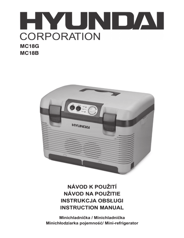 MC18G MC18B NÁVOD K POUŽITÍ NÁVOD NA POUŽITIE INSTRUKCJA OBSŁUGI INSTRUCTION MANUAL Minichladnička / Minichladnička Minichłodziarka pojemność/ Mini-refrigerator Vážený zákazníku, děkujeme Vám za zakoupení našeho produktu. Před uvedením tohoto přístroje do provozu si velmi pozorně přečtěte návod k obsluze a tento návod spolu se záručním listem, pokladním dokladem a podle možností i s obalem a vnitřním vybavením obalu dobře uschovejte. Všeobecné bezpečnostní pokyny • Používejte tento přístroj výlučně pro soukromou potřebu a pro stanovené účely. Tento přístroj není určen pro komerční použití. • Chraňte ho před horkem, přímým slunečním zářením, vlhkostí (v žádném případě jej neponořujte do kapalin) a stykem s ostrými hranami. Nepoužívejte přístroj v případě, že máte vlhké ruce. Jestliže dojde k navlhčení nebo namočení přístroje, okamžitě vytáhněte zástrčku ze zásuvky. Vyvarujte se styku s vodou. • Přístroj vypněte a vždy vytáhněte zástrčku ze zásuvky (tahejte jen za zástrčku, nikdy ne za kabel), jestliže nebudete přístroj používat, chcete-li namontovat příslušenství, přístroj vyčistit nebo v případě poruchy. • Přístroj nesmí zůstat v provozu bez dozoru. Jestliže musíte pracoviště opustit, vždy přístroj vypněte, resp. vytáhněte zástrčku ze zásuvky (vždy tahejte za zástrčku, nikdy ne za kabel). • Abyste ochránili děti před riziky spojenými s elektrickými přístroji, postarejte se o to, aby kabel nevisel dolů a děti na přístroj nedosáhly. • Pravidelně kontrolujte přístroj a přívodní kabel z hlediska poškození. Jestliže přístroj vykazuje nějakou závadu, neuvádějte jej do provozu. • V případě selhání či nesprávné činnosti přístroj vypněte a nepokoušejte se ho sami opravit. Obraťte se na autorizovaný servis a žádejte originální náhradní díly. Nedodržení výše uvedeného může ovlivnit bezpečnost spotřebiče. • Používejte jen originální příslušenství. • Respektujte, prosím, následující „Speciální bezpečnostní pokyny pro tento přístroj“. Speciální bezpečnostní pokyny pro tento přístroj • Po rozbalení zkontrolujte, zda spotřebič není poškozen. V případě pochybností přístroj nezapojujte a obraťte se na kvalifikovaného technika. • Obalové materiály (plastové sáčky, polystyrénová pěna, atd.), musí být jako zdroj možného nebezpeční udržovány mimo dosah malých dětí. • Má-li spotřebič být napájen z autobaterie, zkontrolujte prosím, zda její napětí je 12 V s uzemněným záporným pólem. • Je-li zapotřebí prodloužit přívodní kabel, použijte pouze nepoškozený prodlužovací kabel uzpůsobený pro dané parametry napájení. • Spotřebič není vhodný pro převoz korozívních látek a látek na bázi rozpouštědla. • Naplněnou minichladničku neobracejte dnem vzhůru. • Potraviny je možné skladovat pouze v originálních obalech či vhodných nádobách. • Tekutiny a led vkládejte do minichadničky pouze ve vhodných nádobách. • Nebalené potraviny před umístěním do minichladničky tyto vložte do vhodného ochranného obalu. • Přepínání režimů provádějte s časovou prodlevou. Spotřebič nejprve vypněte a funkci přepněte přibližně po 30 minutách klidu. • Žádné z otvorů výrobku nezakrývejte. Rovněž do otvorů nevhazujte předměty a spotřebič nezakrývejte např. oblečením. • Spotřebič nenechávejte na místech, kde hrozí pád např. do bazénu, vany nebo jiných nádob s vodou. CZ - CZ • Spotřebič odpojte ze sítě, pokud: - Není používán. - Dojde k přerušení dodávky el. proudu. - Před zahájením údržby nebo čištění. Popis ovládacích prvků P1 P2 P3 P4 P5 P6 P7 P8 P9 P10 P11 P12 P13 P14 Hlavní vypínač (ON/OFF) Ovladač rychlosti ventilátoru (AUTO/MUTE) Termostat pro nastavení teploty - režimu ohřev/chlazení (TEMP °C) Indikátor ohřevu (HOT) Indikátor chlazení (COOL) Otevírací a zavírací spony Víko Rukojeť Tlačítko pro otevírání kabelové přihrádky Přihrádka pro uložení kabelu Přívod vzduchu do ventilátoru Vývod vzduchu Konektor pro napájení stejnosměrným napětím 12 V Konektor pro napájení střídavým napětím 230 V CZ - Pokyny k použití Minichladnička je vhodná pro přepravu všech druhů nápojů a potravin. Díky termostatu udržuje teplotu stabilní (při chlazení až o 16°C - 20°C nižší než je okolní teplota a při ohřevu na 60 °C). Díky možnosti dvojího napájení (připojení do zásuvky v automobilu nebo do běžné zásuvky na střídavé napětí), ji lze mít při sobě při výletech autem, procházkách v přírodě, nakupování, lze ji také použít pro převoz léčiv nebo instalovat v kancelářích, pokojích atd. Tento spotřebič používá pro chlazení a ohřev články s dlouhou životností a je vybaven chladící jednotkou se dvěma ventilátory. Jeho výhodou je, že funguje bez chladiva na bázi freonu (CFC). NAPÁJENÍ STŘÍDAVÝM NAPĚTÍM 230V 1. Pro otevření kabelové přihrádky stiskněte tlačítko P9 a vyjměte kabel pro napájení střídavým napětím. 2. Koncovku kabelu vsuňte do konektoru P14. 3. Druhý konec kabelu se zástrčkou zapojte do elektrické zásuvky 230 V. NAPÁJENÍ 12V Spotřebič je určen k napájení 12 V autobaterií s uzemněným záporným pólem. Pro otevření kabelové přihrádky stiskněte tlačítko P9, vyjměte kabel pro napájení stejnosměrným napětím a odpovídající koncovku vsuňte do konektoru P13 na přístroji. Poté druhý konec kabelu zapojte do zásuvky v automobilu (vývod pro elektrický zapalovač) Pokud minichladničku nepoužíváte, odpojte spotřebič z automobilové zásuvky. POZNÁMKY: • Aby nedošlo k vybití autobaterie, nenechávejte minichladničku zapojenou při 