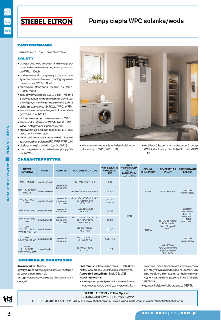 Pompy ciepła WPC solanka/woda ZASTOSOWANIE Ogrzewanie c.o., c.w.u. oraz chłodzenie ZALETY INSTALACJE GRZEWCZE POMPY CIEPŁA z przystosowane do chłodzenia aktywnego po- przez odbieranie ciepła z systemu grzewczego (WPL ...Cool) z dostosowane do pasywnego chłodzenia w systemie powierzchniowym, podłogowym i nadmuchowym (WPC ...Cool) z możliwość stosowania pompy do temp. –20°C (WPL) z zabudowany zasobnik c.w.u. o poj. 175 dm3 z wewnętrznym wymiennikiem rurowym, zapewniającym krótki czas nagrzewania (WPC) z cicha sprężarka typu SCROLL (WPC, WPF) z zabudowane pompy obiegowe układu dolnego źródła i c.o. (WPC) z zintegrowana grupa bezpieczeństwa (WPC) z automatyka sterująca WPMi (WPC, WPF, WPW) zintegrowana z pompą ciepła z sterowanie za pomocą magistrali EIB-BUS (WPC, WPF, WPF ...M) z możliwość sterowania pracą układu i kontroli za pomocą komputera (WPC, WPF, WPF ...M) z obsługa w języku polskim (oprócz WPL) z c.w.u. uzyskiwana bezpośrednio z pompy ciepła (WPF) z wbudowane sterowanie układem kolektorów słonecznych (WPF, WPF ...M) z możliwość łączenia w kaskady do 3 pomp (WPL), do 6 pomp ciepła (WPF ...M i WPW ...M) CHARAKTERYSTYKA NAZWA HANDLOWA RODZAJ WPL 10A/I/IK powietrze/woda MOC GRZEWCZA [kW] WSPÓłCZYNNIK WYDAJNOŚCI COP dla +2°C/+35°C =6,7 3,3 dla +0°C/+35°C =7,7-17,1 do 3,3 FUNKCJE MAKS. TEMPERATURA WODY ZASILAJĄCEJ C.O. I C.W.U. CZYNNIK CHŁODNICZY TEMPERATURA PRACY PRZYGOTOWANI E C.W.U. R407C -20°C do +30°C zasobnik wolno stojący ogrzewanie c.o. i c.w.u. WPL 13/18/23E i powietrze/woda WPL 33 WPL 13/18/23 cool powietrze/woda ogrzewanie c.o. i c.w.u. /chłodzenie dla +2°C/+35°C =8,1-14,8 dla +30°C/+7°C =7,0-12,7 3,4-3,5 2,3-2,8 WPC 5/7/10/13 solanka/woda ogrzewanie c.o. i c.w.u. dla 0 şC/+35şC =5,8-13,4 do 4,5 WPC 5/7/10/13 cool solanka/woda ogrzewanie c.o. i c.w.u. /chłodzenie dla 0°C/+35°C=5,8-13,4 dla +10°C/35°C =4,45-10,4 do 4,5 WPF 5/7/10/13/16 WPF 10/13/16M solanka/woda dla 0şC/+35şC =5,0-16,3 do 4,5 dla 0°C/+35°C =21,88-69,04 4,78-4,85 dla 10°C/+35°C =7,2-21,7 do 6,1 WPF solanka/woda 20/27/40/52/66 WPW 7/10/13/18 WPW 13/18/22M ogrzewanie c.o. i c.w.u. woda/woda 60°C R410A od -5°C do +20°C; krótkotrwale (max. 30 min) do +40°C zasobnik wbudowany poj. 176 l (WPC 5 i 7) i 163 l (WPC 10 i 13) zasobnik wolno stojący od +7°C do +20°C; krótkotrwale (maks. 30 min) do +40°C INFORMACJE DODATKOWE Kraj produkcji: Niemcy Dystrybucja: adresy dystrybutorów dostępne na www.stiebel-eltron.pl. Usługi: doradztwo w zakresie finansowania inwestycji 2009 2 Gwarancja: 2 lata (urządzenia), 3 lata (kompletny system), rok (eksploatacja intensywna) Aprobaty i certyfikaty: Znak CE, VDE Pozostała oferta: z elektryczne przepływowe i pojemnościowe ogrzewacze wody, elektryczne grzejniki kon- wekcyjne, piece akumulacyjne z dynamicznym lub statycznym rozładowaniem, suszarki do rąk, kolektory słoneczne, centrale wentylacyjne – wszystkie urządzenia firmy STIEBEL ELTRON z gazowe i olejowe kotły grzewcze OERTLI STIEBEL ELTRON – Polska Sp. z o.o. UL. INSTALATORÓW 9, 02-237 WARSZAWA TEL. 022 846 48 20, FAKS 022 846 67 03, www.stiebel-eltron.pl, www.PompaCiepla.com.pl, e-mail: [email protected] baza.budujemydom.pl