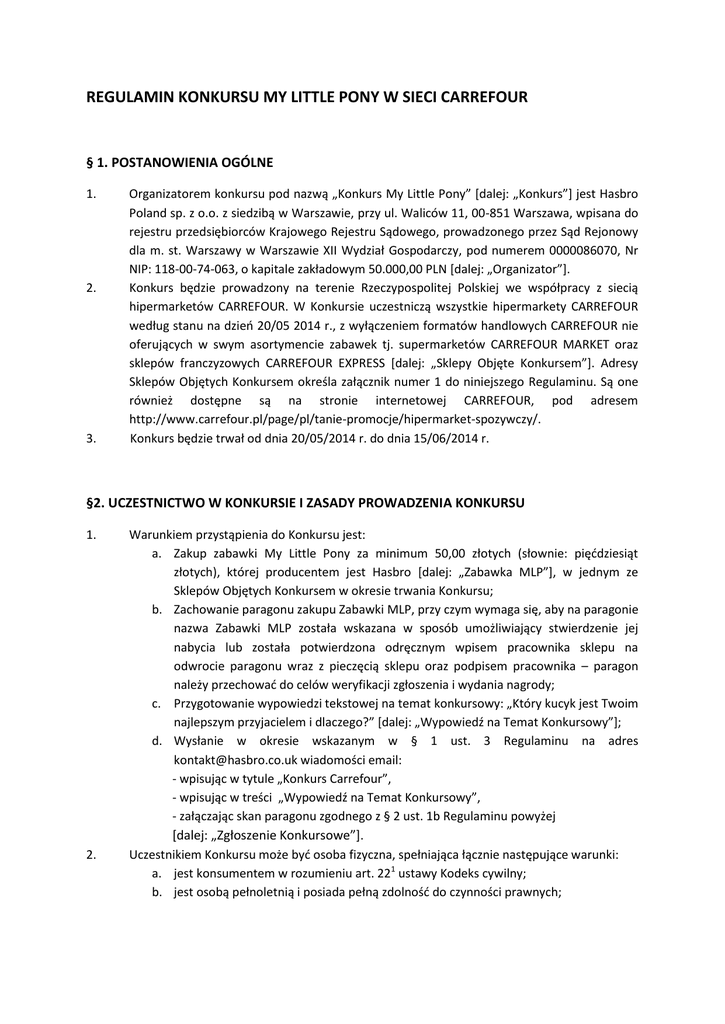 REGULAMIN KONKURSU MY LITTLE PONY W SIECI CARREFOUR § 1. POSTANOWIENIA OGÓLNE 1. 2. 3. Organizatorem konkursu pod nazwą „Konkurs My Little Pony” [dalej: „Konkurs”] jest Hasbro Poland sp. z o.o. z siedzibą w Warszawie, przy ul. Waliców 11, 00-851 Warszawa, wpisana do rejestru przedsiębiorców Krajowego Rejestru Sądowego, prowadzonego przez Sąd Rejonowy dla m. st. Warszawy w Warszawie XII Wydział Gospodarczy, pod numerem 0000086070, Nr NIP: 118-00-74-063, o kapitale zakładowym 50.000,00 PLN [dalej: „Organizator”]. Konkurs będzie prowadzony na terenie Rzeczypospolitej Polskiej we współpracy z siecią hipermarketów CARREFOUR. W Konkursie uczestniczą wszystkie hipermarkety CARREFOUR według stanu na dzień 20/05 2014 r., z wyłączeniem formatów handlowych CARREFOUR nie oferujących w swym asortymencie zabawek tj. supermarketów CARREFOUR MARKET oraz sklepów franczyzowych CARREFOUR EXPRESS [dalej: „Sklepy Objęte Konkursem”]. Adresy Sklepów Objętych Konkursem określa załącznik numer 1 do niniejszego Regulaminu. Są one również dostępne są na stronie internetowej CARREFOUR, pod adresem http://www.carrefour.pl/page/pl/tanie-promocje/hipermarket-spozywczy/. Konkurs będzie trwał od dnia 20/05/2014 r. do dnia 15/06/2014 r. §2. UCZESTNICTWO W KONKURSIE I ZASADY PROWADZENIA KONKURSU 1. 2. Warunkiem przystąpienia do Konkursu jest: a. Zakup zabawki My Little Pony za minimum 50,00 złotych (słownie: pięćdziesiąt złotych), której producentem jest Hasbro [dalej: „Zabawka MLP”], w jednym ze Sklepów Objętych Konkursem w okresie trwania Konkursu; b. Zachowanie paragonu zakupu Zabawki MLP, przy czym wymaga się, aby na paragonie nazwa Zabawki MLP została wskazana w sposób umożliwiający stwierdzenie jej nabycia lub została potwierdzona odręcznym wpisem pracownika sklepu na odwrocie paragonu wraz z pieczęcią sklepu oraz podpisem pracownika – paragon należy przechować do celów weryfikacji zgłoszenia i wydania nagrody; c. Przygotowanie wypowiedzi tekstowej na temat konkursowy: „Który kucyk jest Twoim najlepszym przyjacielem i dlaczego?” [dalej: „Wypowiedź na Temat Konkursowy”]; d. Wysłanie w okresie wskazanym w § 1 ust. 3 Regulaminu na adres [email protected] wiadomości email: - wpisując w tytule „Konkurs Carrefour”, - wpisując w treści „Wypowiedź na Temat Konkursowy”, - załączając skan paragonu zgodnego z § 2 ust. 1b Regulaminu powyżej [dalej: „Zgłoszenie Konkursowe”]. Uczestnikiem Konkursu może być osoba fizyczna, spełniająca łącznie następujące warunki: a. jest konsumentem w rozumieniu art. 221 ustawy Kodeks cywilny; b. jest osobą pełnoletnią i posiada pełną zdolność do czynności prawnych; 3. 4. c. zamieszkuje na terytorium Rzeczypospolitej Polskiej i posiada adres do doręczeń na terenie Rzeczypospolitej Polskiej; d. spełnia warunki uczestnictwa w Konkursie określone w § 2 ust. 1 powyżej; e. nie podlega wykluczeniu z uczestnictwa w Konkursie, zgodnie z postanowieniami ust. 3 i 4 poniżej. W Konkursie nie mogą uczestniczyć pracownicy Organizatora, jak również inne osoby bezpośrednio zaangażowane przez Organizatora w przygotowaniu lub przeprowadzeniu Konkursu, a także członkowie najbliższej rodziny tychże osób. Przez członków najbliższej rodziny, o których mowa w ust. 3 powyżej, rozumie się: wstępnych, zstępnych, rodzeństwo, małżonków, rodziców małżonków oraz osoby pozostające w stosunku przysposobienia. §3. NAGRODY RZECZOWE 1. 2. 3. 4. 5. 6. 7. Dla uczestników Konkursu przewidziano 3 (słownie: trzy) nagrody główne oraz 10 nagród pocieszenia. Nagrodą główną jest rowerek dziecięcy My Little Pony [dalej: „Nagroda główna”] o wartości 400 złotych, a nagrodą pocieszenia jest zestaw do pływania My Little Pony (czepek i okularki) [dalej: „Nagroda pocieszenia] o wartości 100 złotych, z uwzględnieniem ust. 2 poniżej. Uczestnikom Konkursu nie przysługuje prawo do otrzymania ekwiwalentu (pieniężnego, rzeczowego) Nagrody. Zwycięzcy Konkursu zostaną wyłonieni przez komisję konkursową powołaną przez Organizatora [dalej: „Komisja”]. Komisja wyłoni łącznie 13 (słownie: trzynastu) zwycięzców Konkursu (3 zwycięzców nagrody głównej oraz 10 zwycięzców nagrody pocieszenia) w terminie 10 dni od zakończenia Konkursu. W przypadku, gdy do uczestnictwa w Konkursie zostanie nadesłanych mniej niż 13 (słownie: trzynaście) Zgłoszeń Konkursowych, wówczas Organizator przyzna odpowiednio mniejszą ilość Nagród. Zwycięzcy Konkursu zostaną powiadomieni o wygranej w terminie wskazanym w ust. 3 powyżej, poprzez przesłanie wiadomości na adres e-mail wskazany w Zgłoszeniu Konkursowym. W odpowiedzi na wiadomość Organizatora o wygranej, zwycięzcy Konkursu są zobowiązani w terminie 7 dni od otrzymania powiadomienia o wygranej do wskazania danych adresowych dostarczenia Nagrody: imienia, nazwiska oraz adresu zamieszkania zwycięzcy [dalej: „Dane Zwycięzców”], celem umożliwienia Organizatorowi wydania Nagrody. Nagrody zostaną przesłane przez Organizatora zgodnie z przekazanymi Danymi Zwycięzców w terminie 14 dni od otrzymania „Danych Zwycięzców”. Uczestnik w ramach Konkursu może być nagrodzony tylko raz i może otrzymać tylko jedną Nagrodę. W przypadku braku odpowiedzi zwycięzcy Konkursu na wiadomość Organizatora o wygranej w terminie wskazanym w §3 ust. 5 powyżej, zwycięzca Konkursu traci prawo do Nagrody, która pozostanie do dyspozycji Organizatora i może być przyznana innemu uczestnikowi Konkursu. § 4. ODPOWIEDZIALNOŚĆ ORGANIZATORA 1. 2. 3. Wszelkie ewentualne skargi, związane ze sposobem przebiegu Konkursu, Uczestnik Konkursu obowiązany jest skierować na piśmie do Organizatora w terminie 30 dni od zakończenia Konkursu celem rozpatrzenia zasadności skargi lub żądania. O przyjęciu skargi decyduje data jej nadania. Skargi nadane po upływie powyższego terminu nie będą rozpatrywane