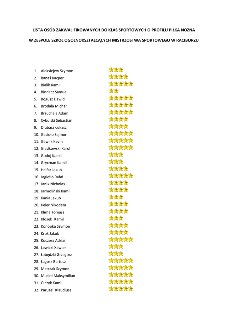 LISTA OSÓB ZAKWALIFIKOWANYCH DO KLAS SPORTOWYCH O PROFILU PIŁKA NOŻNA W ZESPOLE SZKÓŁ OGÓLNOKSZTAŁCĄCYCH MISTRZOSTWA SPORTOWEGO W RACIBORZU 1. Aleksiejew Szymon 2. Banaś Kacper 3. Bialik Kamil 4. Bindacz Samuel 5. Bogusz Dawid 6. Brodala Michał 7. Brzuchala Adam 8. Cybulski Sebastian 9. Dłubacz Łukasz 10. Gasidło Sajmon 11. Gawlik Kevin 12. Gładkowski Karol 13. Godoj Kamil 14. Grycman Kamil 15. Halfar Jakub 16. Jagiełło Rafał 17. Janik Nicholas 18. Jarmoliński Kamil 19. Kania Jakub 20. Keler Nikodem 21. Klima Tomasz 22. Kłosek Kamil 23. Konopka Szymon 24. Krok Jakub 25. Kuczera Adrian 26. Lewicki Xawier 27. Łabędzki Grzegorz 28. Łagosz Bartosz 29. Matczak Szymon 30. Musioł Maksymilian 31. Olczyk Kamil 32. Paruzel Klaudiusz 33. Piszczan Filip 34. Radoń Filip 35. Radoń Seweryn 36. Rajda Mateusz 37. Sichma Olaf 38. Socha Kamil 39. Solich Daniel 40. Szotek Gabriel 41. Szwed Wojciech 42. Szymański Leszek 43. Szymiczek Radosław 44. Świętek Szymon 45. Wasik Alicja 46. Wilusz Miłosz 47. Witt Paweł 48. Wnukowski Wojciech 49. Woch Nikodem 50. Załubski Piotr 51. Żelazko Paweł