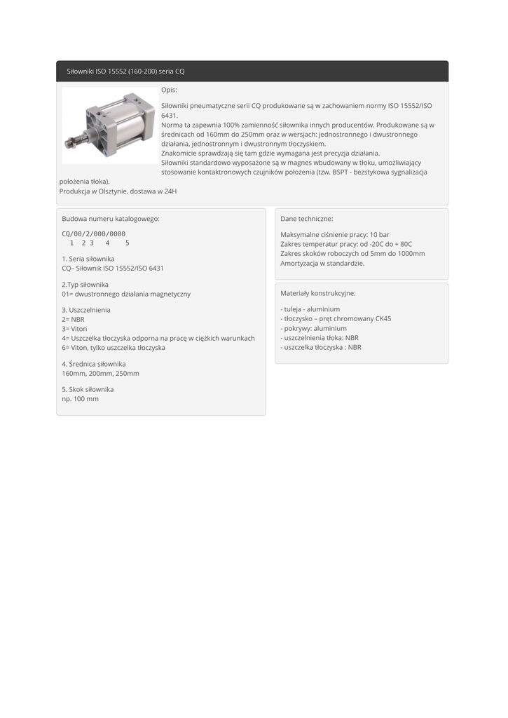 Siłowniki ISO 15552 (160-200) seria CQ Opis: Siłowniki pneumatyczne serii CQ produkowane są w zachowaniem normy ISO 15552/ISO 6431. Norma ta zapewnia 100% zamienność siłownika innych producentów. Produkowane są w średnicach od 160mm do 250mm oraz w wersjach: jednostronnego i dwustronnego działania, jednostronnym i dwustronnym tłoczyskiem. Znakomicie sprawdzają się tam gdzie wymagana jest precyzja działania. Siłowniki standardowo wyposażone są w magnes wbudowany w tłoku, umożliwiający stosowanie kontaktronowych czujników położenia (tzw. BSPT - bezstykowa sygnalizacja położenia tłoka). Produkcja w Olsztynie, dostawa w 24H Budowa numeru katalogowego: Dane techniczne: CQ/00/2/000/0000 1 2 3 4 5 Maksymalne ciśnienie pracy: 10 bar Zakres temperatur pracy: od -20C do + 80C Zakres skoków roboczych od 5mm do 1000mm Amortyzacja w standardzie. 1. Seria siłownika CQ– Siłownik ISO 15552/ISO 6431 2.Typ siłownika 01= dwustronnego działania magnetyczny Materiały konstrukcyjne: 3. Uszczelnienia 2= NBR 3= Viton 4= Uszczelka tłoczyska odporna na pracę w ciężkich warunkach 6= Viton, tylko uszczelka tłoczyska - tuleja - aluminium - tłoczysko – pręt chromowany CK45 - pokrywy: aluminium - uszczelnienia tłoka: NBR - uszczelka tłoczyska : NBR 4. Średnica siłownika 160mm, 200mm, 250mm 5. Skok siłownika np. 100 mm Rysunek techniczny:
