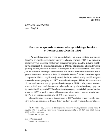 Rejent. rok 8 . nr 2(82) luty 1998 r. Elżbieta Niezbecka Jan Mojak Jeszcze w sprawie statusu wierzycielskiego banków w Polsce Anno Domini 1998 I. W opublikowanym przez nas artykule1 na temat statusu prawnego banków w świetle przepisów ustawy z dnia 6 grudnia 1996 r. o zastawie rejestrowym i rejestrze zastawów2 przedstawiliśmy, między innymi, skutki nowelizacji art. 53 prawa bankowego z 1989 r.3 dla nowego ukształtowania pozycji wierzycielskiej banków w relacjach z ich kontrahentami. Jednakże już po oddaniu naszego opracowania do druku uchwalone zostało nowe prawo bankowe - ustawa z dnia 29 sierpnia 1997 r.4, która weszła w życie 1 stycznia 1998 r., czyli w tej samej dacie, w której miały wejść w życie znowelizowane przepisy art. 53 1-4 prawa bankowego z 1989 r. W konsekwencji znowelizowana wersja prawa bankowego z 1989 r. dotycząca statusu wierzycielskiego banków nie nabrała nigdy mocy obowiązującej, gdyż w tej materii od 1 stycznia 1998 r. obowiązują przepisy rozdziału 8 prawa bankowego z 1997 r. pod tytułem „Szczególne obowiązki i uprawnienia banków", a w szczególności art. 95-98 tejże ustawy. Ukształtowany w prawie bankowym z 1997 r. status wierzycielski banków odbiega znacznie od tego, który nadany został w ramach nowelizacji 1 E. N i e z b e c k a , J. M o j a k , Status prawny banków w świetle przepisów ustawy z dnia 6 grudnia 1996 r. o zastawie rejestrowym i rejestrze zastawów (Dz.U. Nr 149, poz. 703), Rejent 1997, nr U , s , 22 i nast. 2 Dz.U. Nr 140, poz. 703. poz. 359 z późn. zm.). 4 Dz.U. Nr 140, poz. 939. 34 Jeszcze w sprawie statusu wierzycielskiego banków.. prawa bankowego z 1989 r. ustawą o zastawie rejestrowym i rejestrze zastawów. Tym samym czujemy się zobligowani do swoistego uzupełnienia naszych wywodów zawartych w już opublikowanym artykule5 (w jego pkt III i IV). Jednocześnie pragniemy podkreślić, że w pozostałym zakresie nasze rozważania, odnoszące się do statusu wierzycielskiego banków w świetle przepisów ustawy o zastawie rejestrowym i rejestrze zastawów, pozostają w pełni aktualne. Nota bene przedstawione wyżej meandry legislacyjne związane z nowym ukształtowaniem statusu banków w stosunkach obligacyjnych stanowią kolejny przykład wadliwości merytorycznej procedur tworzenia prawa w Polsce lat dziewięćdziesiątych. Na marginesie pragniemy wskazać na dalsze dwa przykłady wadliwości legislacyjnej, których skutki prawne na dzień dzisiejszy trudno jest jeszcze jednoznacznie ocenić. W myśl art. 49 ust. 1 prawa bankowego z 1997 r., banki prowadzą rachunki bankowe dla osób fizycznych i osób prawnych oraz dla jednostek organizacyjnych nie mających osobowości prawnej, o ile posiadają zdolność prawną. Tym samym w przeciwieństwie do przepisów uchylonego prawa bankowego z 1989 r. - nie każdy podmiot gospodarczy będzie mógł mieć prowadzony rachunek bankowy. Warunkiem bowiem jest posiadanie zdolności prawnej przez jednostkę organizacyjną nie mająca osobowości prawnej, np. zdolność taką ma spółka jawna czy komandytowa, nie posiada jej natomiast spółka cywilna. Wydaje się więc, że konstrukcja przyjęta w przepisach prawa bankowego koliduje z innymi ustawami, albowiem rachunki bankowe powinny być prowadzone dla wszystkich podmiotów prowadzących działalność gospodarczą na podstawie ustawy z dnia 23 grudnia 1988 r. o działalności gospodarczej (Dz.U. Nr 41, poz. 324 z późn. zm.), a dosłownie rzecz ujmując - dla każdego przedsiębiorcy. Ta ostatnia ustawa nakłada bowiem na podmioty gospodarcze obowiązek posiadania rachunku bankowego i przeprowadzania rozliczeń pieniężnych za pośrednictwem takiego rachunku. Tym samym obowiązek prawny nałożony przez jedna ustawę nie może być wykonany w świetle przepisów drugiej ustawy. Nadto art. 34 ustawy z dnia 20 sierpnia 1997 r. - Przepisy wprowadzające ustawę o Krajowym Rejestrze Sądowym6 znowelizował prawo bankowe z 1989 r., 5 6 Cytowanym w przypisie 1. Dz.U. Nr 121, poz. 770. 35 Elżbieta Niezbecka, Jan Mojak wprowadzając w miejsce pojęcia „podmiot gospodarczy" pojęcie „przedsiębiorcy", zdefiniowane w art. 36 ustawy z dnia 20 sierpnia 1997 r. o Krajowym Rejestrze Sądowym7. Pojęcie „przedsiębiorca" zostało też wprowadzone do szeregu innych ustaw, między innymi do ustawy z 1988 r. o prowadzeniu działalności gospodarczej. Przepisy prawa bankowego z 1997 r. w ogóle nie używają terminu „przedsiębiorca", uznajązaś dopuszczalność zawarcia umowy, np. rachunku bankowego, kredytowej, przez .jednostkę organizacyjną nie mającą osobowości prawnej, o ile posiada zdolność prawną" (art. 49 ust. 1 i art. 70 ust. 2 prawa bankowego). W każdym razie sytuacja, gdy w ciągu roku 1997 zmieniał się trzykrotnie stan normatywny w zakresie ukształtowania pozycji banków jako wierzycieli w relacjach kontraktowych (wersja 1989, wersja 1996 i wersja 1997), musi być uznana za bulwersującą i - naszym zdaniem - świadczy co najmniej o braku jakiejkolwiek koordynacji w pracach legislacyjnych. II. Prawo bankowe z 1989 r. w art. 53 ust. 1 nadawało dokumentom wystawionym przez bank moc dokumentów urzędowych, stanowiąc, że księgi banków, wyciągi z tych ksiąg podpisane przez banki i opatrzone ich pieczęcią oraz wszelkie w ten sam sposób wystawione oświadczenia zawierające zobowiązania, zwolnienie z zobowiązań, zrzeczenie się praw lub pokwitowanie odbioru należności bądź stwierdzające udzielenie kredytu, jego wysokość i warunki spłaty mają moc prawną dokumentów urzędowych oraz stanowią podstawę do dokonania wpisów w księgach wieczystych i rejestrach publicznych. Przepis ten był dość lakoniczny i przez to kontrowersyjny w swej treści. Odpowiednikiem jego jest obecnie art. 95 prawa bankowego z 1997 r., stanowiący, iż księgi rachunkowe banków, wyciągi z tych ksiąg podpisane przez osoby upoważnione do składania oświadczeń w zakresie praw i obowiązków m