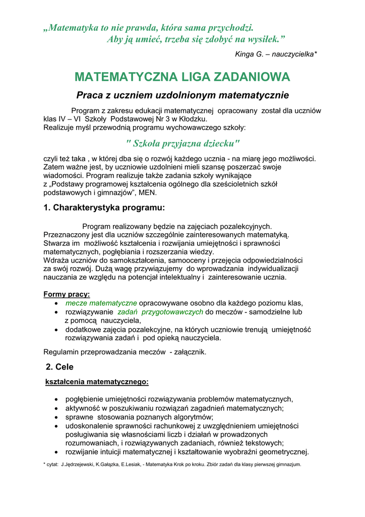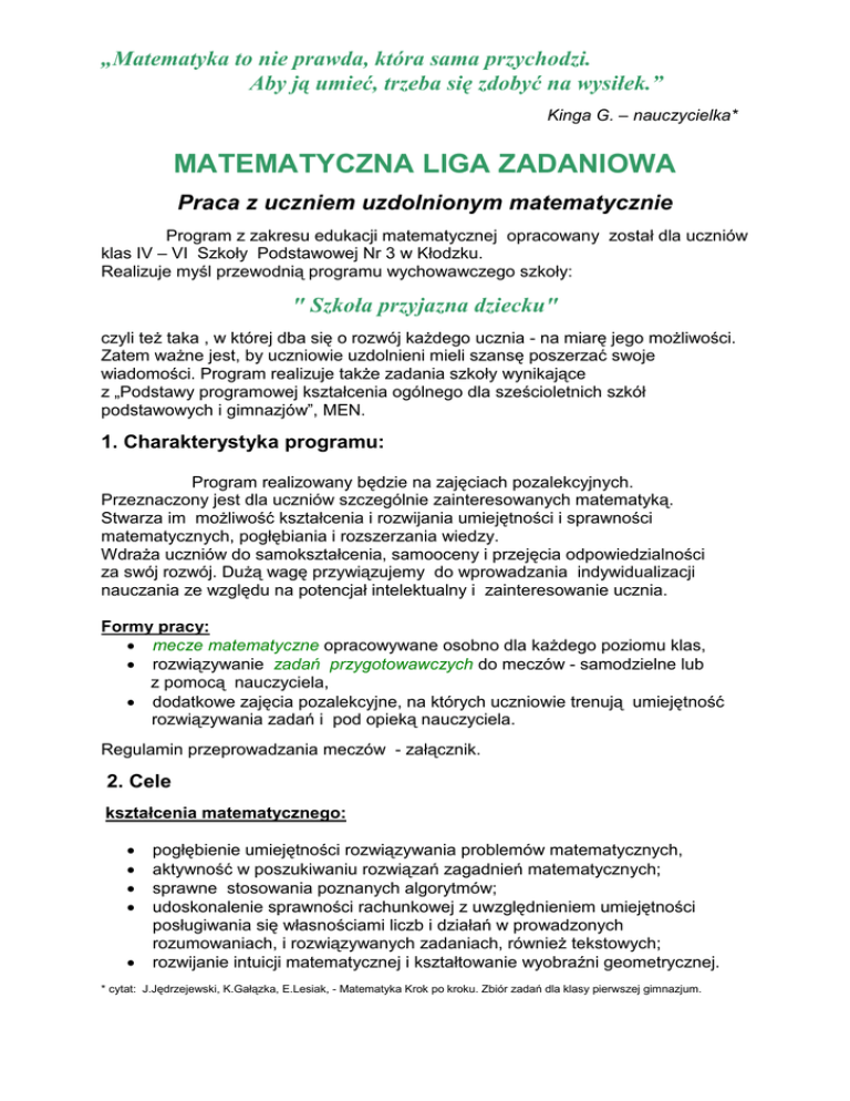 „Matematyka to nie prawda, która sama przychodzi. Aby ją umieć, trzeba się zdobyć na wysiłek.” Kinga G. – nauczycielka* MATEMATYCZNA LIGA ZADANIOWA Praca z uczniem uzdolnionym matematycznie Program z zakresu edukacji matematycznej opracowany został dla uczniów klas IV – VI Szkoły Podstawowej Nr 3 w Kłodzku. Realizuje myśl przewodnią programu wychowawczego szkoły: " Szkoła przyjazna dziecku" czyli teŜ taka , w której dba się o rozwój kaŜdego ucznia - na miarę jego moŜliwości. Zatem waŜne jest, by uczniowie uzdolnieni mieli szansę poszerzać swoje wiadomości. Program realizuje takŜe zadania szkoły wynikające z „Podstawy programowej kształcenia ogólnego dla sześcioletnich szkół podstawowych i gimnazjów”, MEN. 1. Charakterystyka programu: Program realizowany będzie na zajęciach pozalekcyjnych. Przeznaczony jest dla uczniów szczególnie zainteresowanych matematyką. Stwarza im moŜliwość kształcenia i rozwijania umiejętności i sprawności matematycznych, pogłębiania i rozszerzania wiedzy. WdraŜa uczniów do samokształcenia, samooceny i przejęcia odpowiedzialności za swój rozwój. DuŜą wagę przywiązujemy do wprowadzania indywidualizacji nauczania ze względu na potencjał intelektualny i zainteresowanie ucznia. Formy pracy: • mecze matematyczne opracowywane osobno dla kaŜdego poziomu klas, • rozwiązywanie zadań przygotowawczych do meczów - samodzielne lub z pomocą nauczyciela, • dodatkowe zajęcia pozalekcyjne, na których uczniowie trenują umiejętność rozwiązywania zadań i pod opieką nauczyciela. Regulamin przeprowadzania meczów - załącznik. 2. Cele kształcenia matematycznego: • • • • • pogłębienie umiejętności rozwiązywania problemów matematycznych, aktywność w poszukiwaniu rozwiązań zagadnień matematycznych; sprawne stosowania poznanych algorytmów; udoskonalenie sprawności rachunkowej z uwzględnieniem umiejętności posługiwania się własnościami liczb i działań w prowadzonych rozumowaniach, i rozwiązywanych zadaniach, równieŜ tekstowych; rozwijanie intuicji matematycznej i kształtowanie wyobraźni geometrycznej. * cytat: J.Jędrzejewski, K.Gałązka, E.Lesiak, - Matematyka Krok po kroku. Zbiór zadań dla klasy pierwszej gimnazjum. wychowawcze: • • • • • • • uczenie właściwego planowania, organizacji i samodzielności pracy; przyjmowanie coraz większej odpowiedzialności za własny rozwój; uczenie wytrwałości i dociekliwości w wysiłku umysłowym; rozwój sprawności umysłowych oraz osobistych zainteresowań; budowanie więzi międzyludzkich, uczenie skutecznego działania na gruncie zachowania obowiązujących norm; kształtowanie twórczej postawy i krytycyzmu; hartowanie na niepowodzenia. 3. Materiał nauczania i przewidywane osiągnięcia uczniów: Materiał nauczania i osiągnięcia uczniów wynikają z treści określonych w Podstawie programowej kształcenia ogólnego MEN i programu nauczania matematyki w klasach IV –VI szkoły podstawowej realizowanego w naszej szkole Matematyka krok po kroku (zatwierdzony przez MEN , numer dopuszczenia DKW- 4014-53/99 ). Przygotowywane zadania uwzględniają poszerzony stopień trudności. 4. Ewaluacja : • • mecze matematyczne eliminacje szkolne i udział uczniów w Międzyszkolnym Konkursie Matematycznym uczniów kłodzkich szkół podstawowych ( dla klas IV, V, VI ). 5. Literatura: 1. K.Gałązka, R.Pawlak, H.Pawlak, A.WaręŜak - Matematyka „Krok po kroku” – podręczniki i zeszyty ćwiczeń dla klas IV,V,VI.. 2. Z.Krawcewicz - Zadania dla uczniów uzdolnionych matematycznie. 3. Liga zadaniowa. Zbiór zadań dla uczniów zainteresowanych matematyką. Praca zbiorowa pod red. Z. Bobińskiego i P.Nodzyńskiego 4. Wrocławskie Konkursy Matematyczne. Praca zbiorowa 5. D.Zaremba – Matematyka przy okazji. Zadania i testy dla klas IV-VI. 6. G.Rygał – Ciekawe zadania. Ciekawe pomysły. 7. W.Łęska,St.Łęski – Zbiór zadań dla ASA. Materiały pomocnicze dla uczniów uzdolnionych matematycznie dla klas IV, V i VI. 8. T.Gardiner – Matematyczne potyczki. 9. J.Jędrasik – Zaprzyjaźnij się z matematyką. 10. M.Kowalska, E.Pietrasik- Testy z matematyki dla szkoły podstawowej. Klasa IV,V,VI. 11. Matematyka z wesołym Kangurem, wyd. Jersz 12. Matematyka z krzyŜówką – kl. IV, V, VI – praca zbiorowa 13. M.Goutodier - Mały Leonardo, matematyka. oraz podręczniki nauczania matematyki z ubiegłych lat i testy z konkursów matematycznych Kangur, MAT i Alfik. 6. Regulamin Matematycznej Ligi Zadaniowej • Liga Zadaniowa to konkurs matematyczny, w którym moŜe uczestniczyć kaŜdy uczeń z klas IV –VI szkoły Podstawowej Nr3 w Kłodzku. • Uczestnictwo w meczach nie jest obowiązkowe. • Konkurs przygotowywany i przeprowadzany jest osobno dla uczniów z kaŜdego poziomu. • Mecze matematyczne odbywają się raz w miesiącu począwszy od października (6-7 meczy w ciągu roku szkolnego). • Uczniowie przed meczem otrzymują zadania przygotowawcze, które mogą rozwiązywać samodzielnie, konsultując rozwiązania z nauczycielem, rodzicami, innymi uczniami lub na zajęciach dodatkowych pod opieką nauczyciela. • W styczniu i lutym mogą to być zadania przygotowawcze do Powiatowego Konkursu Matematycznego. • Jeden lub dwa mecze w ciągu roku odbywać się będą bez rozwiązywania zadań przygotowawczych. • W styczniu i lutym mogą to być zadania przygotowawcze do Powiatowego Konkursu Matematycznego. • Wyniki prezentowane będą na ściennej gazetce „Matematyka” (II piętro). • Podsumowanie wyników Ligi odbędzie się 2 razy w ciągu roku. • Po podsumowaniu całorocznej pracy, nagrody rzeczowe otrzymają uczniowie, którzy uzyskają 3 najwyŜsze lokaty w kaŜdym poziomie, ponadto zwycięzcy otrzymają oceny celujące z matematyki, jeśli z pozostałych ocen wynika ocena bardzo dobra. • Po eliminacjach szkolnych najlepsi uczniowie reprezentować będą szkołę w konkursi