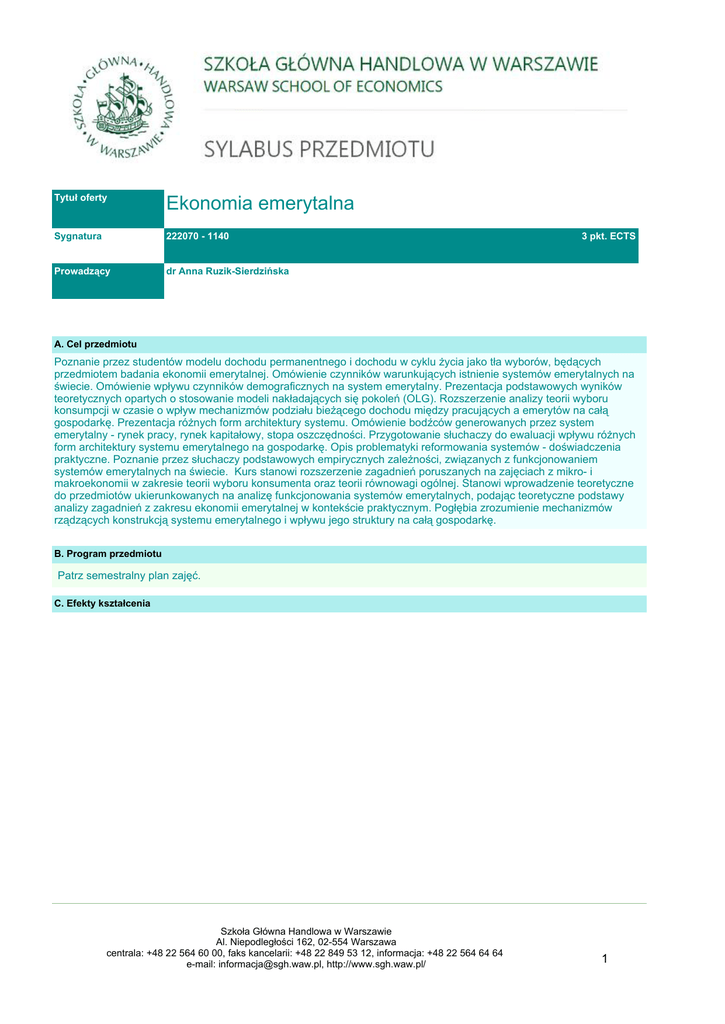 Tytuáoferty Ekonomia emerytalna Sygnatura 222070 - 1140 Prowadzący dr Anna Ruzik-SierdziĔska 3 pkt. ECTS A. Cel przedmiotu Poznanie przez studentów modelu dochodu permanentnego i dochodu w cyklu Īycia jako táa wyborów, bĊdących przedmiotem badania ekonomii emerytalnej. Omówienie czynników warunkujących istnienie systemów emerytalnych na Ğwiecie. Omówienie wpáywu czynników demograficznych na system emerytalny. Prezentacja podstawowych wyników teoretycznych opartych o stosowanie modeli nakáadających siĊpokoleĔ(OLG). Rozszerzenie analizy teorii wyboru konsumpcji w czasie o wpáyw mechanizmów podziaáu bieĪącego dochodu miĊdzy pracujących a emerytów na caáą gospodarkĊ. Prezentacja ryĪnych form architektury systemu. Omówienie bodĨców generowanych przez system emerytalny - rynek pracy, rynek kapitaáowy, stopa oszczĊdnoĞci. Przygotowanie sáuchaczy do ewaluacji wpáywu ryĪnych form architektury systemu emerytalnego na gospodarkĊ. Opis problematyki reformowania systemów - doĞwiadczenia praktyczne. Poznanie przez sáuchaczy podstawowych empirycznych zaleĪnoĞci, związanych z funkcjonowaniem systemów emerytalnych na Ğwiecie. Kurs stanowi rozszerzenie zagadnieĔporuszanych na zajĊciach z mikro- i makroekonomii w zakresie teorii wyboru konsumenta oraz teorii równowagi ogólnej. Stanowi wprowadzenie teoretyczne do przedmiotów ukierunkowanych na analizĊfunkcjonowania systemów emerytalnych, podając teoretyczne podstawy analizy zagadnieĔz zakresu ekonomii emerytalnej w kontekĞcie praktycznym. PogáĊbia zrozumienie mechanizmów rządzących konstrukcjąsystemu emerytalnego i wpáywu jego struktury na caáągospodarkĊ. B. Program przedmiotu Patrz semestralny plan zajĊü. C. Efekty ksztaácenia Szkoáa Gáywna Handlowa w Warszawie Al. NiepodlegáoĞci 162, 02-554 Warszawa centrala: +48 22 564 60 00, faks kancelarii: +48 22 849 53 12, informacja: +48 22 564 64 64 e-mail: [email protected], http://www.sgh.waw.pl/ 1 c.d.Ekonomia emerytalna Wiedza Student powinien byüw stanie: 1. Wymieniüi scharakteryzowaügáywne spoáeczne, kulturowe, polityczne i ekonomiczne przesáanki istnienia systemów emerytalnych. 2. Wymieniügáywne implikacje podstawowych teoretycznych modeli (LCH, OLG) dla konstrukcji systemu emerytalnego i celu jego funkcjonowania. 3. Wymieniügáywne formy architektury systemu emerytalnego ze wzglĊdu na sposób redystrybucji dochodu, wáasnoĞci podmiotów tworzących system. 4. Omówiüwpáyw ryĪnych form architektury systemu na równowagi cząstkowe i równowagĊogólnąw gospodarce, w szczególnoĞci - zatrudnienie i wynagrodzenia czynników produkcji, poziom oszczĊdnoĞci, indywidualny dostĊp do ryĪnych form oszczĊdzania, poziomu kapitaáu w równowadze. 5. Poprawnie zidentyfikowaüefekty zewnĊtrzne generowane przez system emerytalny, 6. omówiüsystem emerytalny jako czĊĞüsystemu zabezpieczenia spoáecznego. 7. Identyfikowaüwpáyw parametrów systemu emerytalnego na gospodarkĊ... UmiejĊtnoĞci Student powinien umieü: 1. Rozumowaüw kategoriach ekonomii emerytalnej. 2. Krytycznie analizowaüartykuáy prasowe o tematyce ekonomicznej poĞwiĊcone systemom emerytalnym, formuáowaüwáasne sądy na ich temat, wskazywaübáĊdy w rozumowaniu. 3. Interpretowaürzeczywiste dane i zjawiska w kategoriach zdobytej wiedzy. 4. Oceniüpropozycje reform systemów emerytalnych, korzystając z poznanych na zajĊciach teorii, w szczególnoĞci - bodĨców generowanych przez system emerytalny. 5. Budowaüw spójny sposób wáasne poglądy na temat funkcjonowania, architektury i zmian form oraz parametrów systemów emerytalnych. 6. PrzeprowadziüanalizĊjakoĞciowąi dynamicznąreakcji gospodarki na reformy systemu emerytalnego. Kompetencje spoáeczne Szkoáa Gáywna Handlowa w Warszawie Al. NiepodlegáoĞci 162, 02-554 Warszawa centrala: +48 22 564 60 00, faks kancelarii: +48 22 849 53 12, informacja: +48 22 564 64 64 e-mail: [email protected], http://www.sgh.waw.pl/ 2 c.d.Ekonomia emerytalna D. Semestralny plan zajĊü 1 Naturalny i zinstytucjonalizowany system emerytalny ("nie ma ĝw. Mikoáaja"). 2 System emerytalny a demografia. 3 PodziaáPKB miĊdzy pokolenie pracujące i pokolenie emerytów. 4 Prywatny a powszechny system emerytalny: konsekwencje spoáeczne, ekonomiczne i finansowe. 5 System emerytalny jako czĊĞüsystemu zabezpieczenia spoáecznego. Spoáeczny cel istnienia systemu emerytalnego a ekonomiczne narzĊdzia jego realizacji. 6 Typologia systemów emerytalnych. 7 Przeciwdziaáanie ubóstwu a alokacja dochodu w cyklu Īycia . 8 Spoáeczne, ekonomiczne i finansowe uáomnoĞci tradycyjnych systemów emerytalnych. 9 Zobowiązania systemu emerytalnego i ich narastanie. 10 Kryzys systemów emerytalnych na Ğwiecie. 11 Efekty zewnĊtrzne powodowane przez systemy emerytalne. 12 Wpáyw parametrów systemów emerytalnych na zachowania na rynku pracy. 13 Reformy emerytalne na Ğwiecie - racjonalizacja systemów i zmiany ich konstrukcji. 14 Finansowanie przejĞcia od tradycyjnego do nowoczesnego systemu emerytalnego. 15 Podsumowanie. E. Literatura podstawowa (obowiązkowe podrĊczniki) N.Barr, P.Diamond, Reforming Pensions: Principles and Policy Choices, Oxford University Press, 2008; D.Blake, Pension Economics, John Wiley&Sons, 2006; M.Góra, System emerytalny, PWE, Warszawa 2003; J.Gruber, D.A. Wise, Social security around the world, University of Chicago Press, 1999. F. Literatura uzupeániająca P.Diamond, Social Security Reform, Oxford University Press, The Lindahl Lectures, 2002; D.Blake, Pension Finance, John Wiley&Sons, 2006; M.Góra, Wpáyw systemu zabezpieczenia spoáecznego na rynek pracy, "Ekonomista" 2003, nr 1, s. 9-20; J.H.Stock, D.A.Wise, Pensions, the Option Value of Work and Retirement, "Econometrica" 1990, tom 58, nr 5, s. 1151-1180. G. NajwaĪniejsze publikacje autora(ów) dotyczące proponowanych zajĊü Retirement Decisions as a Function of Socio-Economic Factors in Central and Eastern European Countries, ENEP