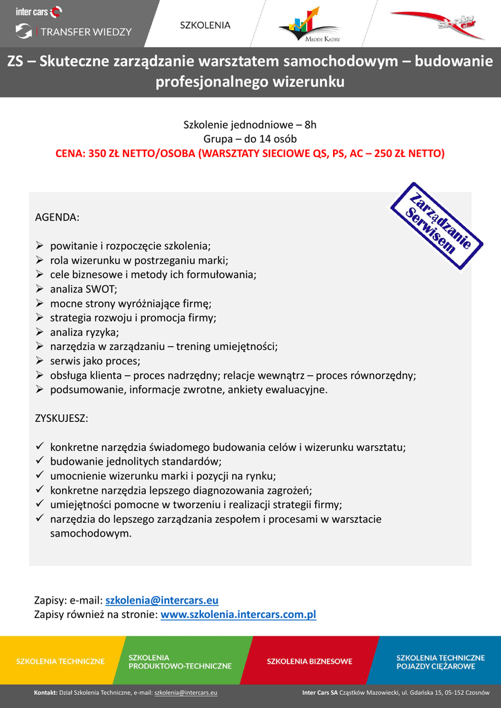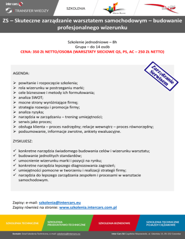 ZS – Skuteczne zarządzanie warsztatem samochodowym – budowanie profesjonalnego wizerunku Szkolenie jednodniowe – 8h Grupa – do 14 osób CENA: 350 ZŁ NETTO/OSOBA (WARSZTATY SIECIOWE QS, PS, AC – 250 ZŁ NETTO) AGENDA: powitanie i rozpoczęcie szkolenia; rola wizerunku w postrzeganiu marki; cele biznesowe i metody ich formułowania; analiza SWOT; mocne strony wyróżniające firmę; strategia rozwoju i promocja firmy; analiza ryzyka; narzędzia w zarządzaniu – trening umiejętności; serwis jako proces; obsługa klienta – proces nadrzędny; relacje wewnątrz – proces równorzędny; podsumowanie, informacje zwrotne, ankiety ewaluacyjne. ZYSKUJESZ: konkretne narzędzia świadomego budowania celów i wizerunku warsztatu; budowanie jednolitych standardów; umocnienie wizerunku marki i pozycji na rynku; konkretne narzędzia lepszego diagnozowania zagrożeń; umiejętności pomocne w tworzeniu i realizacji strategii firmy; narzędzia do lepszego zarządzania zespołem i procesami w warsztacie samochodowym. Zapisy: e-mail: [email protected] Zapisy również na stronie: www.szkolenia.intercars.com.pl Kontakt: Dział Szkolenia Techniczne, e-mail: [email protected] Inter Cars SA Cząstków Mazowiecki, ul. Gdańska 15, 05-152 Czosnów