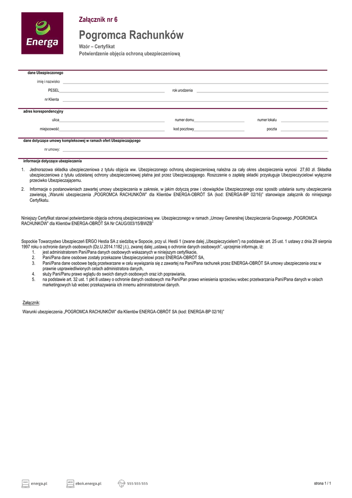 Załącznik nr 6 Pogromca Rachunków Wzór – Certyfikat Potwierdzenie objęcia ochroną ubezpieczeniową dane Ubezpieczonego imię i nazwisko PESEL rok urodzenia nr Klienta adres korespondencyjny ulica numer domu numer lokalu miejscowość kod pocztowy poczta dane dotyczące umowy kompleksowej w ramach ofert Ubezpieczającego nr umowy: informacje dotyczące ubezpieczenia 1. Jednorazowa składka ubezpieczeniowa z tytułu objęcia ww. Ubezpieczonego ochroną ubezpieczeniową należna za cały okres ubezpieczenia wynosi 27,60 zł. Składka ubezpieczeniowa z tytułu udzielanej ochrony ubezpieczeniowej płatna jest przez Ubezpieczającego. Roszczenie o zapłatę składki przysługuje Ubezpieczycielowi wyłącznie przeciwko Ubezpieczającemu. 2. Informacje o postanowieniach zawartej umowy ubezpieczenia w zakresie, w jakim dotyczą praw i obowiązków Ubezpieczonego oraz sposób ustalania sumy ubezpieczenia zawierają „Warunki ubezpieczenia „POGROMCA RACHUNKÓW” dla Klientów ENERGA-OBRÓT SA (kod: ENERGA-BP 02/16)” stanowiące załącznik do niniejszego Certyfikatu. Niniejszy Certyfikat stanowi potwierdzenie objęcia ochroną ubezpieczeniową ww. Ubezpieczonego w ramach „Umowy Generalnej Ubezpieczenia Grupowego „POGROMCA RACHUNKÓW” dla Klientów ENERGA-OBRÓT SA Nr CAUG/003/15/BWZB” Sopockie Towarzystwo Ubezpieczeń ERGO Hestia SA z siedzibą w Sopocie, przy ul. Hestii 1 (zwane dalej „Ubezpieczycielem”) na podstawie art. 25 ust. 1 ustawy z dnia 29 sierpnia 1997 roku o ochronie danych osobowych (Dz.U.2014.1182 j.t.), zwanej dalej „ustawą o ochronie danych osobowych”, uprzejmie informuje, iż: 1. jest administratorem Pani/Pana danych osobowych wskazanych w niniejszym certyfikacie, 2. Pani/Pana dane osobowe zostały przekazane Ubezpieczycielowi przez ENERGA-OBRÓT SA, 3. Pani/Pana dane osobowe będą przetwarzane w celu wywiązania się z zawartej na Pani/Pana rachunek przez ENERGA-OBRÓT SA umowy ubezpieczenia oraz w prawnie usprawiedliwionych celach administratora danych, 4. służy Pani/Panu prawo wglądu do swoich danych osobowych oraz ich poprawiania, 5. na podstawie art. 32 ust. 1 pkt 8 ustawy o ochronie danych osobowych ma Pani/Pan prawo wniesienia sprzeciwu wobec przetwarzania Pani/Pana danych w celach marketingowych lub wobec przekazywania ich innemu administratorowi danych. Załącznik: Warunki ubezpieczenia „POGROMCA RACHUNKÓW” dla Klientów ENERGA-OBRÓT SA (kod: ENERGA-BP 02/16)” strona 1 / 1