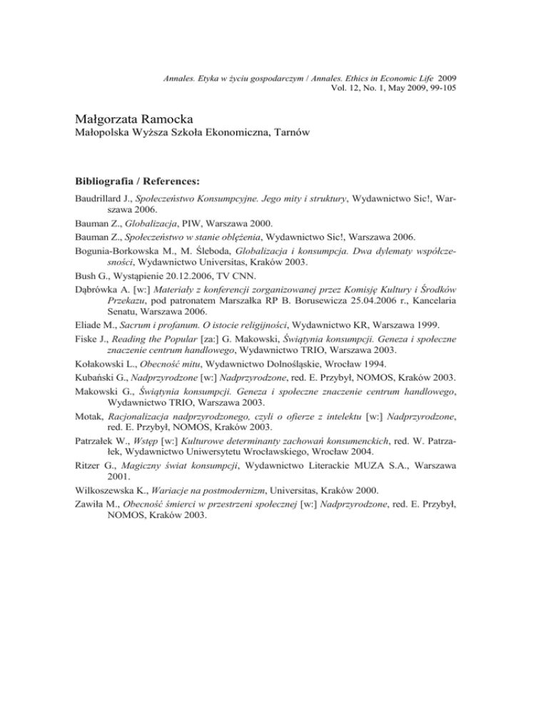 Annales. Etyka w życiu gospodarczym / Annales. Ethics in Economic Life 2009 Vol. 12, No. 1, May 2009, 99-105 Małgorzata Ramocka Małopolska Wyższa Szkoła Ekonomiczna, Tarnów Bibliografia / References: Baudrillard J., Społeczeństwo Konsumpcyjne. Jego mity i struktury, Wydawnictwo Sic!, Warszawa 2006. Bauman Z., Globalizacja, PIW, Warszawa 2000. Bauman Z., Społeczeństwo w stanie oblężenia, Wydawnictwo Sic!, Warszawa 2006. Bogunia-Borkowska M., M. Śleboda, Globalizacja i konsumpcja. Dwa dylematy współczesności, Wydawnictwo Universitas, Kraków 2003. Bush G., Wystąpienie 20.12.2006, TV CNN. Dąbrówka A. [w:] Materiały z konferencji zorganizowanej przez Komisję Kultury i Środków Przekazu, pod patronatem Marszałka RP B. Borusewicza 25.04.2006 r., Kancelaria Senatu, Warszawa 2006. Eliade M., Sacrum i profanum. O istocie religijności, Wydawnictwo KR, Warszawa 1999. Fiske J., Reading the Popular [za:] G. Makowski, Świątynia konsumpcji. Geneza i społeczne znaczenie centrum handlowego, Wydawnictwo TRIO, Warszawa 2003. Kołakowski L., Obecność mitu, Wydawnictwo Dolnośląskie, Wrocław 1994. Kubański G., Nadprzyrodzone [w:] Nadprzyrodzone, red. E. Przybył, NOMOS, Kraków 2003. Makowski G., Świątynia konsumpcji. Geneza i społeczne znaczenie centrum handlowego, Wydawnictwo TRIO, Warszawa 2003. Motak, Racjonalizacja nadprzyrodzonego, czyli o ofierze z intelektu [w:] Nadprzyrodzone, red. E. Przybył, NOMOS, Kraków 2003. Patrzałek W., Wstęp [w:] Kulturowe determinanty zachowań konsumenckich, red. W. Patrzałek, Wydawnictwo Uniwersytetu Wrocławskiego, Wrocław 2004. Ritzer G., Magiczny świat konsumpcji, Wydawnictwo Literackie MUZA S.A., Warszawa 2001. Wilkoszewska K., Wariacje na postmodernizm, Universitas, Kraków 2000. Zawiła M., Obecność śmierci w przestrzeni społecznej [w:] Nadprzyrodzone, red. E. Przybył, NOMOS, Kraków 2003.