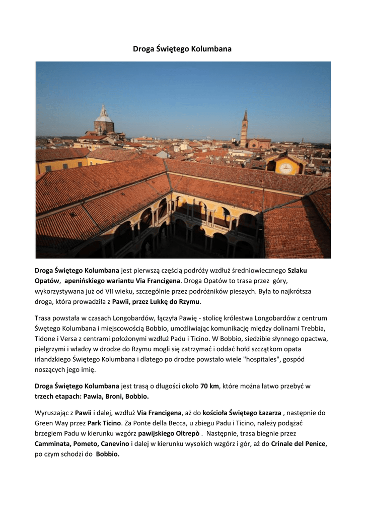Droga Świętego Kolumbana Droga Świętego Kolumbana jest pierwszą częścią podróży wzdłuż średniowiecznego Szlaku Opatów, apenińskiego wariantu Via Francigena. Droga Opatów to trasa przez góry, wykorzystywana już od VII wieku, szczególnie przez podróżników pieszych. Była to najkrótsza droga, która prowadziła z Pawii, przez Lukkę do Rzymu. Trasa powstała w czasach Longobardów, łączyła Pawię - stolicę królestwa Longobardów z centrum Śwętego Kolumbana i miejscowością Bobbio, umożliwiając komunikację między dolinami Trebbia, Tidone i Versa z centrami położonymi wzdłuż Padu i Ticino. W Bobbio, siedzibie słynnego opactwa, pielgrzymi i władcy w drodze do Rzymu mogli się zatrzymać i oddać hołd szczątkom opata irlandzkiego Świętego Kolumbana i dlatego po drodze powstało wiele "hospitales", gospód noszących jego imię. Droga Świętego Kolumbana jest trasą o długości około 70 km, które można łatwo przebyć w trzech etapach: Pawia, Broni, Bobbio. Wyruszając z Pawii i dalej, wzdłuż Via Francigena, aż do kościoła Świętego Łazarza , następnie do Green Way przez Park Ticino. Za Ponte della Becca, u zbiegu Padu i Ticino, należy podążać brzegiem Padu w kierunku wzgórz pawijskiego Oltrepò . Następnie, trasa biegnie przez Camminata, Pometo, Canevino i dalej w kierunku wysokich wzgórz i gór, aż do Crinale del Penice, po czym schodzi do Bobbio. Fascynujące wzgórza pokryte winnicami, lasami kasztanowymi i bukami to tylko niektóre z cech, które składają się na tę fascynującą podróż przez pawijskie Oltrepò i w których powstają liczne produkty enogastronomiczne jak kiełbasa z Varzi, kiełbasa z gęsi z miejscowości Mortara szeroka gama znakomitych wędlin i serów tradycyjnej produkcji. Doskonałe w smaku owoce, warzywa, wino produkowane na wzgórzach Oltrepò, świeże i smaczne makarony, lokalne wyroby piekarnicze i cukiernicze. W celu uzyskania dodatkowych informacji i szczegółów, zapraszamy na strony: www.viefrancigene.org www.viefrancigene.it www.retecamminifrancigeni.eu www.paviaturismo.it www.oltrepopavese.com www.viadegliabati.com JAK DOJECHAĆ: jak dojechać do Pawii: SAMOCHODEM: wyjazd z Bereguardo na autostradę A7 i Casteggio lub Stradella na autostradę A21. POCIĄGIEM: z dworca Milano Centrale pociągi do Pawii kursują co pół godziny. www.trenitalia.it RODZAJ TRASY: CZAS PRZEJŚCIA: KM POZIOM TRUDNOŚCI TRASY: WYSOKOŚĆ NAD POZIOMEM MORZA PIESZA ROWEROWA SAMOCHÓD TRANSPORT PUBLICZNY 20 h 4H / / 70 / / / TRUDNA / / / min. wysokość Pawia: 59 m, max. wysokość Passo del Penice : 1149 m n.p.m., wysokość Bobbio: 272 m