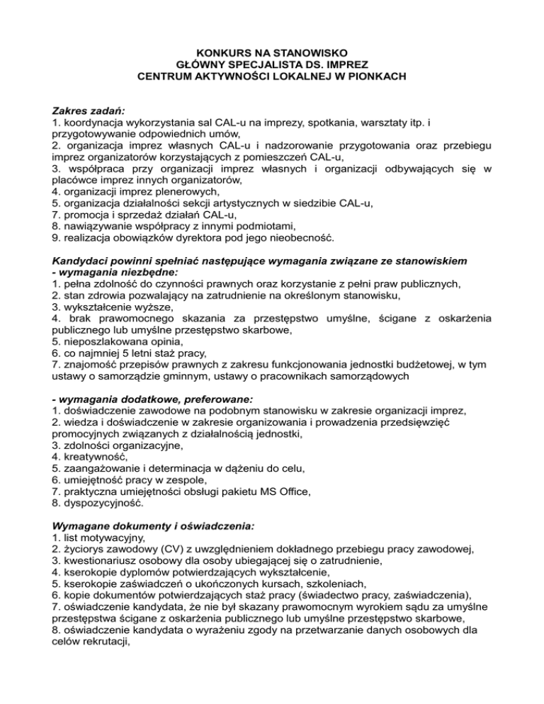 KONKURS NA STANOWISKO GŁÓWNY SPECJALISTA DS. IMPREZ CENTRUM AKTYWNOŚCI LOKALNEJ W PIONKACH Zakres zadań: 1. koordynacja wykorzystania sal CAL-u na imprezy, spotkania, warsztaty itp. i przygotowywanie odpowiednich umów, 2. organizacja imprez własnych CAL-u i nadzorowanie przygotowania oraz przebiegu imprez organizatorów korzystających z pomieszczeń CAL-u, 3. współpraca przy organizacji imprez własnych i organizacji odbywających się w placówce imprez innych organizatorów, 4. organizacji imprez plenerowych, 5. organizacja działalności sekcji artystycznych w siedzibie CAL-u, 7. promocja i sprzedaż działań CAL-u, 8. nawiązywanie współpracy z innymi podmiotami, 9. realizacja obowiązków dyrektora pod jego nieobecność. Kandydaci powinni spełniać następujące wymagania związane ze stanowiskiem - wymagania niezbędne: 1. pełna zdolność do czynności prawnych oraz korzystanie z pełni praw publicznych, 2. stan zdrowia pozwalający na zatrudnienie na określonym stanowisku, 3. wykształcenie wyższe, 4. brak prawomocnego skazania za przestępstwo umyślne, ścigane z oskarżenia publicznego lub umyślne przestępstwo skarbowe, 5. nieposzlakowana opinia, 6. co najmniej 5 letni staż pracy, 7. znajomość przepisów prawnych z zakresu funkcjonowania jednostki budżetowej, w tym ustawy o samorządzie gminnym, ustawy o pracownikach samorządowych - wymagania dodatkowe, preferowane: 1. doświadczenie zawodowe na podobnym stanowisku w zakresie organizacji imprez, 2. wiedza i doświadczenie w zakresie organizowania i prowadzenia przedsięwzięć promocyjnych związanych z działalnością jednostki, 3. zdolności organizacyjne, 4. kreatywność, 5. zaangażowanie i determinacja w dążeniu do celu, 6. umiejętność pracy w zespole, 7. praktyczna umiejętności obsługi pakietu MS Office, 8. dyspozycyjność. Wymagane dokumenty i oświadczenia: 1. list motywacyjny, 2. życiorys zawodowy (CV) z uwzględnieniem dokładnego przebiegu pracy zawodowej, 3. kwestionariusz osobowy dla osoby ubiegającej się o zatrudnienie, 4. kserokopie dyplomów potwierdzających wykształcenie, 5. kserokopie zaświadczeń o ukończonych kursach, szkoleniach, 6. kopie dokumentów potwierdzających staż pracy (świadectwo pracy, zaświadczenia), 7. oświadczenie kandydata, że nie był skazany prawomocnym wyrokiem sądu za umyślne przestępstwa ścigane z oskarżenia publicznego lub umyślne przestępstwo skarbowe, 8. oświadczenie kandydata o wyrażeniu zgody na przetwarzanie danych osobowych dla celów rekrutacji, 9. oświadczenie kandydata o posiadaniu pełnej zdolności do czynności prawnych oraz korzystaniu z pełni praw publicznych, 10. oświadczenie o braku przeciwwskazań zdrowotnych do wykonywania pracy na stanowisku gł. specjalisty ds. imprez. Kopie dokumentów powinny być poświadczone przez kandydata za zgodność z oryginałem. Informacja o metodach i technikach naboru: 1) weryfikacja formalna i merytoryczna nadesłanych aplikacji, 2) rozmowa kwalifikacyjna. Kandydaci spełniający wymagania formalne zostaną powiadomieni na piśmie lub telefonicznie o miejscu i terminie przeprowadzenia rozmowy kwalifikacyjnej. Oferty należy składać do dnia 04.07.2014 r. do godz. 15.00 ( decyduje data wpływu do CAL ). Miejsce składania dokumentów: Centrum Aktywności Lokalnej, ul. Zakładowa 5, 26 – 670 Pionki, pok. nr 3. Dokumenty aplikacyjne należy składać w zaklejonej kopercie z dopiskiem: „Nabór na głównego specjalistę ds. imprez Centrum Aktywności Lokalnej w Pionkach.” Inne informacje: Dokumenty otrzymane po terminie nie będą rozpatrywane, można je odbierać osobiście po zakończeniu procedury naboru w pokoju nr 3 ( nieodebrane nie będą odsyłane ). Dyrektor CAL w Pionkach zastrzega sobie prawo do odwołania konkursu w każdym czasie bez podawania przyczyn. p.o. Dyrektor CAL w Pionkach (-) Anna Rudnicka