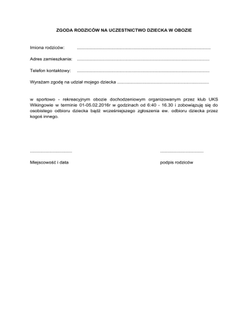 ZGODA RODZICÓW NA UCZESTNICTWO DZIECKA W OBOZIE Imiona rodziców: ......................................................................................................... Adres zamieszkania: ........................................................................................................ Telefon kontaktowy: ........................................................................................................ Wyrażam zgodę na udział mojego dziecka ........................................................................ w sportowo rekreacyjnym obozie dochodzeniowym organizowanym przez klub UKS Wikingowie w terminie 0105.02.2016r w godzinach od 6:40 16.30 i zobowiązuję się do osobistego odbioru dziecka bądź wcześniejszego zgłoszenia ew. odbioru dziecka przez kogoś innego. ................................. .................................. Miejscowość i data podpis rodziców