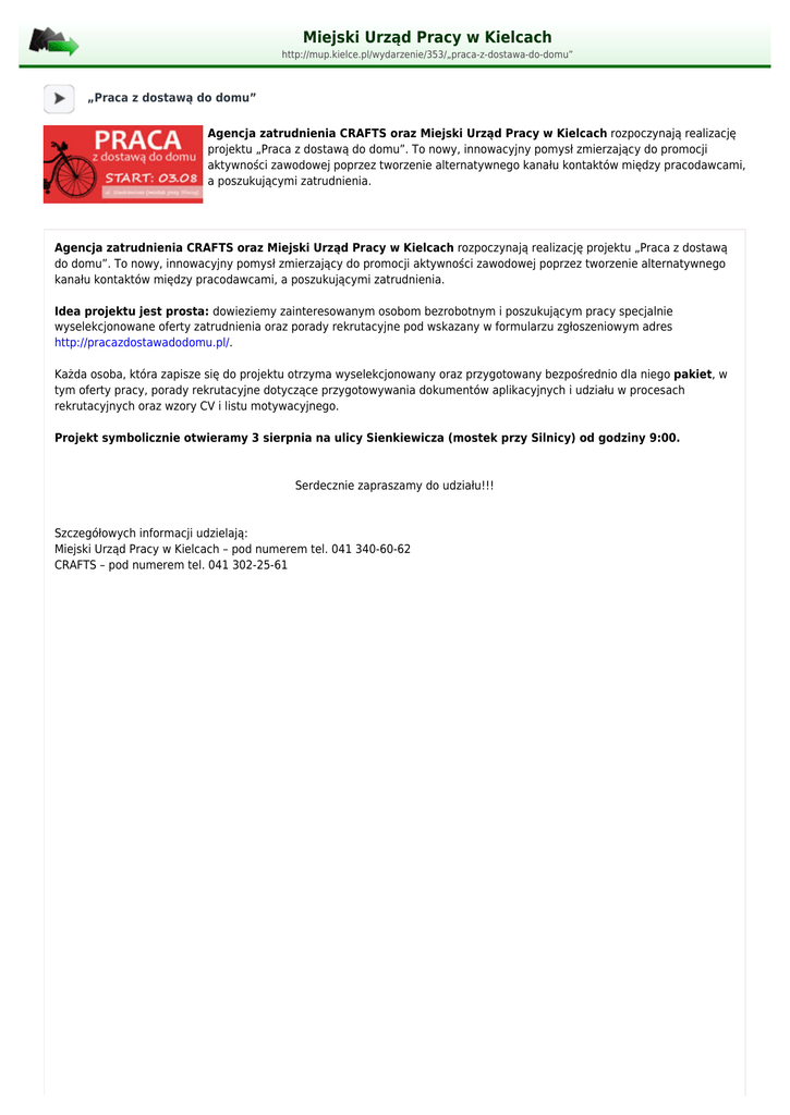 Miejski Urząd Pracy w Kielcach http://mup.kielce.pl/wydarzenie/353/„praca-z-dostawa-do-domu” „Praca z dostawą do domu” Agencja zatrudnienia CRAFTS oraz Miejski Urząd Pracy w Kielcach rozpoczynają realizację projektu „Praca z dostawą do domu”. To nowy, innowacyjny pomysł zmierzający do promocji aktywności zawodowej poprzez tworzenie alternatywnego kanału kontaktów między pracodawcami, a poszukującymi zatrudnienia. Agencja zatrudnienia CRAFTS oraz Miejski Urząd Pracy w Kielcach rozpoczynają realizację projektu „Praca z dostawą do domu”. To nowy, innowacyjny pomysł zmierzający do promocji aktywności zawodowej poprzez tworzenie alternatywnego kanału kontaktów między pracodawcami, a poszukującymi zatrudnienia. Idea projektu jest prosta: dowieziemy zainteresowanym osobom bezrobotnym i poszukującym pracy specjalnie wyselekcjonowane oferty zatrudnienia oraz porady rekrutacyjne pod wskazany w formularzu zgłoszeniowym adres http://pracazdostawadodomu.pl/. Każda osoba, która zapisze się do projektu otrzyma wyselekcjonowany oraz przygotowany bezpośrednio dla niego pakiet, w tym oferty pracy, porady rekrutacyjne dotyczące przygotowywania dokumentów aplikacyjnych i udziału w procesach rekrutacyjnych oraz wzory CV i listu motywacyjnego. Projekt symbolicznie otwieramy 3 sierpnia na ulicy Sienkiewicza (mostek przy Silnicy) od godziny 9:00. Serdecznie zapraszamy do udziału!!! Szczegółowych informacji udzielają: Miejski Urząd Pracy w Kielcach – pod numerem tel. 041 340-60-62 CRAFTS – pod numerem tel. 041 302-25-61