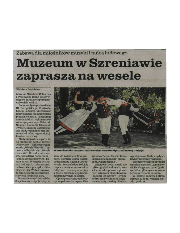 Zabawa dla miłośników muzyki i tańca ludowego Muzeum w Szreniawie zaprasza na wesele Elżbieta Podolska Muzeum Narodowe Rolnictwa i Przemysłu Rolno-Spożyw czego w Szreniawie przygoto wało wiele atrakcji. Sobota upłynie pod znakiem III Europejskiego Festiwalu Sztuki Ludowej. Miłośników muzyki i tańca ludowego czeka prawdziwa uczta. Tym razem oprócz polskich wykonawców zobaczymy zespoły z Białorusi, Niemiec, Holandii, Hiszpanii i Włoch. Imprezę uatrakcyjni gala mody regionalnej oraz prezentacje kuchni regionalnych Eurokucharz 2009. Następnego dnia o godz. 10 na muzealnej scenie zagości widowisko folklorystyczne z cyklu „Wesele Wiejskie". Tym razem odbędzie się „Wesele Łowickie". Udział w nim we zmą prawdziwi narzeczeni Paulina jarmuszkiewicz i Łu kasz Kryga. Wystąpią w stro jach ludowych, stylizowanych na łowickie z początku ubie głego wieku. Widowisko roz pocznie się obrzędami błogo sławienia i żegnania pary. Następnie w asyście drużbów i kapeli narzeczeni pojadą brycz- •A^tJj W szreniawskim muzeum będzie można w weekend poznać ludową tradycję kami do kościoła w Komorni kach. Zawarcie ślubu nastąpi podczas mszy o godz. 13. Po po wrocie nowożeńców z kościoła rozpocznie się uczta weselna. Odegrane zostaną oczepiny, a goście muzealni częstowani będą tradycyjnym kołaczem. Oprawę muzyczno-folklorystyczną widowiska zapewni Re gionalny Zespół Pieśni i Tańca „Boczki Chełmońskie" oraz ze spół „Poligrodzianie". Widzowie będą mogli nie tylko oglądać widowisko we selne, ale także poznać regional nych artystów z okolic Łowicza i zakupić ich wyroby - słynne kodry, czyli wycinanki, wielo barwne hafty i bukiety bibułko wych kwiatów. Atrakcją będą też tradycyjne potrawy wiejskie. Obrzędy weselne poprzedzi wernisaż wystawy „Wesele ło wickie-bogactwo barw" (godz. 10), której głównym motywem będzie ceremonia zaślubin. W sobotę zabawa potrwa od godz. 12 do 18. W niedzielę od 11.30 do 18.