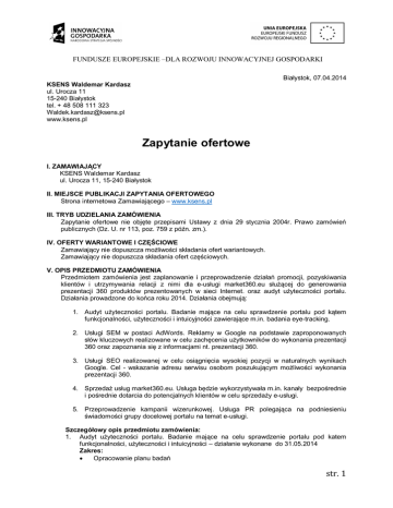 FUNDUSZE EUROPEJSKIE –DLA ROZWOJU INNOWACYJNEJ GOSPODARKI Białystok, 07.04.2014 KSENS Waldemar Kardasz ul. Urocza 11 15-240 Białystok tel. + 48 508 111 323 [email protected] www.ksens.pl Zapytanie ofertowe I. ZAMAWIAJĄCY KSENS Waldemar Kardasz ul. Urocza 11, 15-240 Białystok II. MIEJSCE PUBLIKACJI ZAPYTANIA OFERTOWEGO Strona internetowa Zamawiającego – www.ksens.pl III. TRYB UDZIELANIA ZAMÓWIENIA Zapytanie ofertowe nie objęte przepisami Ustawy z dnia 29 stycznia 2004r. Prawo zamówień publicznych (Dz. U. nr 113, poz. 759 z późn. zm.). IV. OFERTY WARIANTOWE I CZĘŚCIOWE Zamawiający nie dopuszcza możliwości składania ofert wariantowych. Zamawiający nie dopuszcza składania ofert częściowych. V. OPIS PRZEDMIOTU ZAMÓWIENIA Przedmiotem zamówienia jest zaplanowanie i przeprowadzenie działań promocji, pozyskiwania klientów i utrzymywania relacji z nimi dla e-usługi market360.eu służącej do generowania prezentacji 360 produktów prezentowanych w sieci Internet. oraz audyt użyteczności portalu. Działania prowadzone do końca roku 2014. Działania obejmują: 1. Audyt użyteczności portalu. Badanie mające na celu sprawdzenie portalu pod kątem funkcjonalności, użyteczności i intuicyjności zawierające m.in. badania eye-tracking. 2. Usługi SEM w postaci AdWords. Reklamy w Google na podstawie zaproponowanych słów kluczowych realizowane w celu zachęcenia użytkowników do wykonania prezentacji 360 oraz zapoznania się z informacjami nt. prezentacji 360. 3. Usługi SEO realizowanej w celu osiągnięcia wysokiej pozycji w naturalnych wynikach Google. Cel - wskazanie adresu serwisu osobom poszukującym możliwości wykonania prezentacji 360. 4. Sprzedaż usług market360.eu. Usługa będzie wykorzystywała m.in. kanały bezpośrednie i pośrednie dotarcia do potencjalnych klientów w celu sprzedaży e-usługi. 5. Przeprowadzenie kampanii wizerunkowej. Usługa PR polegająca na podniesieniu świadomości grupy docelowej portalu na temat e-usługi. Szczegółowy opis przedmiotu zamówienia: 1. Audyt użyteczności portalu. Badanie mające na celu sprawdzenie portalu pod katem funkcjonalności, użyteczności i intuicyjności – działanie wykonane do 31.05.2014 Zakres: Opracowanie planu badań str. 1 FUNDUSZE EUROPEJSKIE –DLA ROZWOJU INNOWACYJNEJ GOSPODARKI Opracowanie Scenariusza testów Przeprowadzenie Testu z zapisem video Eye tracking Wynik: Raport prac - Podsumowanie badań 2. Usługi SEM w postaci AdWords. Reklamy w Google na podstawie zaproponowanych słów kluczowych realizowane w celu zachęcenia użytkowników do wykonania prezentacji 360 oraz zapoznania się z informacjami nt. prezentacji 360. Usługi SEM prowadzone do końca roku 2014. Zakres: Propozycja słów, fraz kluczowych (min. 10 sztuk w języku polskim oraz min. 3 sztuki w języku angielskim) Wygenerowanie 9500 wejść na portal market360.eu do końca 2014 roku w ramach reklamy adwords 3. Usługi SEO realizowanej w celu osiągnięcia wysokiej pozycji w naturalnych wynikach Google. Usługi SEO prowadzone do końca roku 2014. Cel - wskazanie adresu serwisu osobom poszukującym możliwości wykonania prezentacji 360. Zakres: Przygotowanie bloga – do 31.05.2014 Opracowania artykułów do publikacji na blogu z minimum 1 linkiem wewnętrznym i zewnętrznym - minimum jeden artykuł na tydzień, minimum 40 artykułów do końca roku 2014 Wpisy do katalogów branżowych i ogólnych (w formie elektronicznej) - minimum 5 wpisów/miesiąc, minimum 50 wpisów do końca roku 2014 Promowanie linków w serwisach zewnętrznych z liczbą odsłon min 5 000 użytkowników/miesiąc: minimum 10 serwisów do końca roku 2014 4. Sprzedaż usług market360.eu. Usługa będzie wykorzystywała m.in. kanały bezpośrednie i pośrednie dotarcia do potencjalnych klientów w celu sprzedaży e-usługi. Sprzedaż usług prowadzona do końca roku 2014. Zakres: Kampania telemarketingowa call center – pozyskanie min 200 użytkowników zainteresowanych usługą potwierdzone raportami do końca 2014 r. Opracowanie identyfikacji wizualnej Opracowanie haseł i copywriting w języku polskim i angielskim Opracowanie ulotki/broszury reklamowej oraz produkcja wybranej publikacji w nakładzie minimum 10 000 szt. Opracowanie wytycznych do targów i spotkań biznesowych – 1 kpl. Opracowanie prezentacji multimedialnej – 1 sztuka Udział w dwóch imprezach targowych do końca roku 2014 5. Przeprowadzenie kampanii wizerunkowej. Usługa PR polegająca na podniesieniu świadomości grupy docelowej portalu na temat e-usługi. Kampania wizerunkowa prowadzona do końca roku 2014. Zakres: Opracowanie min. 1 artykułu miesięcznie i rozesłanie go do bazy portali i pism branżowych (10 artykułów do końca roku 2014) Opracowanie i druk dwóch artykułów w prasie tradycyjnej o tematyce e-commerce (pismo lub dział poświęcony tematyce e-commerce). Opracowanie scenariuszy oraz produkcja filmów reklamowych/ informacyjnych/ instruktażowych nt. oferowanej e-usługi – min. 5 sztuk oraz min. 10 minut materiału filmowego (łącznie) str. 2 FUNDUSZE EUROPEJSKIE –DLA ROZWOJU INNOWACYJNEJ GOSPODARKI Stworzenie i prowadzenie do końca 2014 roku profilu społecznościowego w serwisach m.in. Facebook, Twitter, Youtube oraz Vimeo z łączną liczbą wpisów/komentarzy własnych - 100 miesięcznie. VI. TERMIN WYKONANIA ZAMÓWIENIA Termin wykonania przedmiotu zamówienia: od 15.04.2014 do 31.12.2014r. VII. WARUNKI UDZIAŁU W POSTĘPOWANIU ORAZ OPIS SPOSOBU DOKONYWANIA OCENY SPEŁNIANIA TYCH WARUNKÓW 1. Posiadanie wiedzy i doświadczenia Zamawiający uzna ww. warunek za spełniony jeżeli: o Wykonawca wykaże, że w okresie ostatnich 3 lat przed upływem terminu składania ofert, a jeżeli okres działalności jest krótszy – w tym okresie, należycie zrealizował co najmniej jeden projekt na przeprowadzenie działań promocji, e-usługi o wartości nie mniejszej niż 200 000,00 zł. o Wykonawca ma Doświadczenie w zakresie projektowania i imp
