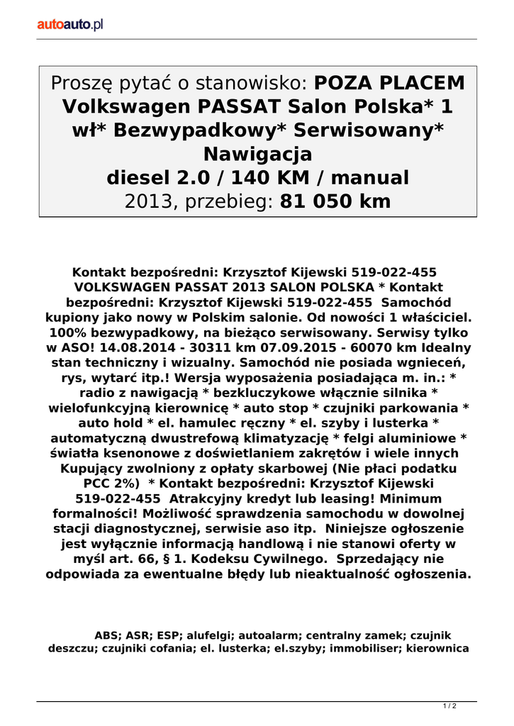 Proszę pytać o stanowisko: POZA PLACEM Volkswagen PASSAT Salon Polska* 1 wł* Bezwypadkowy* Serwisowany* Nawigacja diesel 2.0 / 140 KM / manual 2013, przebieg: 81 050 km Kontakt bezpośredni: Krzysztof Kijewski 519-022-455 VOLKSWAGEN PASSAT 2013 SALON POLSKA * Kontakt bezpośredni: Krzysztof Kijewski 519-022-455 Samochód kupiony jako nowy w Polskim salonie. Od nowości 1 właściciel. 100% bezwypadkowy, na bieżąco serwisowany. Serwisy tylko w ASO! 14.08.2014 - 30311 km 07.09.2015 - 60070 km Idealny stan techniczny i wizualny. Samochód nie posiada wgnieceń, rys, wytarć itp.! Wersja wyposażenia posiadająca m. in.: * radio z nawigacją * bezkluczykowe włącznie silnika * wielofunkcyjną kierownicę * auto stop * czujniki parkowania * auto hold * el. hamulec ręczny * el. szyby i lusterka * automatyczną dwustrefową klimatyzację * felgi aluminiowe * światła ksenonowe z doświetlaniem zakrętów i wiele innych Kupujący zwolniony z opłaty skarbowej (Nie płaci podatku PCC 2%) * Kontakt bezpośredni: Krzysztof Kijewski 519-022-455 Atrakcyjny kredyt lub leasing! Minimum formalności! Możliwość sprawdzenia samochodu w dowolnej stacji diagnostycznej, serwisie aso itp. Niniejsze ogłoszenie jest wyłącznie informacją handlową i nie stanowi oferty w myśl art. 66, § 1. Kodeksu Cywilnego. Sprzedający nie odpowiada za ewentualne błędy lub nieaktualność ogłoszenia. ABS; ASR; ESP; alufelgi; autoalarm; centralny zamek; czujnik deszczu; czujniki cofania; el. lusterka; el.szyby; immobiliser; kierownica 1/2 wielofunkcyjna; komputer; ksenony; podgrzewane fotele; poduszka powietrzna; przyciemniane szyby; radio / CD; nawigacja; tempomat; welurowa tapicerka; wspomaganie kierownicy; światła przeciwmgłowe; tapicerka premium; regulacja wysokości fotela; klimatronik; Przednie koła bezwypadkowy; pierwszy właściciel; serwisowany w ASO Cena: 66 900 PLN brutto Opiekun: Krzysztof Kijewski +48 519 022 455 Al. Krakowska 178, Punkt C 2/2