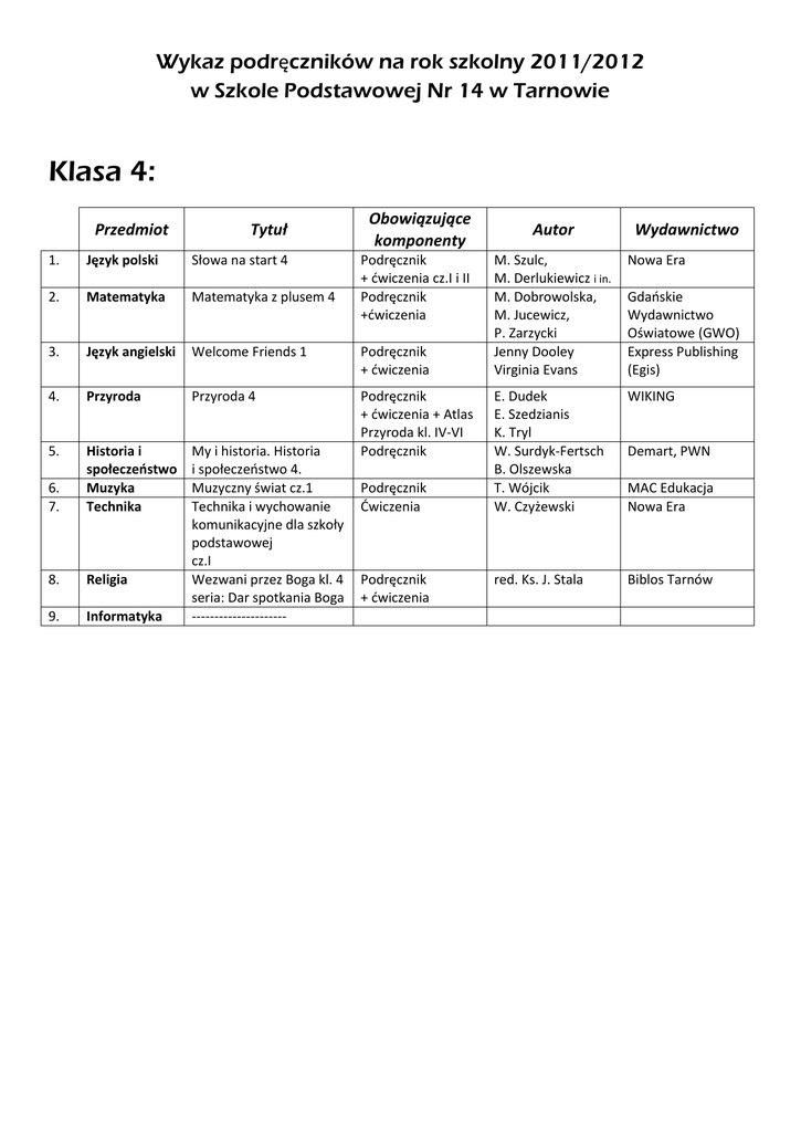 Wykaz podręczników na rok szkolny 2011/2012 w Szkole Podstawowej Nr 14 w Tarnowie Klasa 4: Przedmiot Tytuł Obowiązujące komponenty 1. Język polski Słowa na start 4 Podręcznik + dwiczenia cz.I i II Podręcznik +dwiczenia 2. Matematyka Matematyka z plusem 4 3. Język angielski Welcome Friends 1 Podręcznik + dwiczenia 4. Przyroda Przyroda 4 5. 6. 7. Historia i społeczeństwo Muzyka Technika 8. Religia 9. Informatyka My i historia. Historia i społeczeostwo 4. Muzyczny świat cz.1 Technika i wychowanie komunikacyjne dla szkoły podstawowej cz.I Wezwani przez Boga kl. 4 seria: Dar spotkania Boga --------------------- Podręcznik + dwiczenia + Atlas Przyroda kl. IV-VI Podręcznik Podręcznik Dwiczenia Podręcznik + dwiczenia Autor Wydawnictwo M. Szulc, M. Derlukiewicz i in. M. Dobrowolska, M. Jucewicz, P. Zarzycki Jenny Dooley Virginia Evans Nowa Era E. Dudek E. Szedzianis K. Tryl W. Surdyk-Fertsch B. Olszewska T. Wójcik W. Czyżewski WIKING red. Ks. J. Stala Biblos Tarnów Gdaoskie Wydawnictwo Oświatowe (GWO) Express Publishing (Egis) Demart, PWN MAC Edukacja Nowa Era Wykaz podręczników na rok szkolny 2011/2012 w Szkole Podstawowej Nr 14 w Tarnowie Klasa 5: Przedmiot Tytuł 1. Język polski Słowa na start 5 2. Matematyka Matematyka z plusem 5 3. Język angielski Welcome Friends 2 4. Przyroda Przyroda 5 5. 6. 7. Historia i społeczeństwo Muzyka Technika 8. Plastyka My i historia. Historia i społeczeostwo 5. Muzyczny świat cz.2 Technika i wychowanie komunikacyjne dla szkoły podstawowej cz.II Do Dzieła 9. Religia Wezwani przez Boga kl. 5 seria: Dar spotkania Boga Obowiązujące komponenty Podręcznik + dwiczenia cz.I i II Podręcznik + dwiczenia Podręcznik + dwiczenia Podręcznik + dwiczenia + Atlas Przyroda kl. IV-VI Podręcznik Podręcznik Dwiczenia Autor Wydawnictwo A. Wojciechowska, M. Derlukiewicz M. Dobrowolska, M. Jucewicz, P. Zarzycki Jenny Dooley Virginia Evans E. Dudek E. Szedzianis K. Tryl W. Surdyk-Fertsch B. Szeweluk-Wyrwa T. Wójcik W. Czyżewski Nowa Era Podręcznik z J. Lukas dodatkiem z historii K. Onak sztuki (ten sam obowiązuje w klasie 5 i 6) Podręcznik red. Ks. J. Stala + dwiczenia Gdaoskie Wydawnictwo Oświatowe (GWO) Express Publishing (Egis) WIKING Demart MAC Edukacja Nowa Era Nowa Era (lub stare wydanie: Rożak) Biblos Tarnów Wykaz podręczników na rok szkolny 2011/2012 w Szkole Podstawowej Nr 14 w Tarnowie Klasa 6: Przedmiot Tytuł 1. Język polski Słowa na start 6 2. Matematyka Matematyka z plusem 6 3. Język angielski Welcome Friends 3 4. Przyroda Przyroda 6 5. 6. Historia i My i historia. Historia społeczeństwo i społeczeostwo 6. Plastyka Do Dzieła 7. Religia 8. Informatyka Przemienieni przez Boga kl.6 seria: Drogi przymierza --------------------- Obowiązujące komponenty Autor Wydawnictwo Podręcznik + dwiczenia cz.I i II Podręcznik + dwiczenia A. Wojciechowska, M. Derlukiewicz M. Dobrowolska, P. Zarzycki Nowa Era Podręcznik + dwiczenia Podręcznik + dwiczenia + Atlas Przyroda kl. IV-VI Podręcznik Jenny Dooley Virginia Evans E. Dudek E. Szedzianis K. Tryl W. Surdyk-Fertsch B. Olszewska Podręcznik z J. Lukas dodatkiem z historii K. Onak sztuki (ten sam obowiązuje w klasie 5 i 6) Podręcznik red. Ks. Z. Marek Gdaoskie Wydawnictwo Oświatowe (GWO) Express Publishing (Egis) WIKING Demart, PWN Nowa Era (lub stare wydanie: Rożak) WAM Kraków