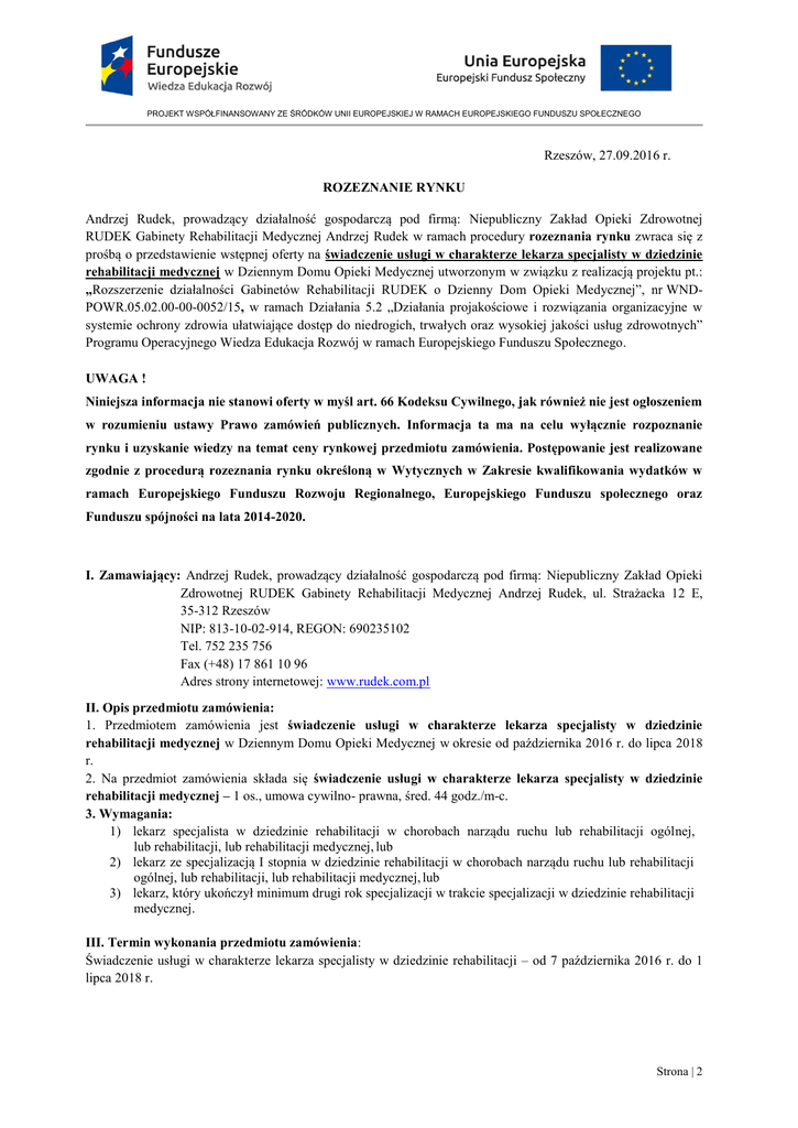 PROJEKT WSPÓŁFINANSOWANY ZE ŚRÓDKÓW UNII EUROPEJSKIEJ W RAMACH EUROPEJSKIEGO FUNDUSZU SPOŁECZNEGO Rzeszów, 27.09.2016 r. ROZEZNANIE RYNKU Andrzej Rudek, prowadzący działalność gospodarczą pod firmą: Niepubliczny Zakład Opieki Zdrowotnej RUDEK Gabinety Rehabilitacji Medycznej Andrzej Rudek w ramach procedury rozeznania rynku zwraca się z prośbą o przedstawienie wstępnej oferty na świadczenie usługi w charakterze lekarza specjalisty w dziedzinie rehabilitacji medycznej w Dziennym Domu Opieki Medycznej utworzonym w związku z realizacją projektu pt.: „Rozszerzenie działalności Gabinetów Rehabilitacji RUDEK o Dzienny Dom Opieki Medycznej”, nr WNDPOWR.05.02.00-00-0052/15, w ramach Działania 5.2 „Działania projakościowe i rozwiązania organizacyjne w systemie ochrony zdrowia ułatwiające dostęp do niedrogich, trwałych oraz wysokiej jakości usług zdrowotnych” Programu Operacyjnego Wiedza Edukacja Rozwój w ramach Europejskiego Funduszu Społecznego. UWAGA ! Niniejsza informacja nie stanowi oferty w myśl art. 66 Kodeksu Cywilnego, jak również nie jest ogłoszeniem w rozumieniu ustawy Prawo zamówień publicznych. Informacja ta ma na celu wyłącznie rozpoznanie rynku i uzyskanie wiedzy na temat ceny rynkowej przedmiotu zamówienia. Postępowanie jest realizowane zgodnie z procedurą rozeznania rynku określoną w Wytycznych w Zakresie kwalifikowania wydatków w ramach Europejskiego Funduszu Rozwoju Regionalnego, Europejskiego Funduszu społecznego oraz Funduszu spójności na lata 2014-2020. I. Zamawiający: Andrzej Rudek, prowadzący działalność gospodarczą pod firmą: Niepubliczny Zakład Opieki Zdrowotnej RUDEK Gabinety Rehabilitacji Medycznej Andrzej Rudek, ul. Strażacka 12 E, 35-312 Rzeszów NIP: 813-10-02-914, REGON: 690235102 Tel. 752 235 756 Fax (+48) 17 861 10 96 Adres strony internetowej: www.rudek.com.pl II. Opis przedmiotu zamówienia: 1. Przedmiotem zamówienia jest świadczenie usługi w charakterze lekarza specjalisty w dziedzinie rehabilitacji medycznej w Dziennym Domu Opieki Medycznej w okresie od października 2016 r. do lipca 2018 r. 2. Na przedmiot zamówienia składa się świadczenie usługi w charakterze lekarza specjalisty w dziedzinie rehabilitacji medycznej – 1 os., umowa cywilno- prawna, śred. 44 godz./m-c. 3. Wymagania: 1) lekarz specjalista w dziedzinie rehabilitacji w chorobach narządu ruchu lub rehabilitacji ogólnej, lub rehabilitacji, lub rehabilitacji medycznej, lub 2) lekarz ze specjalizacją I stopnia w dziedzinie rehabilitacji w chorobach narządu ruchu lub rehabilitacji ogólnej, lub rehabilitacji, lub rehabilitacji medycznej, lub 3) lekarz, który ukończył minimum drugi rok specjalizacji w trakcie specjalizacji w dziedzinie rehabilitacji medycznej. III. Termin wykonania przedmiotu zamówienia: Świadczenie usługi w charakterze lekarza specjalisty w dziedzinie rehabilitacji – od 7 października 2016 r. do 1 lipca 2018 r. Strona | 2 PROJEKT WSPÓŁFINANSOWANY ZE ŚRÓDKÓW UNII EUROPEJSKIEJ W RAMACH EUROPEJSKIEGO FUNDUSZU SPOŁECZNEGO Zamawiający zastrzega sobie prawo do zmiany ewentualnego okresu zatrudnienia osoby świadczącej usługę w charakterze lekarza specjalisty w dziedzinie rehabilitacji. Ewentualny nowy termin wykonania zamówienia będzie podlegał uzgodnieniu z wybranym Wykonawcą. Zamawiający zastrzega sobie prawo do rezygnacji z realizacji całości lub w części przedmiotu zamówienia w przypadku, gdy Zamawiający nie będzie w stanie sfinansować w całości lub w części przedmiotu zamówienia. Wykonawcy z tego tytułu nie będą przysługiwać jakiekolwiek roszczenia finansowe w stosunku do Zamawiającego. IV. Miejsce realizacji zamówienia tj. świadczenia usługi w charakterze lekarza specjalisty w dziedzinie rehabilitacji medycznej: Dzienny Dom Opieki Medycznej, ul. Strażacka 12e, 35-312 Rzeszów. V. Warunki realizacji zamówienia do zapewnienia, których zobowiązany jest Wykonawca: 1. Zakres czynności w ramach świadczenia usługi w charakterze lekarza specjalisty w dziedzinie rehabilitacji medycznej: 1) zapewnienie konsultacji po przyjęciu i przed wypisaniem pacjenta (uczestnika projektu*) oraz w razie potrzeby; 44 h/m-c 2) określenie występowania niewydolności serca (skala niewydolności krążenia wg New York Heart Association, NYHA); badanie powinno być wykonane przez lekarza po przyjęciu i przed wypisaniem *Uczestnicy projektu „Rozszerzenie działalności Gabinetów Rehabilitacji RUDEK o Dzienny Dom Opieki Medycznej” tj. 60 osób niesamodzielnych (poziom samodzielności w skali Barthel: 40-65 pkt), w tym m.in. 75% pow. 65 r.ż. (45 os., w tym 27K, 18M), których stan zdrowia nie pozwala na pozostawanie wyłącznie pod opieką podstawowej opieki zdrowotnej i ambulatoryjnej opieki specjalistycznej a jednocześnie nie wymagają całodobowego nadzoru lekarskiego i pielęgniarskiego realizowanego w trybie stacjonarnym, tj. - pacjenci bezpośrednio po przebytej hospitalizacji, których stan zdrowia wymaga wzmożonej opieki pielęgniarskiej, nadzoru nad terapią farmakologiczną, kompleksowych działań usprawniających i przeciwdziałających postępującej niesamodzielności oraz wsparcia i edukacji zdrowotnej a także doradztwa w zakresie organizacji opieki i leczenia osoby niesamodzielnej; - pacjenci, którym w okresie ostatnich 12 m-cy udzielone zostały świadczenia zdrowotne z zakresu leczenia szpitalnego, mieszkańców woj. podkarpackiego, powiatów: rzeszowskiego, łańcuckiego, strzyżowskiego, ropczycko – sędziszowskiego oraz miasta Rzeszowa. Ok. 10% uczestników projektu stanowić będą osoby niepełnosprawne 3) wchodzenie w skład Wielodyscyplinarnego Zespołu Terapeutycznego. W skład Wielodyscyplinarnego Zespołu Terapeutycznego funkcjonującego w Dziennym Domu Opieki Medycznej wchodzić będą: - lekarz specjalista w dziedzinie rehabilitacji medycznej, - lekarz specjalista w dziedzinie geriatrii, - pielęgniarka pełniąca funkcję kierownika ze
