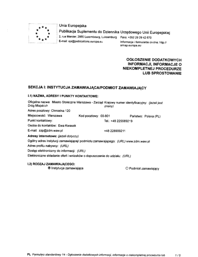 PL Formu/arz standardowy 14 - Ogloszenie dodatkowych informacji, informacje o niekompletnej procedurze lub