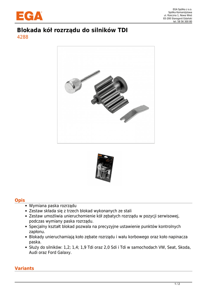 EGA Spółka z o.o. Spółka Komandytowa ul. Rzeczna 1, Nowa Wieś 83-200 Starogard Gdański tel. 58 56 300 80 Blokada kół rozrządu do silników TDI 4288 Opis Wymiana paska rozrządu Zestaw składa się z trzech blokad wykonanych ze stali Zestaw umożliwia unieruchomienie kół zębatych rozrządu w pozycji serwisowej, podczas wymiany paska rozrządu. Specjalny kształt blokad pozwala na precyzyjne ustawienie punktów kontrolnych zapłonu. Blokady unieruchamiają koło zębate rozrządu i wału korbowego oraz koło napinacza paska. Służy do silników: 1,2; 1,4; 1,9 Tdi oraz 2,0 Sdi i Tdi w samochodach VW, Seat, Skoda, Audi oraz Ford Galaxy. Variants 1/2 EGA Spółka z o.o. Spółka Komandytowa ul. Rzeczna 1, Nowa Wieś 83-200 Starogard Gdański tel. 58 56 300 80 No. Catalog no. 1 4288 EAN 2/2 Powered by TCPDF (www.tcpdf.org)