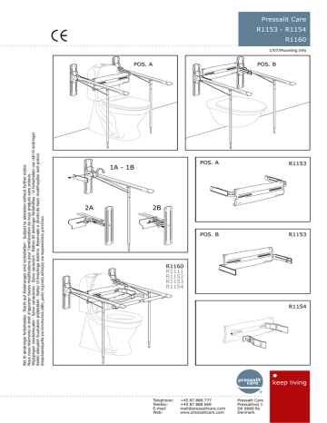Ret til ændringer forbeholdes · Recht auf Änderungen sind vorbehalten · Subject to alteration without further notice Nous nous réservons le droit d’apporter toutes modifications pour l’amélioration de nous produits sans préavis. Wijzigingen voorbehouden · Salvo variaciones · Salvo variazioni · Rätten till ändringar förbehålles · Vi forbeholder oss rett til endringer Kaikki oikeudet muutoksiin pidätetään · Rettur til breytinga áskilinn. Reservado o direito de fazer modificações sem prévio EπιφvλασσÞµεθα για εκτνπωτικά γάθη, µικέσ τεχνικέσ αλλαγέσ και παρεκκλίσεισ µοντέλων. Pressalit Care R1153 - R1154 R1160 1/07/Mounting Info POS. A 2A POS. B 1A - 1B 2B Telephone: Telefax: E-mail: Web: POS. A R1153 POS. B R1153 R1160 R1111 R1152 R1153 R1154 R1154 pressalit care ® +45 87 888 777 +45 87 888 669 [email protected] www.pressalitcare.com Pressalit Care Pressalitvej 1 DK 8680 Ry Denmark