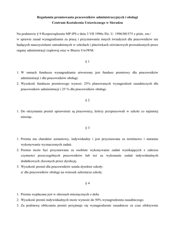 Regulamin premiowania pracowników administracyjnych i obsługi Centrum Kształcenia Ustawicznego w Sieradzu Na podstawie § 9 Rozporządzenia MP iPS z dnia 3 VII 1996r./Dz. U. 1996/80/375 z póżn. zm./ w sprawie zasad wynagradzania za pracę i przyznawania innych świadczeń dla pracowników nie będących nauczycielami zatrudnionych w szkołach i placówkach oświatowych prowadzonych przez organy administracji rządowej oraz w Biurze UwiWM. §1 1. W ramach funduszu wynagradzania utworzony jest fundusz premiowy dla pracowników administracji i dla pracowników obsługi. 2. Wysokość funduszu premiowego wynosi: 25% planowanych wynagrodzeń zasadniczych dla pracowników administracji i 25 % dla pracowników obsługi. §2 1. Do otrzymania premii uprawnieni są pracownicy, którzy przepracowali w szkole co najmniej miesiąc. §3 1. Premia ma charakter uznaniowy, indywidualny i jest przyznawana za terminowe i staranne wykonywanie wyznaczonych zadań. 2. Premia może być przyznawana za osobiste wykonywanie zadań wynikających z zakresu czynności poszczególnych pracowników lub też za wykonanie zadań indywidualnych dodatkowych zleconych przez dyrekcję. 3. Wysokość premii dla pracowników ustala dyrektor szkoły: a/ dla pracowników obsługi na wniosek sekretarza szkoły. §4 1. Premia wypłacana jest w okresach miesięcznych z dołu. 2. Wysokość premii indywidualnych może wynosić do 50% wynagrodzenia zasadniczego. 3. Za podstawę obliczania premii przyjmuje się wynagrodzenie zasadnicze za czas efektywnie przepracowany. §5 Przy podejmowaniu decyzji o przyznaniu premii będą stosowane następujące kryteria ogólne oceny pracowników: – przestrzeganie dyscypliny pracy, – jakość wykonywanej pracy, – przestrzeganie zasad bhp i p.poż. – zachowanie właściwej postawy, zarówno wobec przełożonych jak i innych pracowników, słuchaczy oraz interesantów szkoły, – zachowanie społecznej postawy wobec wszelkich przejawów naruszenia praworządności i zasad współżycia społecznego, – dbałość o mienie szkoły, – staranne i dokładne wykonywanie powierzonych zadań. §6 Premia ulega zmniejszeniu na skutek: 1. niestarannego i nierzetelnego wykonywania zadań- nie mniej niż 10% 2.nieusprawiedliwionych, częstych spóżnień do pracy pracowników administracji i obsługi do 20% 3. samowolne opuszczenie stanowiska pracy – pracownicy administracji i obsługi do 20% 4. nie przestrzegania zasad współżycia społecznego – pracownicy administr. i obsługi do 20% §7 W przypadku naruszenia porządku i dyscypliny pracy a w szczególności: -nie wypełnienie powierzonych obowiązków lub wykonywanie ich niedbale, -zakłócenie pracy poprzez naruszenie zasad współżycia społecznego, -naruszenie zasad praworządności, -nie wykonywanie poleceń pracodawcy, -nieprzestrzeganie zasad dyscypliny pracy, -spożycia alkoholu w godzinach pracy, -świadomego niszczenia mienia szkolnego, -lekceważenie przepisów bhp i p.poż. -nieusprawiedliwionej nieobecności w pracy – kradzieży mienia społecznego, – działanie na szkodę szkoły, – otrzymanie kary porządkowej na pismie pracownik zostaje pozbawiony premii całkowicie. §8 Postanowienia niniejszego regulaminu mogą być rozszerzone lub zmniejszone z zachowaniem wcześniejszego zawiadomienia pracowników w okresie 1 miesiąca. §9 Regulamin wchodzi w życie po uprzednim podaniu do wiadomości wszystkich pracowników z dniem 5.04.2001r.