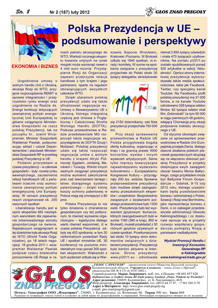 Str. 8 Nr 2 (187) luty 2012 Polska Prezydencja w UE – podsumowanie i perspektywy EKONOMIA I BIZNES Uzgodnienie umowy o wolnym handlu Unii z Ukrainą, akcesja Rosji do WTO, przyjęcie rozporządzenia REMIT w sprawie integralności i przejrzystości rynku energii oraz uzgodnienie na Radzie ds. Energii konkluzji dotyczących zewnętrznej polityki energetycznej Unii Europejskiej to główne osiągnięcia Ministerstwa Gospodarki na rzecz polskiej Prezydencji, tak na początku br., ocenił W icepremier, Minister Gospodarki Waldemar Pawlak, podsumowując wkład i udział Departamentów i placówek Ministerstwa Gospodarki RP w przebieg polskiej Prezydencji w UE . Polskimi priorytetami w czasie prezydencji – w zakresie gospodarki – były: rozwój rynku wewnętrznego, zacieśnienie relacji handlowych UE z państwami trzecimi oraz wzmocnienie zewnętrznej polityki energetycznej Unii Europejskiej. W ramach prezydencji resort zorganizował ok. 200 owocnych spotkań. Liberalizacja handlu jest w opinii ekspertów MG niezbędnym warunkiem dla zapewnienia zrównoważonego wzrostu gospodarczego na świecie. Największym osiągnięciem w tej dziedzinie była akcesja Rosji do WTO (World Trade Organization), po 18 latach negocjacji. 16 grudnia 2011 r. wicepremier Waldemar Pawlak podpisał cztery bilateralne porozumienia UE-Rosja w ra- mach pakietu akcesyjnego do WTO. Wartość rocznego eksportu towarów unijnych na rynek rosyjski może wzrosnąć nawet o 4 mld euro rocznie. Przystąpienie Rosji do Organizacji zapewni przejrzyste relacje handlowe z tym krajem i jego partnerami, oparte na regułach obowiązujących wszystkich członków WTO. Dzięki staraniom polskiej prezydencji udało się także sfinalizować negocjacje ws. Umowy o Stowarzyszeniu UE z Ukrainą, którego integralną częścią jest Umowa o Pogłębionej i Całościowej Strefie W olnego Handlu (DCFTA). Podczas przewodnictwa w Radzie przedstawiciele MG rozpoczęli także negocjacje ws. przystąpienia do DCFTA Gruzji i Mołdawii. Polskiej prezydencji udało się także rozpocząć negocjacje umów o wolnym handlu z krajami Afryki Północnej: Egiptem, Jordanią, Marokiem i Tunezją. Wśród innych ważnych osiągnięć prezydencji można wymienić zakończenie prac nad stworzeniem taniego i łatwo dostępnego systemu patentowego – dzięki której koszty ochrony patentowej w Polsce mają się zmniejszyć o 80 proc. Polska Prezydencja to nie tylko działania o charakterze gospodarczym czy też politycznym, to również wyzwanie organizacyjno – logistyczne dlatego warto również wspomnieć, iż w czasie polskiej Prezydencji odbyły się 452 spotkania, w tym 20 nieformalnych posiedzeń Rady UE i spotkań ministrów UE, 30 konferencji na poziomie ministerialnym oraz ponad 300 spotkań eksperckich. Większość z tych wydarzeń odbyła się w War- szawie, Sopocie, Wrocławiu, Krakowie i Poznaniu. W Brukseli odbyło się 1940 spotkań, m.in. rady i komitety. W sumie na spotkania związane z prezydencją przyjechało do Polski około 30 tysięcy delegatów, akredytowało niemal 2 850 tysięcy odwiedzin i miała 470 tysiącach użytkowników. Na portalu pl2011.eu zostało opublikowanych ponad 500 artykułów w sekcji ‘Aktualności’. Oprócz strony internetowej prezydencja wykorzystywała także media społecznościowe, takie jak Facebook, Twitter, czy specjalny kanał Youtube. Na Facebooku profil polskiej prezydencji ma 31 000 fanów, a na kanale Youtube odnotowano 328 tysiące odsłon filmów. 62 tysiące odsłon miał film „Dobrodošli” (w tym 50 000 w ciągu pierwszych 48 godzin), witający Chorwację przy okazji podpisania traktatu akcesyjnego z UE. Od stycznia obowiązki związane ze sprawowaniem przewodnictwa w Radzie Unii Europejskiej przejęła Dania, dlatego obecne działania polskich placówek gospodarczych skupiają się na włączeniu dokonań polskiej Prezydencji w projekty obejmujące swym zasięgiem obszar basenu Morza Bałtyckiego, czego przykładem może być Bałtyckie Forum Gospodarcze – Gdańsk, 9-10 luty 2012 roku, którego uczestnikami będą przedstawiciele biznesu i administracji z Polski, Szwecji i Rosji oraz Bornholmu, jako reprezentacja biznesu z Danii, o co zabiegali przedstawiciele administracji Obwodu Kaliningradzkiego i co doskonale wpisuje się w projekty rozwoju współpracy gospodarczej pomiędzy Rosją a państwami nadbałtyckimi. się 2150 dziennikarzy, zaś flota prezydencji przejechała 793 000 km. Przy okazji sprawowania przewodnictwa w Radzie UE Polska przygotowała bogatą ofertę kulturalną, organizując w kraju i za granicą prawie 4000 koncertów, wystaw i innych wydarzeń artystycznych. Same tylko imprezy towarzyszące najważniejszemu wydarzeniu kulturalnemu – Europejskiemu Kongresowi Kultury – przyciągnęły 200 tys. widzów. Sprawne przeprowadzenie prezydencji było możliwe dzięki zaangażowaniu przeszkolonych ekspertów i urzędników. Bezpośrednio związanych z działaniami polskiego przewodnictwa było 1200 osób. Prezydencja było też wyzwaniem językowym: tłumacze, których zaangażowanych było w sumie 1160 (360 w kraju, 800 w Brukseli), musieli przekładać z 30 różnych języków używanych w czasie spotkań. Przetłumaczono też około 10 tysięcy stron dokumentów związanych z dziaWydział Promocji Handlu i łaniami prezydencji. Prezydencja Inwestycji Konsulatu była bardzo aktywna w InterGeneralnego RP necie. Strona prezydencji w Kaliningradzie www.pl2011.eu - odnotowała www.kaliningrad.trade.gov.pl „ГОЛОС С ПРЕГОЛИ” – ежемесячная газета Общества Польской культуры Калининградской области. Учредитель и издатель – газета „Голос с Преголи”, свидетельство ПИ № 4-131 от 29.07.2002 г. Главный редактор: Мария Лавринович, моб. тел. в Польше +48 601 057 820 Dofinansowano ze środków 