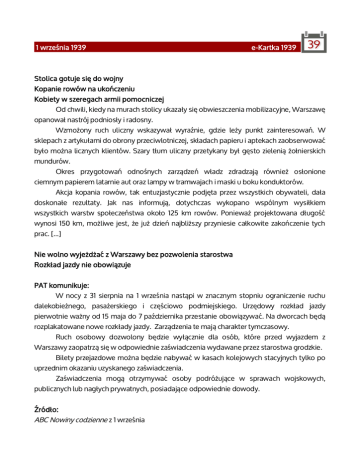 1 września 1939 e-Kartka 1939 Stolica gotuje się do wojny Kopanie rowów na ukończeniu Kobiety w szeregach armii pomocniczej Od chwili, kiedy na murach stolicy ukazały się obwieszczenia mobilizacyjne, Warszawę opanował nastrój podniosły i radosny. Wzmożony ruch uliczny wskazywał wyraźnie, gdzie leży punkt zainteresowań. W sklepach z artykułami do obrony przeciwlotniczej, składach papieru i aptekach zaobserwować było można licznych klientów. Szary tłum uliczny przetykany był gęsto zielenią żołnierskich mundurów. Okres przygotowań odnośnych zarządzeń władz zdradzają również osłonione ciemnym papierem latarnie aut oraz lampy w tramwajach i maski u boku konduktorów. Akcja kopania rowów, tak entuzjastycznie podjęta przez wszystkich obywateli, dała doskonałe rezultaty. Jak nas informują, dotychczas wykopano wspólnym wysiłkiem wszystkich warstw społeczeństwa około 125 km rowów. Ponieważ projektowana długość wynosi 150 km, możliwe jest, że już dzień najbliższy przyniesie całkowite zakończenie tych prac. […] Nie wolno wyjeżdżać z Warszawy bez pozwolenia starostwa Rozkład jazdy nie obowiązuje PAT komunikuje: W nocy z 31 sierpnia na 1 września nastąpi w znacznym stopniu ograniczenie ruchu dalekobieżnego, pasażerskiego i częściowo podmiejskiego. Urzędowy rozkład jazdy pierwotnie ważny od 15 maja do 7 października przestanie obowiązywać. Na dworcach będą rozplakatowane nowe rozkłady jazdy. Zarządzenia te mają charakter tymczasowy. Ruch osobowy dozwolony będzie wyłącznie dla osób, które przed wyjazdem z Warszawy zaopatrzą się w odpowiednie zaświadczenia wydawane przez starostwa grodzkie. Bilety przejazdowe można będzie nabywać w kasach kolejowych stacyjnych tylko po uprzednim okazaniu uzyskanego zaświadczenia. Zaświadczenia mogą otrzymywać osoby podróżujące w sprawach wojskowych, publicznych lub nagłych prywatnych, posiadające odpowiednie dowody. Źródło: ABC Nowiny codzienne z 1 września