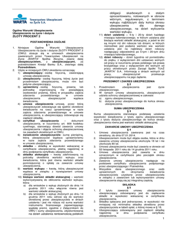 obligacji skarbowych o stałym oprocentowaniu, notowanych w obrocie wtórnym, regulowanym, z terminem wykupu najbliŜszym daty końca okresu ubezpieczenia dla danego ubezpieczonego, na dzień wyliczenia wartości wykupu. Ogólne Warunki Ubezpieczenia Ubezpieczenie na Ŝycie i doŜycie 11) dzień ustalenia – 5-ty i 20-ty dzień kaŜdego miesiąca kalendarzowego, w którym ustalana jest bieŜąca wartość składki alokacyjnej ,a jeŜeli te dni są innymi niŜ dni robocze lub dniami, w których niemoŜliwe jest podanie wartości ww. wartość ustalana jest na najbliŜszy dzień roboczy następujący odpowiednio po 5-tym i 20-tym dniu miesiąca kalendarzowego, 12) dzień roboczy – dzień tygodnia od poniedziałku do piątku, z wyłączeniem dni ustawowo wolnych od pracy w rozumieniu prawa polskiego lub prawa brytyjskiego oraz z wyłączeniem dni wolnych od pracy określonych przez Zarząd Spółki TUnś „WARTA” S.A.. Informację o dniach wolnych od pracy, ubezpieczyciel przekazuje ubezpieczającemu na jego Ŝądanie. ZŁOTY PROCENT 2 1. 2. POSTANOWIENIA OGÓLNE §1 Niniejsze Ogólne Warunki Ubezpieczenia Ubezpieczenie na Ŝycie i doŜycie ZŁOTY PROCENT 2 (OWU) stosuje się w umowach ubezpieczenia zawieranych przez Towarzystwo Ubezpieczeń na śycie „WARTA” Spółka Akcyjna, zwane dalej ubezpieczycielem, z ubezpieczającymi, za pośrednictwem Kredyt Banku S.A., zwanego dalej Pośrednikiem. UŜyte w niniejszych OWU określenia oznaczają: 1) ubezpieczający - osobę fizyczną, zawierającą umowę ubezpieczenia, 2) ubezpieczony - osobę fizyczną, której Ŝycie jest przedmiotem ubezpieczenia, moŜe nim być jedynie ubezpieczający, 3) uprawniony - osobę fizyczną, prawną lub jednostkę organizacyjną nie posiadającą osobowości prawnej, której w przypadku zajścia zdarzenia przewidzianego w umowie ubezpieczenia ubezpieczyciel wypłaca świadczenie, 4) umowa ubezpieczenia - umowę, przez którą ubezpieczyciel zobowiązuje się spełnić określone świadczenie na rzecz uprawnionego w razie zajścia zdarzenia przewidzianego w umowie ubezpieczenia, a ubezpieczający zobowiązuje się zapłacić składkę, 5) certyfikat ubezpieczenia – dokument ubezpieczenia, w rozumieniu art. 809 kodeksu cywilnego, stanowiący dowód zawarcia umowy ubezpieczenia i objęcia ochroną ubezpieczeniową na zasadach określonych w OWU, 6) świadczenie ubezpieczyciela - sumę pienięŜną, którą ubezpieczyciel wypłaca uprawnionemu w razie zajścia zdarzenia przewidzianego w umowie ubezpieczenia, 7) składka – składkę w wysokości wskazanej w certyfikacie ubezpieczenia, płatną najpóźniej w dniu podpisania certyfikatu ubezpieczenia, 8) składka alokacyjna – kwotę zdefiniowaną na potrzeby określenia wartości wykupu oraz świadczenia, która jest równa wartości składki pomniejszonej o opłatę za zawarcie umowy ubezpieczenia, 9) wartość wykupu – kwotę, którą ubezpieczyciel wypłaca w związku z rozwiązaniem umowy ubezpieczenia, 10) bieŜąca wartość składki alokacyjnej – wartość wykorzystywaną do obliczenia wartości wykupu, która: a) dla wniosków o wykup złoŜonych do dnia 14 grudnia 2011 roku włącznie równa jest wartości składki alokacyjnej, b) dla wniosków o wykup złoŜonych po dniu 14 grudnia 2011 roku odnosi się do wartości określonej przez ubezpieczyciela w dniach ustalenia i jest nie niŜsza niŜ suma wartości instrumentu finansowego zapewniającego wypłatę premii, zgodnie z Załącznikiem do OWU i sumy ubezpieczenia, zdyskontowanej na dzień ustalenia rentownością polskich 1. 2. PRZEDMIOT I ZAKRES UBEZPIECZENIA §2 Przedmiotem ubezpieczenia jest Ŝycie ubezpieczonego. W ramach umowy ubezpieczenia, ubezpieczyciel udziela ochrony ubezpieczeniowej w zakresie: a) zgonu ubezpieczonego, b) doŜycia przez ubezpieczonego do końca okresu ubezpieczenia. SUMA UBEZPIECZENIA §3 Suma ubezpieczenia stanowiąca podstawę ustalenia wysokości świadczenia z tytułu zgonu ubezpieczonego oraz z tytułu doŜycia ubezpieczonego do końca okresu ubezpieczenia równa jest wartości składki alokacyjnej. 1. 2. 3. 4. 5. 6. 1. 2. 3. ZAWARCIE UMOWY UBEZPIECZENIA §4 Umowa ubezpieczenia zawierana jest na czas określony, do dnia 07.01.2014. Ubezpieczeniem moŜe być objęta osoba, która w dniu zawarcia umowy ubezpieczenia ukończyła 18 lat i nie ukończyła 80 lat. Umowa ubezpieczenia moŜe być zawarta w okresie od 02 listopada 2011 roku do 14 grudnia 2011 roku. Umowa ubezpieczenia jest zawarta w dniu oznaczonym w certyfikacie jako początek okresu ubezpieczenia. Zawarcie umowy ubezpieczenia następuje na podstawie certyfikatu ubezpieczenia podpisanego przez ubezpieczającego i Pośrednika. Wszystkie dane ubezpieczonego oraz osób uprawnionych do otrzymania świadczenia ubezpieczyciela uzyskane przez ubezpieczyciela w związku z zawarciem lub wykonywaniem umowy ubezpieczenia stają się jej integralną częścią. SKŁADKA §5 Z tytułu zawarcia umowy ubezpieczenia ubezpieczający zobowiązany jest do zapłacenia składki w wysokości wskazanej w certyfikacie ubezpieczenia. Składka opłacana jest jednorazowo, w wysokości nie mniejszej niŜ minimalna składka określona przez ubezpieczyciela w tabeli opłat, o której mowa w § 18. Ubezpieczający zobowiązany jest zapłacić składkę najpóźniej w dniu podpisania certyfikatu ubezpieczenia. 1 4. 5. 1. 2. Za dzień wpłaty składki uznaje się dzień jej wpływu na rachunek Pośrednika. Z kwoty wpłaconej składki ubezpieczyciel pobiera opłatę za zawarcie umowy ubezpieczenia, ustaloną pomiędzy stronami w trakcie zawierania umowy ubezpieczenia i określoną w certyfikacie ubezpieczenia, jednak w wysokości nie większej niŜ określona w tabeli opłat, o której mowa w § 18. CZAS TRWANIA ODPOWIEDZIALNOŚCI UBEZPIECZYCIELA §6 Odpowiedzialność ubezpieczyciela, rozpoczyna się od dnia wskazanego w certyfikacie ubezpieczenia jako początek okresu ubezpieczenia, nie wcześniej jednak niŜ od dnia następnego 