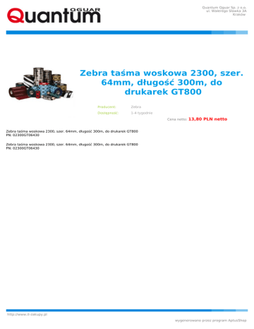 Quantum Qguar Sp. z o.o. ul. Walerego Sławka 3A Kraków Zebra taśma woskowa 2300, szer. 64mm, długość 300m, do drukarek GT800 Producent: Zebra Dostępność: 1-4 tygodnie Cena netto: 13,80 PLN netto Zebra taśma woskowa 2300, szer. 64mm, długość 300m, do drukarek GT800 PN: 02300GT06430 Zebra taśma woskowa 2300, szer. 64mm, długość 300m, do drukarek GT800 PN: 02300GT06430 http://www.it-zakupy.pl wygenerowano przez program AptusShop