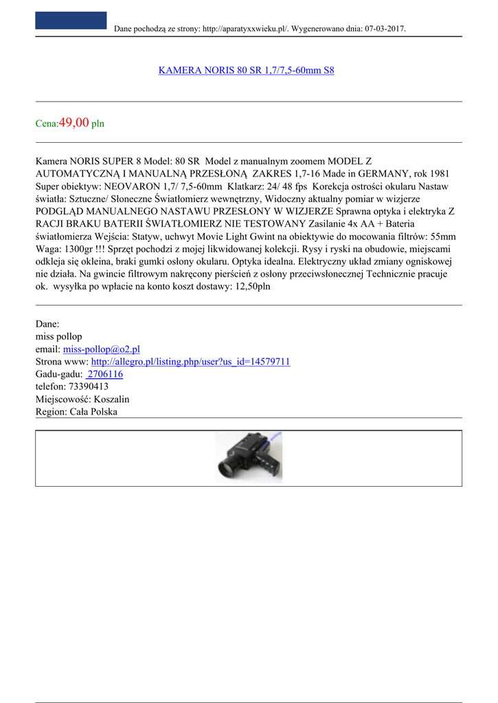 Dane pochodzą ze strony: http://aparatyxxwieku.pl/. Wygenerowano dnia: 07-03-2017. KAMERA NORIS 80 SR 1,7/7,5-60mm S8 Cena:49,00 pln Kamera NORIS SUPER 8 Model: 80 SR Model z manualnym zoomem MODEL Z AUTOMATYCZNĄ I MANUALNĄ PRZESŁONĄ ZAKRES 1,7-16 Made in GERMANY, rok 1981 Super obiektyw: NEOVARON 1,7/ 7,5-60mm Klatkarz: 24/ 48 fps Korekcja ostrości okularu Nastaw światła: Sztuczne/ Słoneczne Światłomierz wewnętrzny, Widoczny aktualny pomiar w wizjerze PODGLĄD MANUALNEGO NASTAWU PRZESŁONY W WIZJERZE Sprawna optyka i elektryka Z RACJI BRAKU BATERII ŚWIATŁOMIERZ NIE TESTOWANY Zasilanie 4x AA + Bateria światłomierza Wejścia: Statyw, uchwyt Movie Light Gwint na obiektywie do mocowania filtrów: 55mm Waga: 1300gr !!! Sprzęt pochodzi z mojej likwidowanej kolekcji. Rysy i ryski na obudowie, miejscami odkleja się okleina, braki gumki osłony okularu. Optyka idealna. Elektryczny układ zmiany ogniskowej nie działa. Na gwincie filtrowym nakręcony pierścień z osłony przeciwsłonecznej Technicznie pracuje ok. wysyłka po wpłacie na konto koszt dostawy: 12,50pln Dane: miss pollop email: [email protected] Strona www: http://allegro.pl/listing.php/user?us_id=14579711 Gadu-gadu: 2706116 telefon: 73390413 Miejscowość: Koszalin Region: Cała Polska