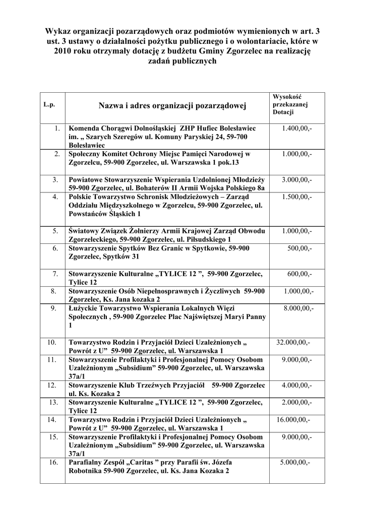 Wykaz organizacji pozarz!dowych oraz podmiotów wymienionych w art. 3 ust. 3 ustawy o dzia"alno#ci po$ytku publicznego i o wolontariacie, które w 2010 roku otrzyma"y dotacj% z bud$etu Gminy Zgorzelec na realizacj% zada& publicznych L.p. 1. 2. 3. 4. 5. 6. 7. 8. 9. 10. 11. 12. 13. 14. 15. 16. Nazwa i adres organizacji pozarz!dowej Wysoko#' przekazanej Dotacji Komenda Chor!gwi Dolno#l!skiej ZHP Hufiec Boles"awiec im. „ Szarych Szeregów ul. Komuny Paryskiej 24, 59-700 Boles"awiec Spo"eczny Komitet Ochrony Miejsc Pami%ci Narodowej w Zgorzelcu, 59-900 Zgorzelec, ul. Warszawska 1 pok.13 1.400,00,- Powiatowe Stowarzyszenie Wspierania Uzdolnionej M"odzie$y 59-900 Zgorzelec, ul. Bohaterów II Armii Wojska Polskiego 8a Polskie Towarzystwo Schronisk M"odzie$owych – Zarz!d Oddzia"u Mi%dzyszkolnego w Zgorzelcu, 59-900 Zgorzelec, ul. Powsta&ców (l!skich 1 3.000,00,- (wiatowy Zwi!zek )o"nierzy Armii Krajowej Zarz!d Obwodu Zgorzeleckiego, 59-900 Zgorzelec, ul. Pi"sudskiego 1 Stowarzyszenie Spytków Bez Granic w Spytkowie, 59-900 Zgorzelec, Spytków 31 1.000,00,- Stowarzyszenie Kulturalne „TYLICE 12 ”, 59-900 Zgorzelec, Tylice 12 Stowarzyszenie Osób Niepe"nosprawnych i )yczliwych 59-900 Zgorzelec, Ks. Jana kozaka 2 *u$yckie Towarzystwo Wspierania Lokalnych Wi%zi Spo"ecznych , 59-900 Zgorzelec Plac Naj#wi%tszej Maryi Panny 1 600,00,- Towarzystwo Rodzin i Przyjació" Dzieci Uzale$nionych „ Powrót z U” 59-900 Zgorzelec, ul. Warszawska 1 Stowarzyszenie Profilaktyki i Profesjonalnej Pomocy Osobom Uzale$nionym „Subsidium” 59-900 Zgorzelec, ul. Warszawska 37a/1 Stowarzyszenie Klub Trze+wych Przyjació" 59-900 Zgorzelec ul. Ks. Kozaka 2 Stowarzyszenie Kulturalne „TYLICE 12 ”, 59-900 Zgorzelec, Tylice 12 Towarzystwo Rodzin i Przyjació" Dzieci Uzale$nionych „ Powrót z U” 59-900 Zgorzelec, ul. Warszawska 1 Stowarzyszenie Profilaktyki i Profesjonalnej Pomocy Osobom Uzale$nionym „Subsidium” 59-900 Zgorzelec, ul. Warszawska 37a/1 Parafialny Zespó" „Caritas ” przy Parafii #w. Józefa Robotnika 59-900 Zgorzelec, ul. Ks. Jana Kozaka 2 1.000,00,- 1.500,00,- 500,00,- 1.000,00,8.000,00,- 32.000,00,9.000,00,4.000,00,2.000,00,16.000,00,9.000,00,5.000,00,- 17. 18. 19. 20. 21. 22. 23. 24. 25. 26. 27. 28. 29. 30. 31. 32. 33. 34. 35. 36. Towarzystwo Pomocy im. (w. Brata Alberta – Kolo Zgorzelec 59-900 zgorzelec, ul. Henrykowska 4 Polski Zwi!zek Niewidomych Okr%g Dolno#l!ski, Ko"o Zgorzelec 59-900 Zgorzelec, ul. Armii Krajowej 103 Polski Komitet Pomocy Spo"ecznej 59-900 Zgorzelec, ul. Armii Krajowej 103 Polskie Stowarzyszenie Diabetyków, Ko"o Miejskie w Zgorzelcu 59-900 Zgorzelec, ul. Warszawska 1/5 Stowarzyszenie Wspieraj!cych Rozwój Osób Niepe"nosprawnych, Starszych i Chorych „In Gremio” w Zgorzelcu 59-900 Zgorzelec, ul. Przechodnia 8 Klub Puszystych „SUPER LINIA” 59-900 Zgorzelec, ul. Konarskiego 8/5 Polski Czerwony Krzy$ Zarz!d Rejonowy w Zgorzelcu 59900 Zgorzelec, ul. Czachowskiego 1a Gminne Zrzeszenie LZS 59-900 Zgorzelec, ul. Ko#ciuszki 70 Towarzystwo Kolarskie „Karkonosze Tour” Jelenia Góra 58500 Jelenia Góra, ul. Groszowa 18/6 Zrzeszenie Ludowe Zespo"y Sportowe Powiatu Zgorzelec 59-900 Zgorzelec, ul. Ko#ciuszki 70 Uczniowski Klub Sportowy Energetyk Zgorzelec 59-900 Zgorzelec ul. *u$ycka 7 Uczniowski Klub Sportowy Zapasów w Jerzmankach 59-900 Zgorzelec, Jerzmanki 43 Zgorzelecka Grupa Rowerowa „THC Promil” 59-900 Zgorzelec ul. Morcinka 10a Fundacja „Niepe"nosprawnym i Oczekuj!cym Pomocy” 59900 Zgorzelec, ul. Traugutta 77B Komenda Chor!gwi Dolno#l!skiej ZHP Hufiec Boles"awiec im. „ Szarych Szeregów ul. Komuny Paryskiej 24, 59-700 Boles"awiec Mi%dzyszkolny Klub Sportowy „OSA” 59-900 Zgorzelec, ul. Powsta&ców (l!skich 1 Ochotnicza Stra$ Po$arna w Radomierzycach 59-900 Zgorzelec, Radomierzyce 14a Po"udniowo – Zachodnie Forum Samorz!du Terytorialnego „POGRANICZE” 59-800 Luba&, ul. Armii Krajowej 30 Ochotnicza Stra$ Po$arna w Trójcy 59-900 Zgorzelec, Trójca 19 Fundacja Centrum Wspierania Przedsi%biorczo#ci w Zgorzelcu 59-900 Zgorzelec, ul. Boh. II Armii Wojska Polskiego 8A 16.000,00,1.000,00,3.000,00,1.500,00,1.500,00,1.000,00,1.000,00,110.000,00,5.000,00,5.000,00,2.000,00,25.000,00,1.000,00,1.500,00,1.000,00,1.000,00,1.000,00,1.500,00,2.000,00,10.000,00,- Zgorzelecki Klub Bokserski w wyniku konkursu otrzyma! dotacj" na wsparcie realizacji zadania publicznego w wysoko#ci 2.000,00,- z!., lecz nie podpisa! umowy.