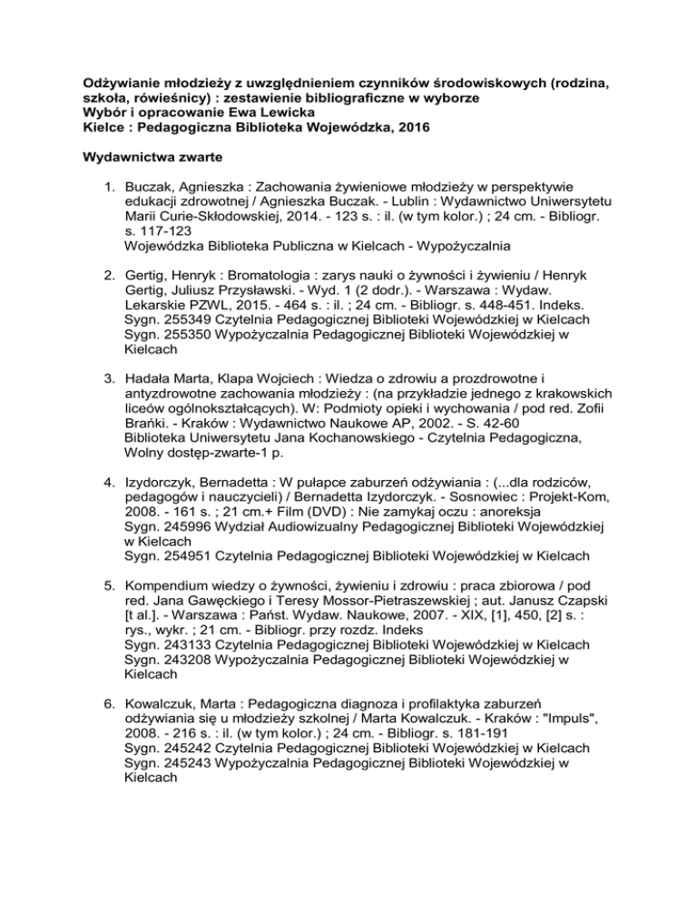 Odżywianie młodzieży z uwzględnieniem czynników środowiskowych (rodzina, szkoła, rówieśnicy) : zestawienie bibliograficzne w wyborze Wybór i opracowanie Ewa Lewicka Kielce : Pedagogiczna Biblioteka Wojewódzka, 2016 Wydawnictwa zwarte 1. Buczak, Agnieszka : Zachowania żywieniowe młodzieży w perspektywie edukacji zdrowotnej / Agnieszka Buczak. - Lublin : Wydawnictwo Uniwersytetu Marii Curie-Skłodowskiej, 2014. - 123 s. : il. (w tym kolor.) ; 24 cm. - Bibliogr. s. 117-123 Wojewódzka Biblioteka Publiczna w Kielcach - Wypożyczalnia 2. Gertig, Henryk : Bromatologia : zarys nauki o żywności i żywieniu / Henryk Gertig, Juliusz Przysławski. - Wyd. 1 (2 dodr.). - Warszawa : Wydaw. Lekarskie PZWL, 2015. - 464 s. : il. ; 24 cm. - Bibliogr. s. 448-451. Indeks. Sygn. 255349 Czytelnia Pedagogicznej Biblioteki Wojewódzkiej w Kielcach Sygn. 255350 Wypożyczalnia Pedagogicznej Biblioteki Wojewódzkiej w Kielcach 3. Hadała Marta, Klapa Wojciech : Wiedza o zdrowiu a prozdrowotne i antyzdrowotne zachowania młodzieży : (na przykładzie jednego z krakowskich liceów ogólnokształcących). W: Podmioty opieki i wychowania / pod red. Zofii Brańki. - Kraków : Wydawnictwo Naukowe AP, 2002. - S. 42-60 Biblioteka Uniwersytetu Jana Kochanowskiego - Czytelnia Pedagogiczna, Wolny dostęp-zwarte-1 p. 4. Izydorczyk, Bernadetta : W pułapce zaburzeń odżywiania : (...dla rodziców, pedagogów i nauczycieli) / Bernadetta Izydorczyk. - Sosnowiec : Projekt-Kom, 2008. - 161 s. ; 21 cm.+ Film (DVD) : Nie zamykaj oczu : anoreksja Sygn. 245996 Wydział Audiowizualny Pedagogicznej Biblioteki Wojewódzkiej w Kielcach Sygn. 254951 Czytelnia Pedagogicznej Biblioteki Wojewódzkiej w Kielcach 5. Kompendium wiedzy o żywności, żywieniu i zdrowiu : praca zbiorowa / pod red. Jana Gawęckiego i Teresy Mossor-Pietraszewskiej ; aut. Janusz Czapski [t al.]. - Warszawa : Państ. Wydaw. Naukowe, 2007. - XIX, [1], 450, [2] s. : rys., wykr. ; 21 cm. - Bibliogr. przy rozdz. Indeks Sygn. 243133 Czytelnia Pedagogicznej Biblioteki Wojewódzkiej w Kielcach Sygn. 243208 Wypożyczalnia Pedagogicznej Biblioteki Wojewódzkiej w Kielcach 6. Kowalczuk, Marta : Pedagogiczna diagnoza i profilaktyka zaburzeń odżywiania się u młodzieży szkolnej / Marta Kowalczuk. - Kraków : "Impuls", 2008. - 216 s. : il. (w tym kolor.) ; 24 cm. - Bibliogr. s. 181-191 Sygn. 245242 Czytelnia Pedagogicznej Biblioteki Wojewódzkiej w Kielcach Sygn. 245243 Wypożyczalnia Pedagogicznej Biblioteki Wojewódzkiej w Kielcach 7. Oblacińska Anna, Jodkowska Maria, Tabak Izabela, Ostręga Wiesława : Samoocena zdrowia i sprawności fizycznej polskich gimnazjalistów z nadwagą i otyłością. W: Auksologia a promocja zdrowia. T. 4 / pod red. Andrzeja Jopkiewicza ; Polska Akademia Nauk. Oddział w Krakowie, Kieleckie Towarzystwo Naukowe. - Kielce : Kieleckie Towarzystwo Naukowe, 2007. - S. 69-80 Sygn. 244438 Czytelnia Pedagogicznej Biblioteki Wojewódzkiej w Kielcach 8. Otyłość u dzieci i młodzieży / red. nauk. Ewa Małecka-Tendera, Piotr Socha ; aut. Mieczysław Litwin [et al.]. - Wyd. 1 - 2 dodr. - Warszawa : Wydawnictwo Lekarskie PZWL, 2014. - 119 s. : il. ; 21 cm. – (Centrum Zdrowia Dziecka Poleca) Sygn. 255778 Wypożyczalnia Pedagogicznej Biblioteki Wojewódzkiej w Kielcach 9. Problemy żywieniowe dzieci i młodzieży / pod red. A. Wiatrowskiej, A. Bieganowskiej, A. Witek ; Uniwersytet Marii Curie-Skłodowskiej. Wydział Pedagogiki i Psychologii. - Wyd. specjalne. - Lublin : Wydawnictwo Uniwersytetu Marii Curie-Skłodowskiej, 2013. - 388 s. : il. ; 24 cm. – (Lubelski Rocznik Pedagogiczny ; 32). - Bibliogr. przy art. Biblioteka Uniwersytetu Jana Kochanowskiego – Czytelnia Pedagogiczna 10. Suliga, Edyta : Zachowania zdrowotne studentów kieleckich i uczniów szkół ponadgimnazjalnych z południowej i środkowo-wschodniej Polski / Edyta Suliga. - Kielce : Wydawnictwo Akademii Świętokrzyskiej, 2004. - 137, [2] s. ; 23 cm. - Bibliogr. s. [119]-132 Biblioteka Uniwersytetu Jana Kochanowskiego - Czytelnia Pedagogiczna, Magazyn-parter, Wolny dostęp-zwarte-1 p. 11. Suliga, Edyta : Zróżnicowanie rozwoju fizycznego oraz sposobu żywienia dzieci i młodzieży w środowisku miejskim i wiejskim Kielecczyzny w latach 2002-2005 / Edyta Suliga. - Kielce : Wydaw. Uniwersytetu HumanistycznoPrzyrodniczego Jana Kochanowskiego, 2008. - 286, [2] s. : il. ; 24 cm. Bibliogr. s. 241-274. Sygn. 244835 Czytelnia Pedagogicznej Biblioteki Wojewódzkiej w Kielcach 12. Szweda, Aleksandra : Wpływ rodziny na występowanie zaburzeń odżywiania : ujęcie systemowe. W: Wartości w rodzinie : ciągłość i zmiana / red. nauk. Wojciech Muszyński. - Toruń : Wydawnictwo Adam Marszałek, 2010. - S. 294302. - Bibliogr. Biblioteka Uniwersytetu Jana Kochanowskiego - Czytelnia Pedagogiczna 13. Wycisk, Jowita : Młodzież przeciwko sobie : zaburzenia odżywiania i samouszkodzenia - jak pomóc nastolatkom w szkole / Jowita Wycisk, Beata Ziółkowska. - Warszawa : Difin, 2010. - 206 s. : il. ; 23 cm. - Bibliogr. s. 183193 Sygn. 253028 Czytelnia Pedagogicznej Biblioteki Wojewódzkiej w Kielcach Sygn. 253029 Wypożyczalnia Pedagogicznej Biblioteki Wojewódzkiej w Kielcach 14. Żywienie człowieka. 1, Podstawy nauki o żywieniu / pod red. Jana Gawęckiego i Lecha Hryniewieckiego ; aut. Stanisław Berger [et al.]. Warszawa : Wydawnictwo Naukowe PWN, 2007. - 512, [2] s. : il. ; 25 cm. Bibliogr. przy rozdz. M.in. Człowiek i jego pokarm. Składniki odżywcze. Trawienie i wchłanianie. Żywienie a zwyczaje kulturowe. Normy żywienia. Ocena wyżywienia. Ocena stanu odżywiania. Sygn. 243686 Czytelnia Pedagogicznej Biblioteki Wojewódzkiej w Kielcach 15. Żywienie człowieka a zdrowie publiczne. 3 / red. nauk. Jan Gawęcki, Wojciech Roszkowski ; [aut. Jerzy Bertrandt et al.]. - Warszawa : Wydawnictwo Naukowe PWN, 2009. - 405, [2] s. : il. ; 24 cm. M.in. Żywność. Żywienie. Problemy żywieniowe niemowląt, małych dzieci, dzieci i młodzieży szkolnej, kobiet w wieku rozrodczym, osób