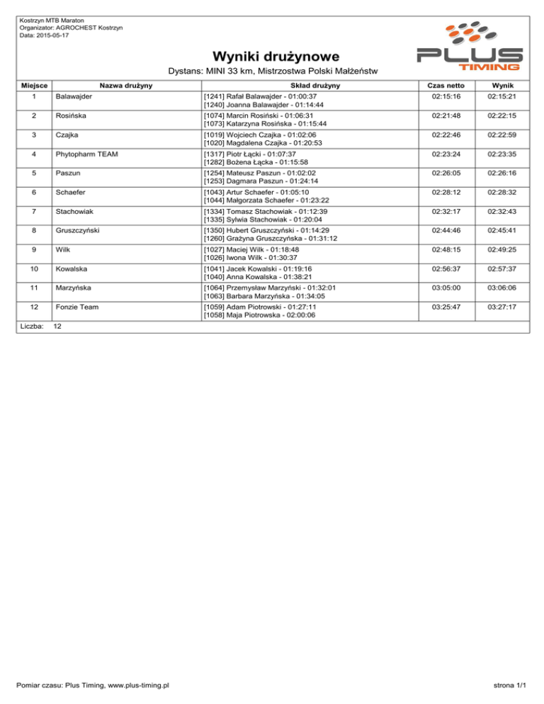 Kostrzyn MTB Maraton Organizator: AGROCHEST Kostrzyn Data: 2015-05-17 Wyniki drużynowe Dystans: MINI 33 km, Mistrzostwa Polski Małżeństw Miejsce Czas netto Wynik 1 Balawajder [1241] Rafał Balawajder - 01:00:37 [1240] Joanna Balawajder - 01:14:44 02:15:16 02:15:21 2 Rosińska [1074] Marcin Rosiński - 01:06:31 [1073] Katarzyna Rosińska - 01:15:44 02:21:48 02:22:15 3 Czajka [1019] Wojciech Czajka - 01:02:06 [1020] Magdalena Czajka - 01:20:53 02:22:46 02:22:59 4 Phytopharm TEAM [1317] Piotr Łącki - 01:07:37 [1282] Bożena Łącka - 01:15:58 02:23:24 02:23:35 5 Paszun [1254] Mateusz Paszun - 01:02:02 [1253] Dagmara Paszun - 01:24:14 02:26:05 02:26:16 6 Schaefer [1043] Artur Schaefer - 01:05:10 [1044] Małgorzata Schaefer - 01:23:22 02:28:12 02:28:32 7 Stachowiak [1334] Tomasz Stachowiak - 01:12:39 [1335] Sylwia Stachowiak - 01:20:04 02:32:17 02:32:43 8 Gruszczyński [1350] Hubert Gruszczyński - 01:14:29 [1260] Grażyna Gruszczyńska - 01:31:12 02:44:46 02:45:41 9 Wilk [1027] Maciej Wilk - 01:18:48 [1026] Iwona Wilk - 01:30:37 02:48:15 02:49:25 10 Kowalska [1041] Jacek Kowalski - 01:19:16 [1040] Anna Kowalska - 01:38:21 02:56:37 02:57:37 11 Marzyńska [1064] Przemysław Marzyński - 01:32:01 [1063] Barbara Marzyńska - 01:34:05 03:05:00 03:06:06 12 Fonzie Team [1059] Adam Piotrowski - 01:27:11 [1058] Maja Piotrowska - 02:00:06 03:25:47 03:27:17 Liczba: Nazwa drużyny Skład drużyny 12 Pomiar czasu: Plus Timing, www.plus-timing.pl strona 1/1