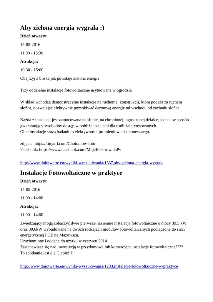 Aby zielona energia wygrała :) Dzień otwarty: 15-05-2016 11:00 - 15:30 Atrakcja: 10:30 - 15:00 Obejrzyj z bliska jak powstaje zielona energia! Trzy oddzielne instalacje fotowoltaiczne usytuowane w ogrodzie. W skład wchodzą demonstracyjne instalacje na ruchomej konstrukcji, która podąża za ruchem słońca, pozwalając efektywnie pozyskiwać darmową energię od wschodu od zachodu słońca. Każda z instalacji jest zamocowana na słupie, na chronionej, ogrodzonej działce, jednak w sposób gwarantujący swobodny dostęp w pobliże instalacji dla osób zainteresowanych. Obie instalacje służą badaniom efektywności promieniowania słonecznego. zdjęcia: https://tinyurl.com/Chotomow-foto Facebook: https://www.facebook.com/MojaElektrowniaPv http://www.dniotwarte.eu/wyniki-wyszukiwania/1537,aby-zielona-energia-wygrala Instalacje Fotowoltaiczne w praktyce Dzień otwarty: 14-05-2016 11:00 - 14:00 Atrakcja: 11:00 - 14:00 Zwiedzający mogą zobaczyć dwie pierwsze naziemne instalacje fotowoltaiczne o mocy 39,5 kW oraz 39,6kW wybudowane na dwóch rodzajach modułów fotowoltaicznych podłączone do sieci energetycznej PGE na Mazowszu. Uruchomione i oddane do użytku w czerwcu 2014 . Zastanawiasz się nad inwestycją w przydomową lub komercyjną instalacje fotowoltaiczną???? To spotkanie jest dla Ciebie!!!! http://www.dniotwarte.eu/wyniki-wyszukiwania/1233,instalacje-fotowoltaiczne-w-praktyce Spotkanie z energią odnawialną w Centrum Badawczym Dzień otwarty: 12-05-2016 10:00 - 13:00 Atrakcja: 10:00 - 13:00 Utworzone w ramach projektu Centrum badawcze jest najnowocześniejszym w Polsce i jednym z najnowocześniejszych w Europie zespołem laboratoriów badawczych zajmujących się wykorzystaniem energii odnawialnej. Stanowi zaplecze laboratoryjne pozwalające na realizację własnych projektów badawczych Instytutu Maszyn Przepływowych PAN z Gdańska oraz projektów realizowanych wspólnie z innymi placówkami naukowymi PAN, wyższymi uczelniami jak i również jednostkami badawczo-rozwojowymi blisko związanymi tematycznie i posiadającymi bogate doświadczenie w zakresie konwersji energii i źródeł odnawialnych. http://www.dniotwarte.eu/wyniki-wyszukiwania/2749,spotkanie-z-energia-odnawialna-w-centrumbadawczym Nauka w technice, medycynie i ochronie środowiska Dzień otwarty: 13-05-2016 10:00 - 15:00 Atrakcja: 10:00 - 15:00 Pokażemy: - jak powstają akceleratory dla medycyny i nie tylko, - pomiar, śledzenie i przewidywanie zanieczyszczeń powietrza, - możliwe zastosowania gorącej plazmy. Park Naukowo - Technologiczny: na styku nauki i biznesu - zaprasza do współpracy. http://4laby.pl/ http://pnt.ncbj.gov.pl/ http://www.dniotwarte.eu/wyniki-wyszukiwania/2683,nauka-w-technice-medycynie-i-ochroniesrodowiska Zwiedzanie Zakładu "Czajka" Dzień otwarty: 12-05-2016 12:00 - 13:30 Atrakcja: 12:00 - 13:00 Zwiedzanie Zakładu „Czajka” - największej i najnowocześniejszej oczyszczalni ścieków w Polsce. W trakcie wycieczki poznasz procesy mechanicznego i biologicznego oczyszczania ścieków. Zwiedzisz miejsca niedostępne na co dzień, np. zhermetyzowane obiekty technologiczne, czy nowoczesną dyspozytornię zakładu. Liczba osób mogących wziąć udział w wycieczce jest ograniczona. Każdy z uczestników wycieczki przed wejściem na teren zakładu powinien okazać dokument ze zdjęciem (dowód osobisty, paszport, legitymacja studencka) w celu weryfikacji tożsamości. http://www.dniotwarte.eu/wyniki-wyszukiwania/1800,zwiedzanie-zakladu-czajka Majówka w Muzeum Pałacu Króla Jana III w Wilanowie Dzień otwarty: 15-05-2016 11:00 - 14:30 Atrakcja: 11:00 - 12:30 Spacer pałacowy z wykorzystaniem obrazów dotykowych skierowanych do osób z niepełnosprawnością wzroku. W trakcie zajęć wykorzystamy narzędzia wyprodukowane w ramach projektu współfinansowanego z funduszy UE w ramach Programu Infrastruktura i Środowisko. Atrakcja: 13:00 - 14:30 Warsztaty ogrodowe z wykorzystaniem planów tyflograficznych ogrodów skierowanych do osób z niepełnosprawnością wzroku. W trakcie zajęć wykorzystamy narzędzia wyprodukowane w ramach projektu współfinansowanego z funduszy UE w ramach Programu Infrastruktura i Środowisko. http://www.dniotwarte.eu/wyniki-wyszukiwania/1158,majowka-w-muzeum-palacu-krola-jana-iiiw-wilanowie Relaks w Puszczy Mariańskiej Zapraszamy do aktywności fizycznej podczas spaceru Nordic Walking po leśnych ostępach Nadleśnictwa Radziwiłłów. Odkryj tajemnice lasu i jego funkcje. Dowiedz się jaka jest rola lasów w zaopatrywaniu naszej planety w świeżą i zdrową wodę. Ponadto: ABC Leśnego Przyjaciela i wspólne biesiadowanie przy ognisku. http://www.dniotwarte.eu/wyniki-wyszukiwania/1583,relaks-w-puszczy-marianskiej