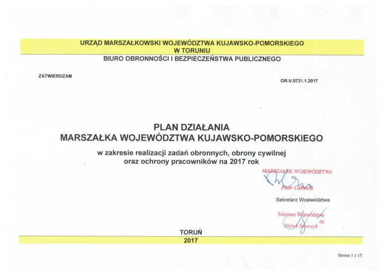 p. 1 Treść przedsięwzięcia Wykonawca Współwykonawca 2 3 Uwagi o realizacji planu Termin realizacji I II III IV V VI VII VIII IX X XI XII 4 5 6 7 8 9 10 11 12 13 14 15 16 I. ZAMIERZENIA OBRONNE DLA ORGANÓW SAMORZADU TERYTORIALNEGO SZCZEBLA WOJEWÓDZKIEGO I. W ZAKRESIE ORGANIZACYJNYM i PRAC NORMATYWNYCH 1. Opracowanie zarządzeń, decyzji i szczegółowych wytycznych Marszałka Województwa regulujących przygotowania obronne na obszarze samorządu wojewódzkiego. 2. Wdrożenie do realizacji Wytycznych i „Planu Działania Marszałka Województwa”. II. 1. 2. Marszałek Województwa Sekretarz Województwa Sekretarz Województwa Dyrektorzy Departamentów UM Dyrektorzy WSJO i Prezesi Spółek Stosownie do ukazujących się aktów prawnych Wojewody Na bieżąco W ZAKRESIE WSPÓŁDZIAŁANIA Zapewnienie współdziałania cywilnowojskowego, w szczególności dotyczącego: 1) przygotowania elementów systemu obronnego samorządu wojewódzkiego umożliwiającego mobilizacyjne rozwinięcie Sił Zbrojnych RP; 2) realizacji zadań na rzecz wojsk sojuszniczych wynikających z obowiązku państwa-gospodarza (HNS); 3) planowania organizacji świadczeń na rzecz obrony; 4) działalności kontrolnej i szkoleniowej. Aktualizacja bazy danych jednostki oraz przesłanie danych do departamentu sprawującego nadzór merytoryczny Marszałek Województwa Pełnomocnik Marszałka ds. HNS, Dyrektorzy WSJO realizujący zadania w ramach HNS i na rzecz SZ Departament Organizacyjny Departamenty UM nadzorujące jednostki Dyrektorzy WSJO, Prezesi Spółek Podstawa, zarządzenie Nr 37/2016 Marszałka Województwa z dnia 19 maja 2016 r. w sprawie powołania punktów kontaktowych HNS WSJO i Spółki do 28.02 Dep. UM do 31.03 Dep. Organizacyjny do 30.04 Strona 2 z 15 p. Treść przedsięwzięcia I 3. Zapewnienie współdziałania z Wydziałem Ochrony Ludności Urzędu Miasta, Gminy w zakresie planowania i realizacji zadań dotyczących zarządzania kryzysowego oraz ochrony ludności (pracowników). Zapewnienie współdziałania z Wydziałem Bezpieczeństwa i Zarządzania Kryzysowego 4. Urzędu Wojewódzkiego w zakresie udziału Marszałka Województwa na ZSK Wojewody Kujawsko-Pomorskiego. 5. II III IV V VI VII VIII IX X XI XII Na bieżąco Na bieżąco Kierownik BOiBP Współdziałanie z departamentami UM w zakresie realizacji przedsięwzięć obronnych i obrony cywilnej III. 1. Sekretarz Województwa BOiBP, WSJO i Spółki Uwagi o realizacji planu Termin realizacji Wykonawca Współwykonawca Na bieżąco W ZAKRESIE SPRAW OGÓLNOOBRONNYCH Aktualizacja dokumentacji obronnej, w szczególności dotyczącej: 1) „Zakresu działania Urzędu Marszałkowskiego (jednostki, spółki) w dziedzinie obronności państwa w czasie pokoju”; Marszałek Województwa Sekretarz Województwa, Dyrektorzy WSJO i Prezesi Spółek Na bieżąco 2) „Dokumentacji stałego dyżuru (całodobowego dyżuru)”. 2. Opracowanie i przesłanie do Wydziału Bezpieczeństwa i Zarządzania Kryzysowego Urzędu Wojewódzkiego w Bydgoszczy sprawozdania z realizacji zadań obronnych za rok kalendarzowy. IV. Sekretarz Województwa Kierownik BOiBP X W ZAKRESIE PLANOWANIA OPERACYJNEGO Strona 3 z 15 p. Treść przedsięwzięcia I 1. Aktualizacja planu operacyjnego funkcjonowania urzędu marszałkowskiego w warunkach zewnętrznego zagrożenia bezpieczeństwa państwa i w czasie wojny. 2. Aktualizacja kart realizacji zadań operacyjnych departamentów urzędu marszałkowskiego. 3. Aktualizacja tabel i kart realizacji zadań operacyjnych jednostek. 4. Aktualizacja „Regulaminu organizacyjnego na czas wojny”. V. IV V VI VII VIII IX X XI XII Na bieżąco Na bieżąco Na bieżąco Dyrektorzy WSJO i Prezesi Spółek Na bieżąco W ZAKRESIE KIEROWANIA Marszałek Województwa Kierownik BOiBP 2. Nowelizacja „Planu przemieszczania i funkcjonowania Urzędu Marszałkowskiego na GSK w ZMP”. Marszałek Województwa Dyrektor Departamentu Organizacyjnego 3. Modernizacja systemu kierowania bezpieczeństwem Samorządu Województwa, w tym obronnością na bazie istniejących obiektów „Głównego Stanowiska Kierowania”. Marszałek Województwa Dyrektor Departamentu Organizacyjnego 2. III Dyrektorzy Departamentów, Pracownicy Grupy P-1 Kancelaria Dokumentów Niejawnych Nowelizacja „Planu funkcjonowania Marszałka Województwa na GSK. 1. II Kierownik BOiBP 1. VI. Uwagi o realizacji planu Termin realizacji Wykonawca Współwykonawca Na bieżąco Na bieżąco Na bieżąco W ZAKRESIE POTRZEB SIŁ ZBROJNYCH Stwarzanie warunków zapewniających świadczenie usług na rzecz SZ RP oraz przygotowanie warunków (infrastrukturalnych i organizacyjnych) do wsparcia sił sojuszniczych na terytorium Polski (HNS). Stwarzanie warunków zapewniających sprawne mobilizacyjne rozwinięcie SZ RP. Marszałek Województwa Dyrektor Departamentu Organizacyjnego, Dyrektorzy WSJO ujęci w zarządzeniu Marszałka Województwa Dyrektor Dep. Org. Dyr. WSJO Prezesi Spółek Podstawa, zarządzenie Nr 37/2016 Marszałka Województwa z dnia 19 maja 2016 r. w sprawie powołania punktów kontaktowych HNS Na bieżąco Strona 4 z 15 p. Treść przedsięwzięcia I 3. 4. 5. 6. Prowadzenie spraw związanych z reklamowaniem żołnierzy rezerwy od obowiązku służby wojskowej w razie mobilizacji i w czasie wojny. Zawiadamianie wojskowych komendantów uzupełnień o pracownikach nowoprzyjętych podlegających obowiązkowi czynnej służby wojskowej. Prowadzenie ewidencji osób podlegających obowiązkowi służby wojskowej (posiadających przydziały mobilizacyjne). Opracowanie i aktualizacja wykazów imiennych żołnierzy rezerwy podlegających reklamacji i przesyłanie ich do WKU. VII. 1. 1. II III IV V VI VII VIII IX X XI XII Na bieżąco Na bieżąco Dyrektor Departamentu Organizacyjnego Dyrektorzy WSJO i Prezesi Spółek Na bieżąco Na bieżąco W ZAKRESIE ŚWIADCZEŃ NA RZECZ OBRONY Weryfikacja umów i świadczeń rzeczowych na rzecz obrony. VIII. Uwagi o realizacji planu Termin realizacji Wykonawca 