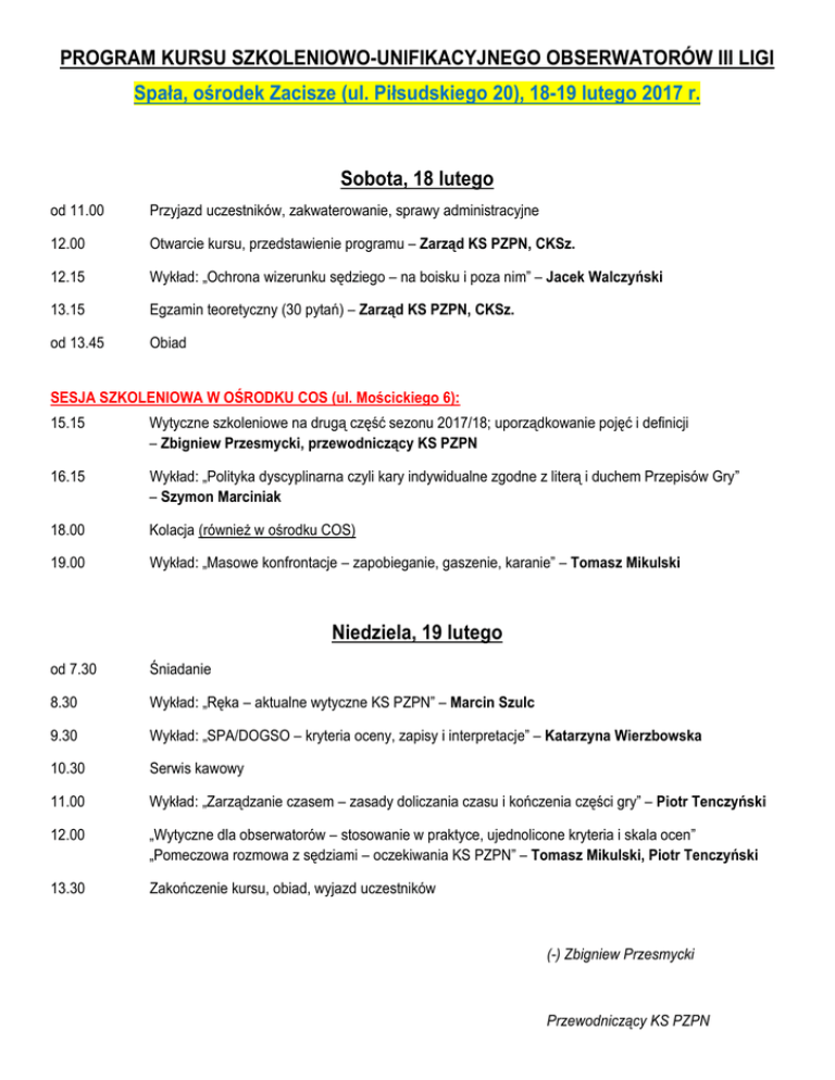 PROGRAM KURSU SZKOLENIOWO-UNIFIKACYJNEGO OBSERWATORÓW III LIGI Spała, ośrodek Zacisze (ul. Piłsudskiego 20), 18-19 lutego 2017 r. Sobota, 18 lutego od 11.00 Przyjazd uczestników, zakwaterowanie, sprawy administracyjne 12.00 Otwarcie kursu, przedstawienie programu – Zarząd KS PZPN, CKSz. 12.15 Wykład: „Ochrona wizerunku sędziego – na boisku i poza nim” – Jacek Walczyński 13.15 Egzamin teoretyczny (30 pytań) – Zarząd KS PZPN, CKSz. od 13.45 Obiad SESJA SZKOLENIOWA W OŚRODKU COS (ul. Mościckiego 6): 15.15 Wytyczne szkoleniowe na drugą część sezonu 2017/18; uporządkowanie pojęć i definicji – Zbigniew Przesmycki, przewodniczący KS PZPN 16.15 Wykład: „Polityka dyscyplinarna czyli kary indywidualne zgodne z literą i duchem Przepisów Gry” – Szymon Marciniak 18.00 Kolacja (również w ośrodku COS) 19.00 Wykład: „Masowe konfrontacje – zapobieganie, gaszenie, karanie” – Tomasz Mikulski Niedziela, 19 lutego od 7.30 Śniadanie 8.30 Wykład: „Ręka – aktualne wytyczne KS PZPN” – Marcin Szulc 9.30 Wykład: „SPA/DOGSO – kryteria oceny, zapisy i interpretacje” – Katarzyna Wierzbowska 10.30 Serwis kawowy 11.00 Wykład: „Zarządzanie czasem – zasady doliczania czasu i kończenia części gry” – Piotr Tenczyński 12.00 „Wytyczne dla obserwatorów – stosowanie w praktyce, ujednolicone kryteria i skala ocen” „Pomeczowa rozmowa z sędziami – oczekiwania KS PZPN” – Tomasz Mikulski, Piotr Tenczyński 13.30 Zakończenie kursu, obiad, wyjazd uczestników (-) Zbigniew Przesmycki Przewodniczący KS PZPN