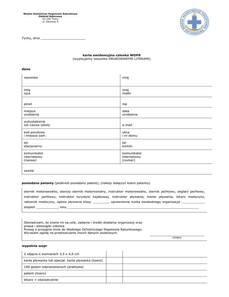 Wodne Ochotnicze Pogotowie Ratunkowe Oddział Rejonowy 43-100 Tychy ul. Edukacji 9 Tychy, dnia _______________________ karta ewidencyjna członka WOPR (wypisujemy wszystko DRUKOWANYMI LITERAMI) dane nazwisko imię imię ojca imię matki pesel nip miejsce urodzenia data urodzenia wykształcenie lub nazwa szkoły e-mail kod pocztowy i miejsce zam. ulica i nr domu tel. stacjonarny tel komór. komunikator internetowy (nazwa) ____________________________ komunikator internetowy (numer) zawód _____________________________________________________________________ ____________________________ posiadane patenty (podkreśl posiadany patent), (należy dołączyć ksero patentu) sternik motorowodny, starszy sternik motorowodny, instruktor motorowodny, sternik jachtowy, żeglarz jachtowy, instruktor jachtowy, instruktor turystyki kajakowej, instruktor pływania, trener pływania, lekarz medycyny, ratownik medyczny, sędzia pływania klasy ________, uprawnienia nurka swobodnego organizacja ____________ stopień ___________, inny ___________________________________________________________________ Oświadczam, że znane mi są cele, zadania i środki działania organizacji oraz prawa i obowiązki członka. Proszę o przyjęcie mnie do Wodnego Ochotniczego Pogotowia Ratunkowego. Wyrażam zgodę na przetwarzanie moich danych osobowych. ____________________________ /podpis/ wypełnia wopr 2 zdjęcia o wymiarach 3,5 x 4,5 cm karta pływacka lub specjal. karta pływacka (ksero) 100 godzin odpracowanych (praktyka) patent (ksero) lekarz + oświadczenie
