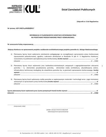 Dział Zamówień Publicznych Załącznik nr 3 do Regulaminu Nr sprawy: AZP-240/K-p209/02/2017 INFORMACJA O PLANOWANYCH KOSZTACH WYKONANIA PRAC NA PODSTAWIE PRZEDSTAWIONEJ PRACY KONKURSOWEJ. Nr oznaczenia liczbą rozpoznawczą ………........................………………………………………………………………………..……........................…… Dotyczy Konkursu na opracowanie projektu rzeźbiarsko-architektonicznego projektu pomnika ks. Idziego Radziszewskiego. 1) Planowany łączny koszt wykonania zamówienia polegającego na szczegółowym opracowaniu pracy konkursowej (opracowanie pokonkursowe), zgodnie z zakresem określonym w Rozdziale VI pkt 4 i 5 Regulaminu Konkursu, oszacowany na podstawie sporządzonej pracy konkursowej, brutto wynosi: ………………………………….…………………… zł (słownie: ………………………………………………………………………………………………….………………………………………..……….. zł …./100) 2) Planowany łączny koszt wykonania prac budowlano-montażowych związanych z zagospodarowaniem otoczenia pomnika – tj. elementów posadowienia pomnika, elementów małej architektury, ukształtowania zieleni, infrastruktury technicznej niezbędnej do oświetlenia pomnika itp. w granicach opracowania konkursowego, brutto wynosi: ………………………………….………………………………………………………………………………………………………………..………… zł (słownie: ………………………………………………………………………………………………….………………………………………..……….. zł …./100) 3) Planowany łączny koszt wykonania rzeźby pomnika w zaplanowanym materiale i technologii wraz z jego montażem wskazanym w opracowaniu pracy konkursowej brutto wynosi: ………………………………….…………………………..…………… zł (słownie: ………………………………………………………………………………………………….………………………………………..……….. zł …./100) Łączny planowany koszt wykonania prac (suma powyższych kwot) brutto wynosi: ……………………………….………………………… zł (słownie: ……………………………………………………………………………………………………………….…………………………………..……….. zł …./100) …...................................................................... (miejscowość, data) …………………………..……….................................................... (podpis i pieczęć imienna osoby/osób właściwej/ych do reprezentowania) Al. Racławickie 14 | 20-950 Lublin | tel. +48 81 445 41 59 | [email protected] | www.kul.pl 1 Dział Zamówień Publicznych Załącznik nr 4 do Regulaminu Nr sprawy: AZP-240/K-p209/02/2017 POKWITOWANIE ZŁOŻENIA PRACY KONKURSOWEJ zgłoszonej do udziału w konkursie na opracowanie projektu rzeźbiarsko-architektonicznego projektu pomnika ks. Idziego Radziszewskiego. Kwituję odbiór pracy konkursowej oznaczonej liczbą rozpoznawczą: / 4cyfr / Lublin, dnia: ...................................., godzina: .................................. . .................................................................................................. (podpis i pieczęć osoby upoważnionej do przyjęcia pracy konkursowej) Al. Racławickie 14 | 20-950 Lublin | tel. +48 81 445 41 59 | [email protected] | www.kul.pl 2 Dział Zamówień Publicznych Załącznik nr 5 do Regulaminu Nr sprawy: AZP-240/K-p209/02/2017 KARTY IDENTYFIKACYJNA UCZESTNIKA KONKURSU Dotyczy udziału w konkursie na opracowanie projektu rzeźbiarsko-architektonicznego projektu pomnika ks. Idziego Radziszewskiego. Sposób składania: w zamkniętej kopercie z napisem „KARTA” dołączonej do pracy konkursowej. Dane identyfikacyjne uczestnika(-ów) konkursu: Czterocyfrowa liczba rozpoznawcza nadana pracy konkursowej: Nazwa uczestnika(-ów) konkursu: ................................................................................................................................................................................................ ................................................................................................................................................................................................ ................................................................................................................................................................................................ PESEL: ……………….………..............................................……… NIP: ............................................................................................. Adres siedziby, nr tel., nr fax, adres e-mail: ................................................................................................................................................................................................ ................................................................................................................................................................................................ Adres do korespondencji lub adres ustanowionego pełnomocnika, nr tel., adres e-mail: ................................................................................................................................................................................................ ................................................................................................................................................................................................ Nazwa banku i numer rachunku bankowego uczestnika konkursu lub ustanowionego pełnomocnika: ............................................................