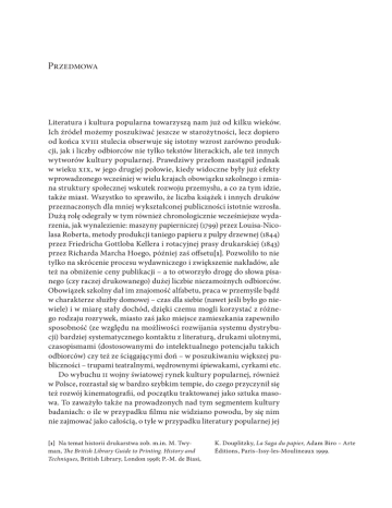 Przedmowa Literatura i kultura popularna towarzyszą nam już od kilku wieków. Ich źródeł możemy poszukiwać jeszcze w starożytności, lecz dopiero od końca XVIII stulecia obserwuje się istotny wzrost zarówno produkcji, jak i liczby odbiorców nie tylko tekstów literackich, ale też innych wytworów kultury popularnej. Prawdziwy przełom nastąpił jednak w wieku XIX, w jego drugiej połowie, kiedy widoczne były już efekty wprowadzonego wcześniej w wielu krajach obowiązku szkolnego i zmiana struktury społecznej wskutek rozwoju przemysłu, a co za tym idzie, także miast. Wszystko to sprawiło, że liczba książek i innych druków przeznaczonych dla mniej wykształconej publiczności istotnie wzrosła. Dużą rolę odegrały w tym również chronologicznie wcześniejsze wydarzenia, jak wynalezienie: maszyny papierniczej (1799) przez Louisa-Nicolasa Roberta, metody produkcji taniego papieru z pulpy drzewnej (1844) przez Friedricha Gottloba Kellera i rotacyjnej prasy drukarskiej (1843) przez Richarda Marcha Hoego, później zaś offsetu[1]. Pozwoliło to nie tylko na skrócenie procesu wydawniczego i zwiększenie nakładów, ale też na obniżenie ceny publikacji – a to otworzyło drogę do słowa pisanego (czy raczej drukowanego) dużej liczbie niezamożnych odbiorców. Obowiązek szkolny dał im znajomość alfabetu, praca w przemyśle bądź w charakterze służby domowej – czas dla siebie (nawet jeśli było go niewiele) i w miarę stały dochód, dzięki czemu mogli korzystać z różnego rodzaju rozrywek, miasto zaś jako miejsce zamieszkania zapewniło sposobność (ze względu na możliwości rozwijania systemu dystrybucji) bardziej systematycznego kontaktu z literaturą, drukami ulotnymi, czasopismami (dostosowanymi do intelektualnego potencjału takich odbiorców) czy też ze ściągającymi doń – w poszukiwaniu większej publiczności – trupami teatralnymi, wędrownymi śpiewakami, cyrkami etc. Do wybuchu II wojny światowej rynek kultury popularnej, również w Polsce, rozrastał się w bardzo szybkim tempie, do czego przyczynił się też rozwój kinematografii, od początku traktowanej jako sztuka masowa. To zaważyło także na prowadzonych nad tym segmentem kultury badaniach: o ile w przypadku filmu nie widziano powodu, by się nim nie zajmować jako całością, o tyle w przypadku literatury popularnej jej [1] Na temat historii drukarstwa zob. m.in. M. Twyman, The British Library Guide to Printing. History and Techniques, British Library, London 1998; P.-M. de Biasi, K. Douplitzky, La Saga du papier, Adam Biro – Arte Éditions, Paris–Issy-les-Moulineaux 1999. 10 anna gemra ekspansji, powstawaniu nowych form gatunkowych, narodzinom kolejnych odmian nie towarzyszyły – zwłaszcza jeśli chodzi o grunt polski – stosowne analizy. Uważano bowiem, że nie są to dzieła warte refleksji naukowej. Liczba prac poświęconych takim tekstom jest więc znikoma, a te, które powstały, najczęściej je dyskredytują, ich autorzy bowiem hołdują przyjętemu z góry założeniu, że wytwory kultury popularnej – z racji swojego adresu odbiorczego, stereotypowości, nastawienia na szybki zysk itd. – są całkowicie pozbawione wartości artystycznej. Sugerowały to również silnie nacechowane, wprost narzucające ocenę tej twórczości nazwy, pod jakimi funkcjonowała ona u krytyków i (bardzo nielicznych) badaczy: literatura straganowa, kramarska, jarmarczna, odpustowa[2], brukowa, tandetna, kuchennych schodów, dla kucharek, służących etc. Przyczyn negatywnego podejścia do literatury i kultury popularnej było od początku wiele. Z pewnością niemały wpływ miała na to sytuacja polityczna – kiedy kraj znajdował się pod zaborami, uważano, iż trzeba pielęgnować przede wszystkim te aspekty polskiej kultury, które uznawano za najwartościowsze. Podobnie po odzyskaniu niepodległości: warstwy wykształcone hołdowały przekonaniu, że odrodzone państwo powinno dbać najpierw o to, co służy rozwojowi potencjału intelektualnego i kulturalnego obywateli. Literatura i kultura popularna nie mieściły się w tym zakresie – nie liczono się zresztą z gustem osób pochodzących z niższych grup społecznych, których edukacja często zatrzymała się na poziomie elementarnym, w przeświadczeniu, że nie ma on żadnego znaczenia dla rozwoju kultury, a wręcz jest dlań szkodliwy. Drugą ważną przyczyną takiego podejścia był brak odpowiedniego warsztatu badawczego: jeśli już w ogóle analizowano (choć jest to najczęściej określenie „na wyrost”) teksty kultury popularnej[3], używano do tego narzędzi stosowanych do tzw. literatury wysokiej: w porównaniu z nią literatura popularna zawsze wypadała bardzo niekorzystnie, uwypukleniu ulegały wszelkie jej wady. Również po II wojnie światowej w Polsce nie prowadzono praktycznie żadnych badań nad literaturą i kulturą popularną aż do początku lat 70. XX wieku. Stało się tak nie tylko z podobnych powodów, dla których nie podejmowano takich prac przed rokiem 1939, ale też z uwagi na politykę kulturalną państwa (dokładniej: partii): zgodnie z nią „lud pracujący miast i wsi” miał czytać odpowiednią literaturę – a w jej zakresie nie mieściły się teksty reprezentujące kulturę popularną. Niechętnie również je wydawano, przynajmniej do „odwilży” po śmierci Stalina; później zresztą też często wstrzymywano druk wielu utworów, jeśli uznano, że są one za mało pożyteczne i mogą niewychowawczo oddziaływać [2] Do dziś w internetowym Słowniku języka polskiego PWN pod hasłem „literatura straganowa” znajduje się informacja: „utwory bez wartości artystycznych”. Zob. http://bit.ly/1ysAOWC [data dostępu: 15 VII 2014]. Cztery pierwsze nazwy niektórzy z badaczy traktują jako synonimiczne; uważają też, że w ich zakresie miesz- czą się inne teksty niż te, które obejmuje pojęcie „literatura brukowa”. Zob. np. J. Duni