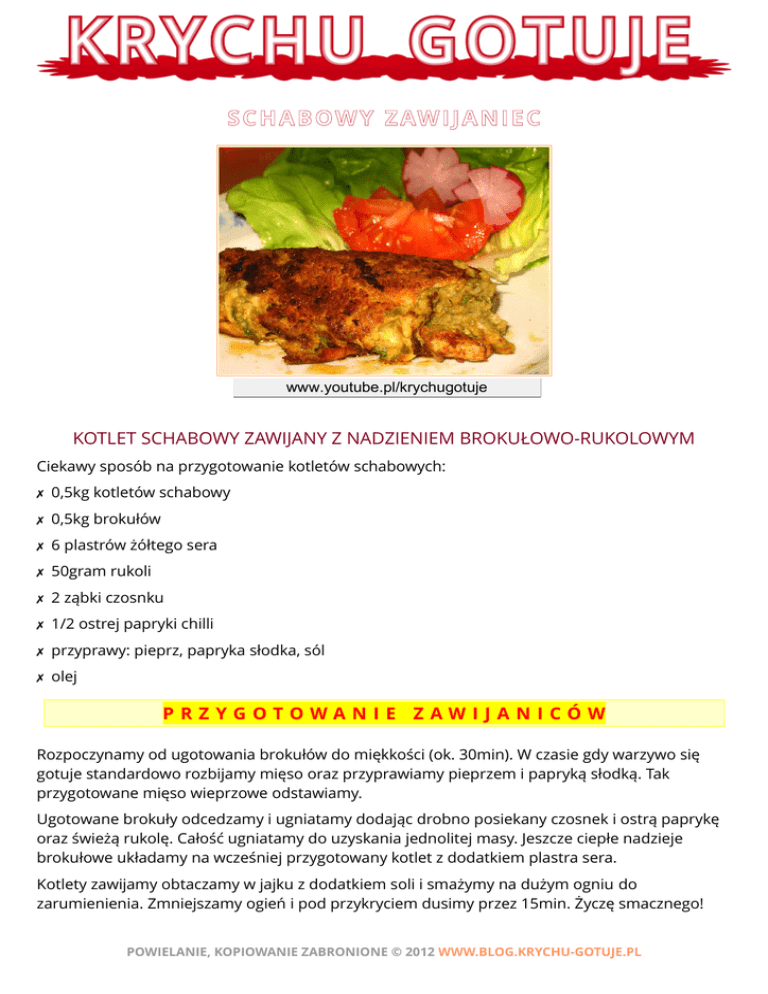 S C H A B O W Y Z AW I J A N I E C www.youtube.pl/krychugotuje KOTLET SCHABOWY ZAWIJANY Z NADZIENIEM BROKUŁOWO-RUKOLOWYM Ciekawy sposób na przygotowanie kotletów schabowych: ✗ 0,5kg kotletów schabowy ✗ 0,5kg brokułów ✗ 6 plastrów żółtego sera ✗ 50gram rukoli ✗ 2 ząbki czosnku ✗ 1/2 ostrej papryki chilli ✗ przyprawy: pieprz, papryka słodka, sól ✗ olej PRZYGOTOWANIE ZAWIJANICÓW Rozpoczynamy od ugotowania brokułów do miękkości (ok. 30min). W czasie gdy warzywo się gotuje standardowo rozbijamy mięso oraz przyprawiamy pieprzem i papryką słodką. Tak przygotowane mięso wieprzowe odstawiamy. Ugotowane brokuły odcedzamy i ugniatamy dodając drobno posiekany czosnek i ostrą paprykę oraz świeżą rukolę. Całość ugniatamy do uzyskania jednolitej masy. Jeszcze ciepłe nadzieje brokułowe układamy na wcześniej przygotowany kotlet z dodatkiem plastra sera. Kotlety zawijamy obtaczamy w jajku z dodatkiem soli i smażymy na dużym ogniu do zarumienienia. Zmniejszamy ogień i pod przykryciem dusimy przez 15min. Życzę smacznego! POWIELANIE, KOPIOWANIE ZABRONIONE © 2012 WWW.BLOG.KRYCHU-GOTUJE.PL