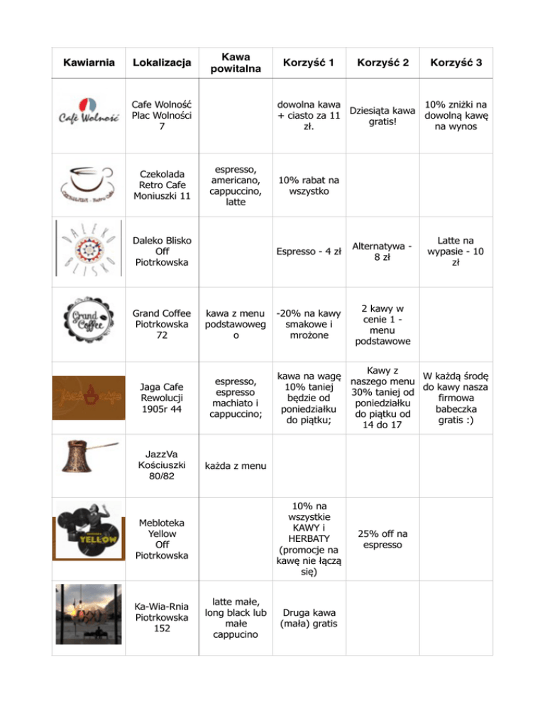 Kawiarnia Lokalizacja Kawa powitalna Cafe Wolność Plac Wolności 7 Czekolada Retro Cafe Moniuszki 11 Korzyść 2 Korzyść 3 dowolna kawa 10% zniżki na Dziesiąta kawa + ciasto za 11 dowolną kawę gratis! zł. na wynos espresso, americano, cappuccino, latte Daleko Blisko Off Piotrkowska Grand Coffee Piotrkowska 72 kawa z menu podstawoweg o Jaga Cafe Rewolucji 1905r 44 espresso, espresso machiato i cappuccino; JazzVa Kościuszki 80/82 każda z menu 10% rabat na wszystko Espresso - 4 zł Alternatywa 8 zł -20% na kawy smakowe i mrożone 2 kawy w cenie 1 menu podstawowe latte małe, long black lub małe cappucino Latte na wypasie - 10 zł Kawy z kawa na wagę W każdą środę naszego menu 10% taniej do kawy nasza 30% taniej od będzie od firmowa poniedziałku poniedziałku babeczka do piątku od do piątku; gratis :) 14 do 17 10% na wszystkie KAWY i HERBATY (promocje na kawę nie łączą się) Mebloteka Yellow Off Piotrkowska Ka-Wia-Rnia Piotrkowska 152 Korzyść 1 Druga kawa (mała) gratis 25% off na espresso Kawiarnia Lokalizacja Kawa powitalna Mozaika Cafe Władysława Króla 31 Niebostan Piotrkowska 17 Pracownia Kreatoora Przędzalniana 63 Tubajka Plac Zwycięstwa 3 Korzyść 1 Korzyść 2 Każda druga kawa gratis 30% na ciasta i gofry wszystkie kawy i ciasta 20% rabatu 20% rabatu na wszystkie grafiki i obrazy Ewy Żochowskiej. Korzyść 3 Cappucino, Americano lub espresso espresso lub americano biała/czarna 10% off na stoiskach happy hours - "Dżem Dobry", kawa 50 % off ciasto do kawy "Niezłe jaja", pn-pt z menu gratis, pn-pt "Tubajka", "Bon podstawoweg 18.00-20.00 / Apetit" podczas sobotnich o 19.00-21.00 "Parków (w maju ) Śniadaniowych” .