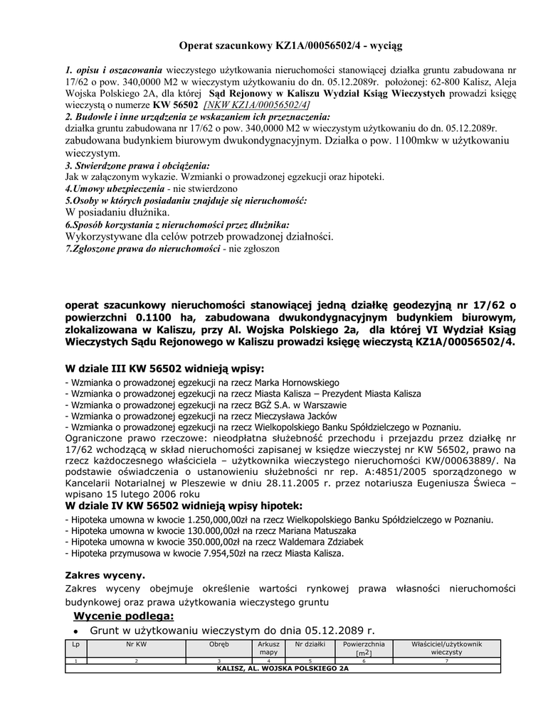 Operat szacunkowy KZ1A/00056502/4 - wyciąg 1. opisu i oszacowania wieczystego użytkowania nieruchomości stanowiącej działka gruntu zabudowana nr 17/62 o pow. 340,0000 M2 w wieczystym użytkowaniu do dn. 05.12.2089r. położonej: 62-800 Kalisz, Aleja Wojska Polskiego 2A, dla której Sąd Rejonowy w Kaliszu Wydział Ksiąg Wieczystych prowadzi księgę wieczystą o numerze KW 56502 [NKW KZ1A/00056502/4] 2. Budowle i inne urządzenia ze wskazaniem ich przeznaczenia: działka gruntu zabudowana nr 17/62 o pow. 340,0000 M2 w wieczystym użytkowaniu do dn. 05.12.2089r. zabudowana budynkiem biurowym dwukondygnacyjnym. Działka o pow. 1100mkw w użytkowaniu wieczystym. 3. Stwierdzone prawa i obciążenia: Jak w załączonym wykazie. Wzmianki o prowadzonej egzekucji oraz hipoteki. 4.Umowy ubezpieczenia - nie stwierdzono 5.Osoby w których posiadaniu znajduje się nieruchomość: W posiadaniu dłużnika. 6.Sposób korzystania z nieruchomości przez dłużnika: Wykorzystywane dla celów potrzeb prowadzonej działności. 7.Zgłoszone prawa do nieruchomości - nie zgłoszon operat szacunkowy nieruchomości stanowiącej jedną działkę geodezyjną nr 17/62 o powierzchni 0.1100 ha, zabudowana dwukondygnacyjnym budynkiem biurowym, zlokalizowana w Kaliszu, przy Al. Wojska Polskiego 2a, dla której VI Wydział Ksiąg Wieczystych Sądu Rejonowego w Kaliszu prowadzi księgę wieczystą KZ1A/00056502/4. W dziale III KW 56502 widnieją wpisy: - Wzmianka o prowadzonej egzekucji na rzecz Marka Hornowskiego - Wzmianka o prowadzonej egzekucji na rzecz Miasta Kalisza – Prezydent Miasta Kalisza - Wzmianka o prowadzonej egzekucji na rzecz BGŻ S.A. w Warszawie - Wzmianka o prowadzonej egzekucji na rzecz Mieczysława Jacków - Wzmianka o prowadzonej egzekucji na rzecz Wielkopolskiego Banku Spółdzielczego w Poznaniu. Ograniczone prawo rzeczowe: nieodpłatna służebność przechodu i przejazdu przez działkę nr 17/62 wchodzącą w skład nieruchomości zapisanej w księdze wieczystej nr KW 56502, prawo na rzecz każdoczesnego właściciela – użytkownika wieczystego nieruchomości KW/00063889/. Na podstawie oświadczenia o ustanowieniu służebności nr rep. A:4851/2005 sporządzonego w Kancelarii Notarialnej w Pleszewie w dniu 28.11.2005 r. przez notariusza Eugeniusza Świeca – wpisano 15 lutego 2006 roku W dziale IV KW 56502 widnieją wpisy hipotek: - Hipoteka Hipoteka Hipoteka Hipoteka umowna w kwocie 1.250,000,00zł na rzecz Wielkopolskiego Banku Spółdzielczego w Poznaniu. umowna w kwocie 130.000,00zł na rzecz Mariana Matuszaka umowna w kwocie 350.000,00zł na rzecz Waldemara Zdziabek przymusowa w kwocie 7.954,50zł na rzecz Miasta Kalisza. Zakres wyceny. Zakres wyceny obejmuje określenie wartości rynkowej budynkowej oraz prawa użytkowania wieczystego gruntu prawa własności nieruchomości Wycenie podlega: Grunt w użytkowaniu wieczystym do dnia 05.12.2089 r. Lp Nr KW 1 2 Obręb Arkusz mapy Nr działki Powierzchnia [m2] Właściciel/użytkownik wieczysty 3 4 5 6 7 KALISZ, AL. WOJSKA POLSKIEGO 2A 1. KZ1A/00056502/4 77 DOBRZEC 1 17/62 SKARB PAŃSTWA/ Zamysłowski Eugeniusz 1 100 Razem: 1 100 Budynki: budynek biurowy, dwukondygnacyjny o p.u. 270,02 m2 Wycena uwzględnia również, w sposób pośredni, budowle i instalacje oraz inne urządzenia trwale związane z gruntem nieruchomości (utwardzenia terenu, małą architekturę ogrodową, instalacje i przyłącza) oraz wyposażenie ww. budynków w instalacje i urządzenia trwale z nim związane (instalacje wewnętrzne, urządzenia sanitarne itp.). 1 opłata roczna z tytułu użytkowania wieczystego przedmiotowego gruntu wynosi 4.704,15.zł (zał. nr 2 do operatu) 2 służebność obciążająca wycenianą nieruchomości jest niewykonywana. Nieruchomość na rzecz której ustanowiono służebność ma dostęp do drogi – ulicy Biskupickiej. Oznaczenie nieruchomości według wpisu do rejestru gruntów: Jednostka ewidencyjna: 306101_1 M. Kalisz Obręb: 0077, 077 Dobrzec Powierzchnia: 0.1100 ha Właściciel: 1/1 Skarb Państwa Użytkownik wieczysty: 1/1 Zamysłowski Eugeniusz GRUNTY: Ark mapy Numer działki Bliższe określenie położenia Oznaczenie uż. i kont. klasyf. 1 17/62 Al. Wojska Polskiego 2a Bi Powierzchnia użytk. w ha 0.1100 działki w ha 0.1100 Nr księgi wieczystej KZ1A/00056502 0810 Bi BUDYNKI: Nr ewid . bud. 1 Oznacz. działek ewid. na których położony jest budynek 0077-17/62 Adres budynku Al. Wojska Polskiego 2a Funkcja budynku biurow e Liczba lokali odrę bn. inny ch 0 0 Pow. użytkowa pom. lokali przyn . 0.00 0.00 Powierzchnia zabudowy budynku w m2 Liczba kondygnac ji nad/podzi emnych 173.00 2/0 Stwierdzono zgodność zapisów pomiędzy księgą wieczystą i rejestrem gruntów, w zakresie podstawowych danych. Opis nieruchomości z uwzględnieniem stanu technicznego i użytkowego. Lokalizacja, otoczenie i sąsiedztwo. LOKALIZACJA W OBRĘBIE WOJEWÓDZTWA. Kalisz jest miastem położonym w południowo-wschodniej części województwa wielkopolskiego, nad rzeką Prosną, w strefie wpływów trzech dużych ośrodków miejskich: Poznania, Łodzi i Wrocławia, z którymi posiada zadowalające połączenia komunikacyjne, kolejowe i autobusowe. W latach 1975-1998 był siedzibą województwa kaliskiego, obecnie jest miastem na prawach powiatu i siedzibą powiatu kaliskiego ziemskiego. Drugie pod względem wielkości miasto województwa wielkopolskiego i jedno z większych miast w Polsce (37 miejsce w 2004 pod względem liczby ludności i 35 miejsce w 2004 pod względem powierzchni). Współtworzy, wraz z Ostrowem Wielkopolskim i zespołem Skalmierzyc, konurbację i okręg przemysłowy. Powierzchnia miasta wynosi 69,8km2, którą zamieszkuje ok. 107 tys. mieszkańców. LOKALIZACJA W OBRĘBIE MIASTA Przedmiotowa nieruchomość położona jest w zachodniej części miasta, przy Alei Wojska Polskiego, w strefie skupiającej tereny o funkcji handlowo-usługowej (handel wielkopowierzchniowy). Aleja Wojska Polskiego to jedna z najważniejszych, 